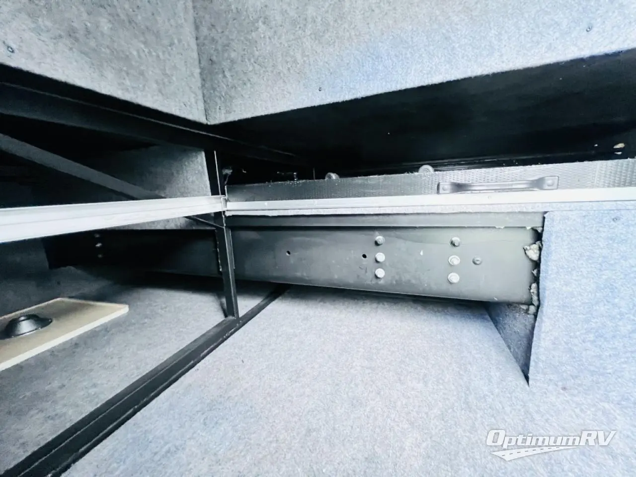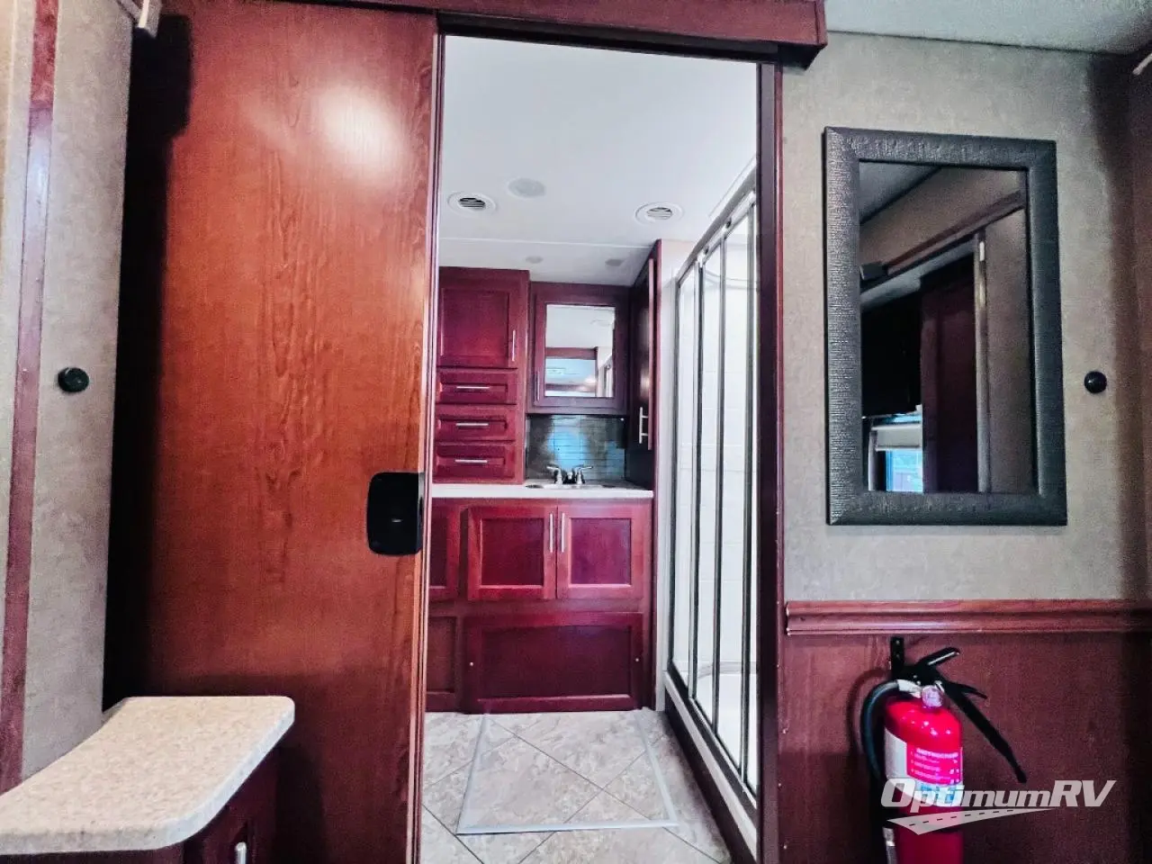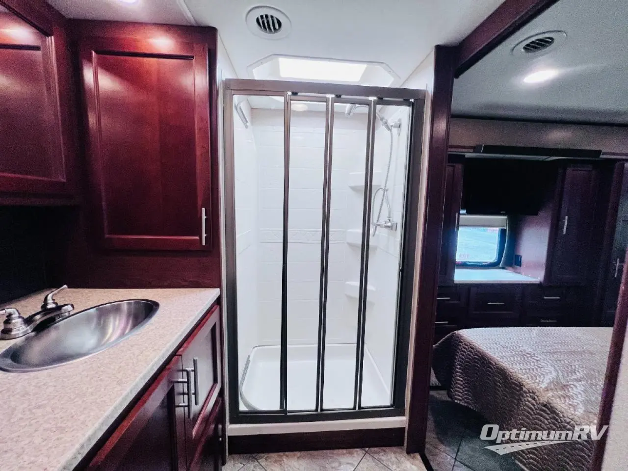 The bedroom also offers a queen bed slide. The master bath is quite spacious with a toilet, two sinks, linen closet, and shower.