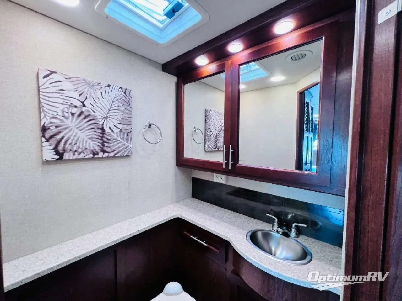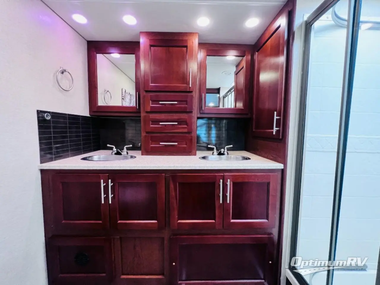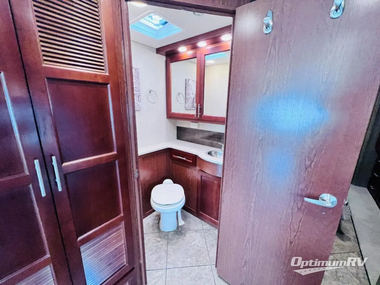 The bedroom also offers a queen bed slide. The master bath is quite spacious with a toilet, two sinks, linen closet, and shower.