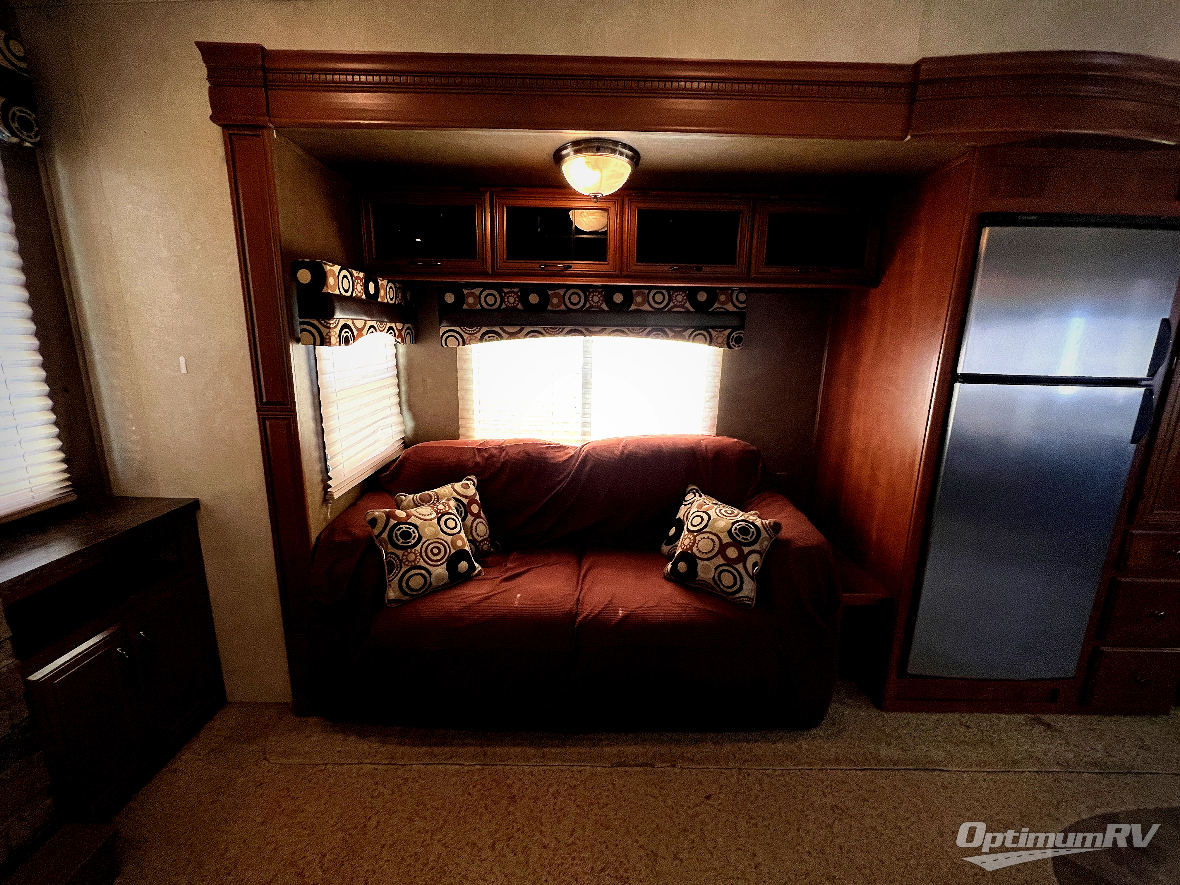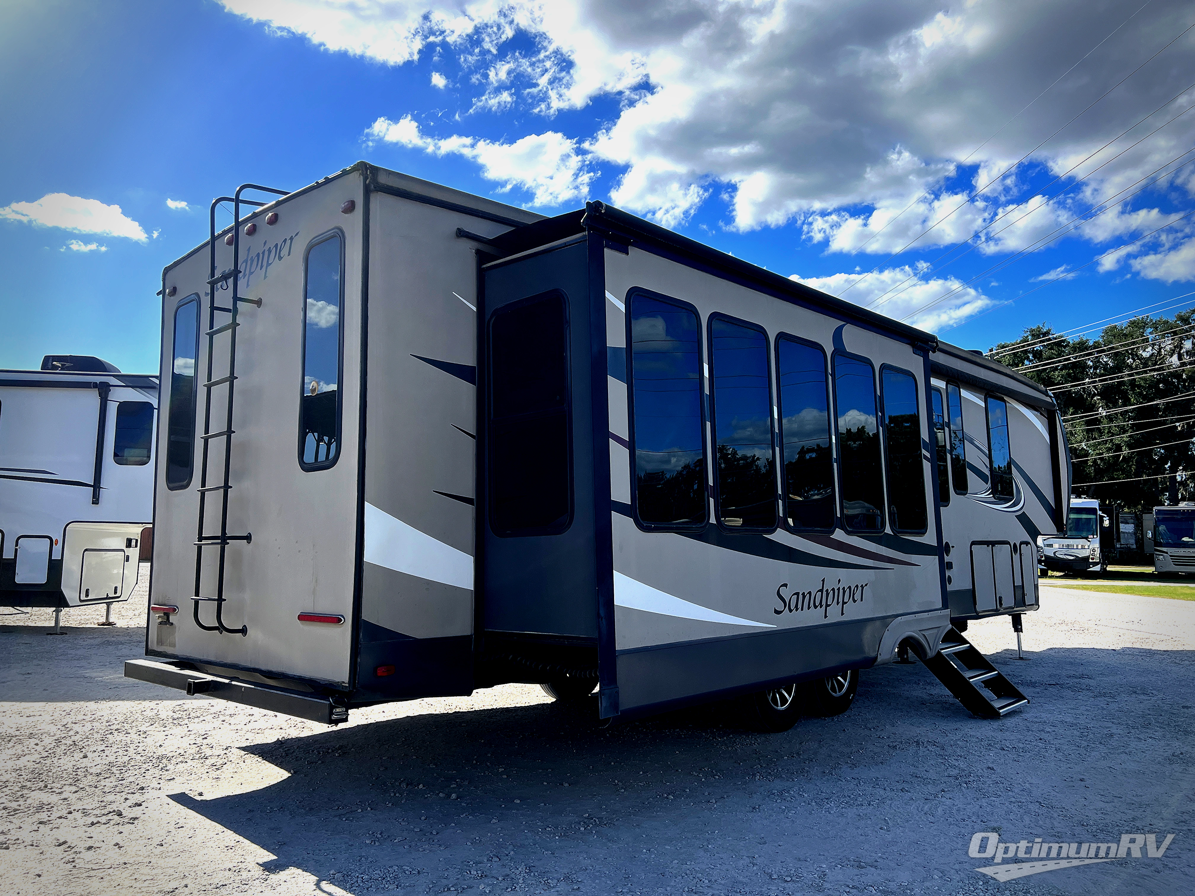 The Sandpiper 346RETS fifth wheel by Forest River offers a rear entertainment center and triple slides.