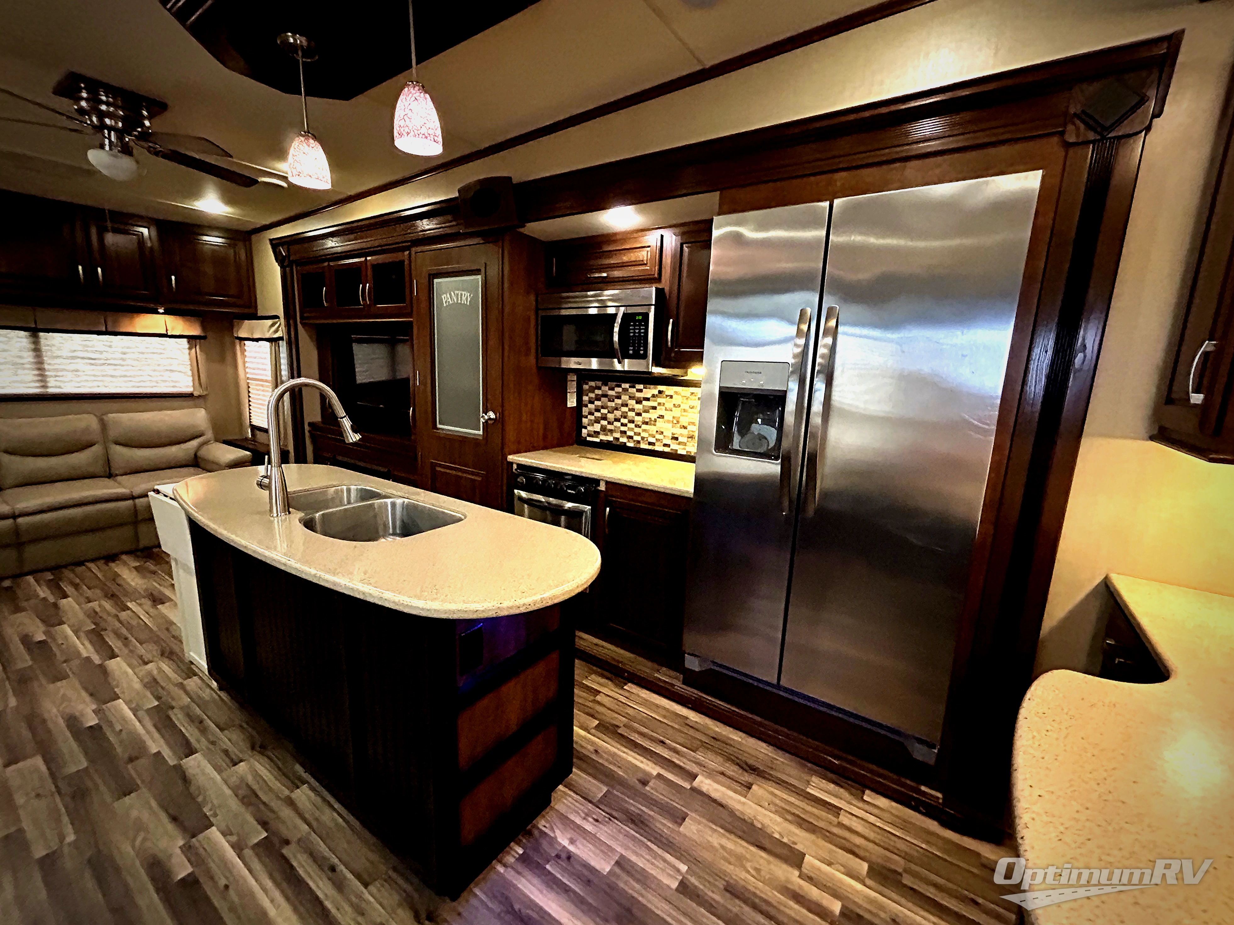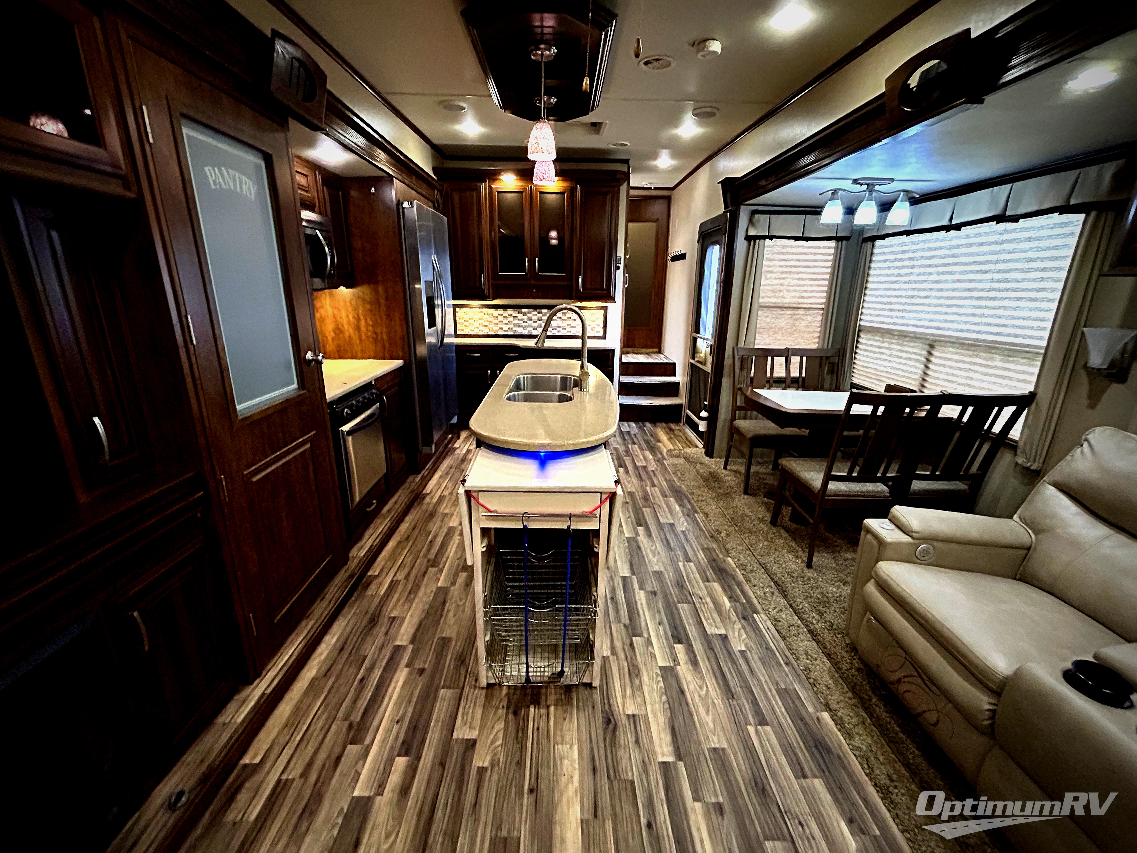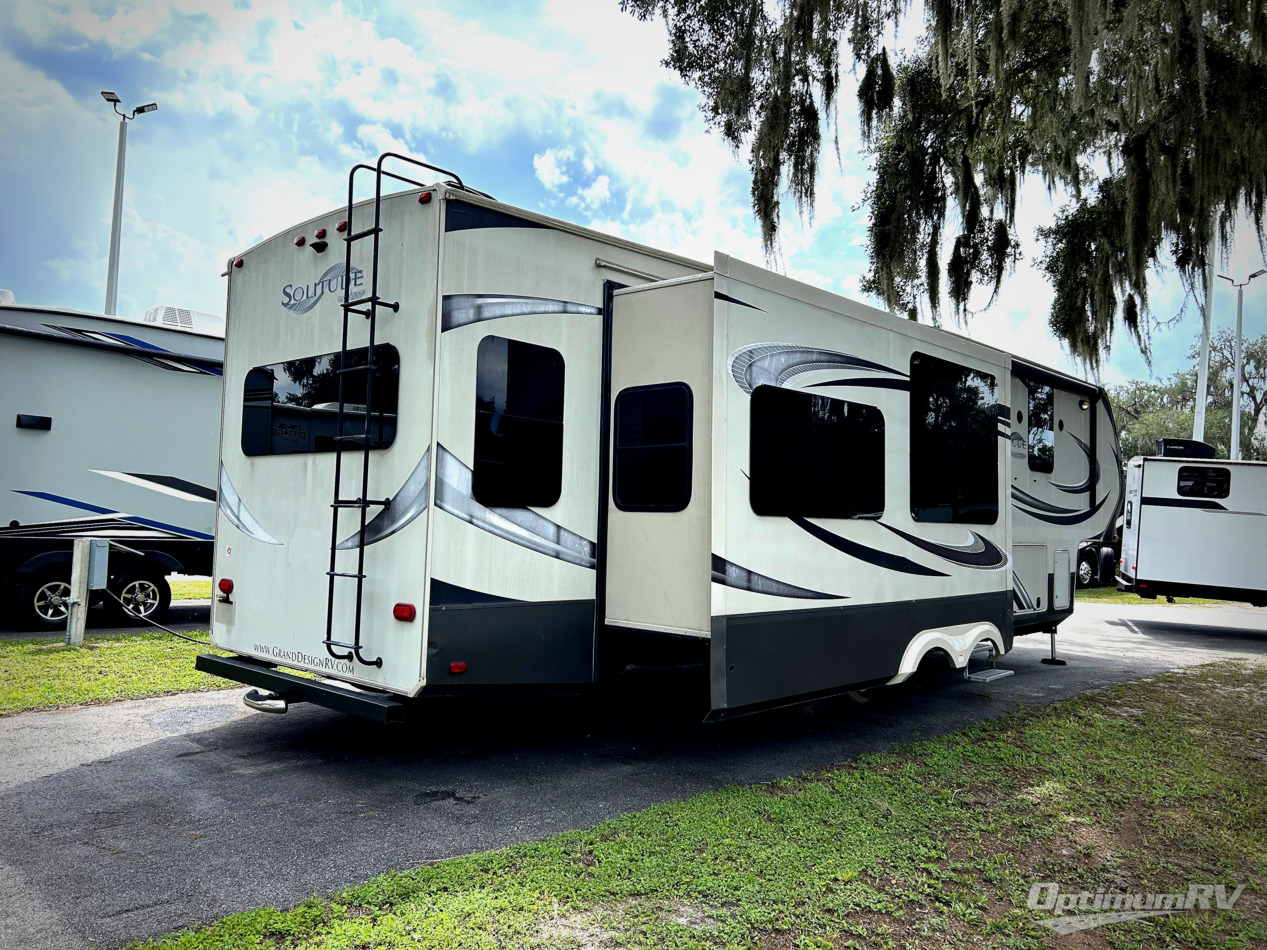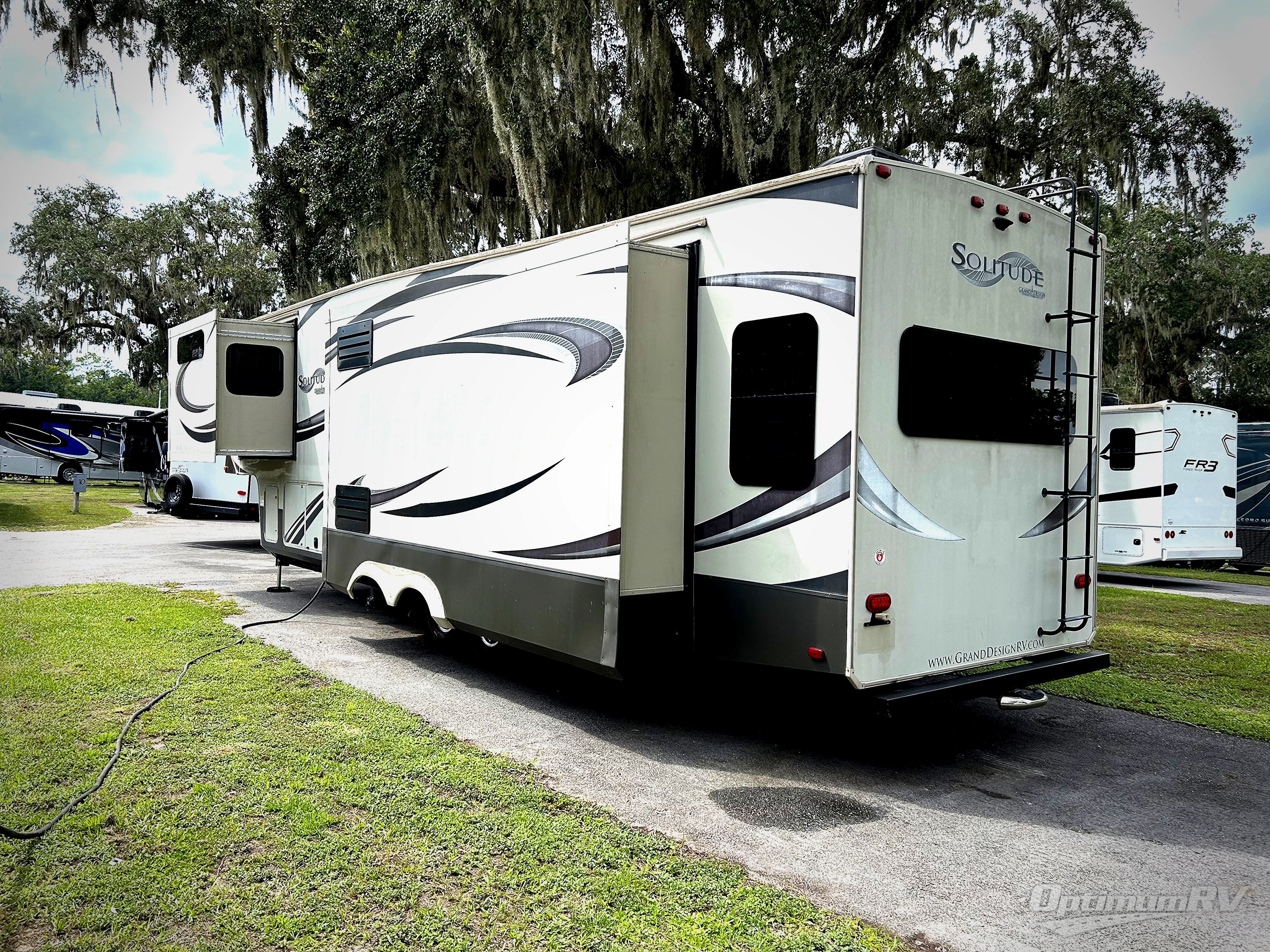 Enter this Solitude fifth wheel 369RL by Grand Design and be amazed at the wide open space you see with dual opposing slides in the combined kitchen and living area.