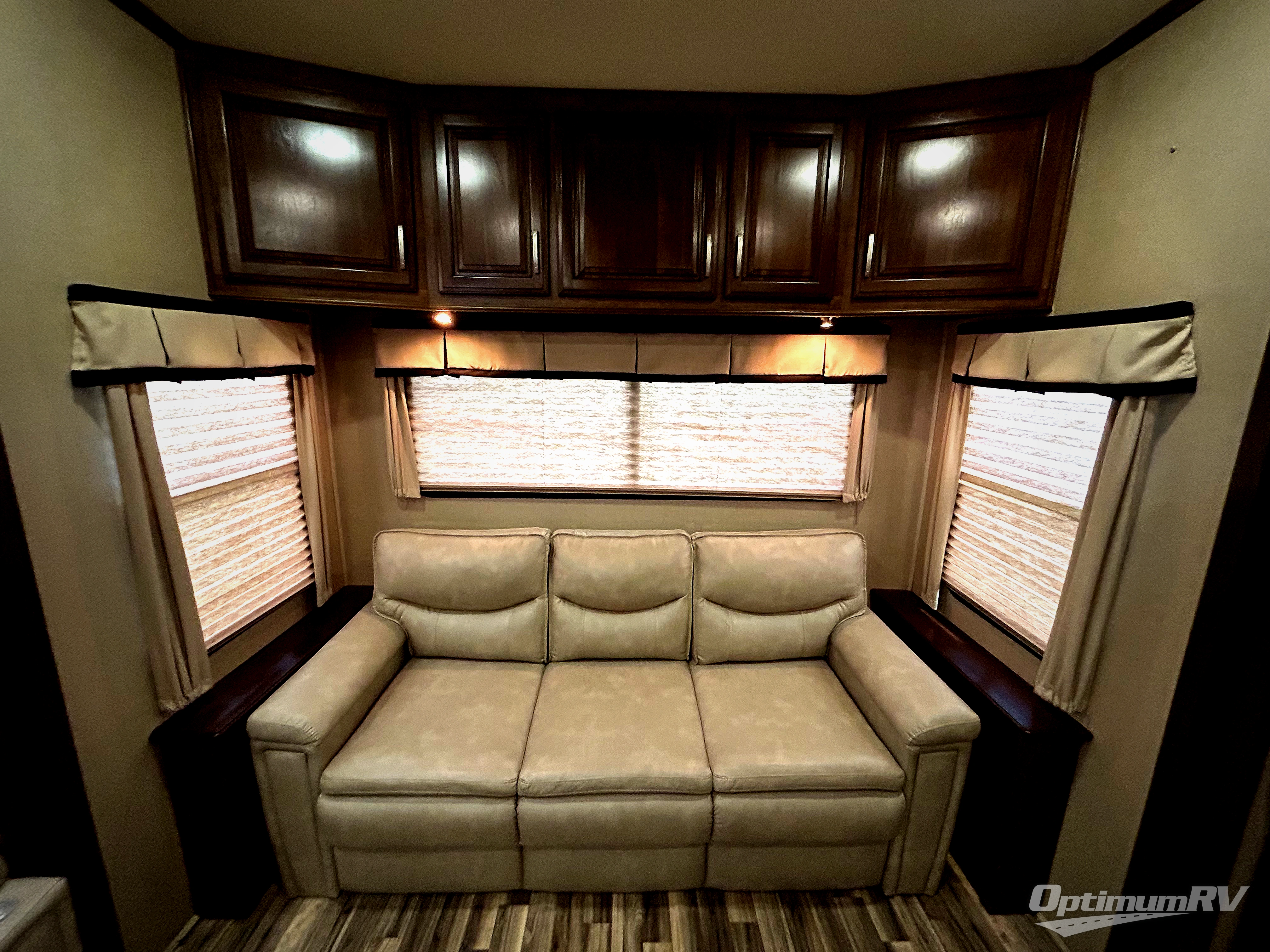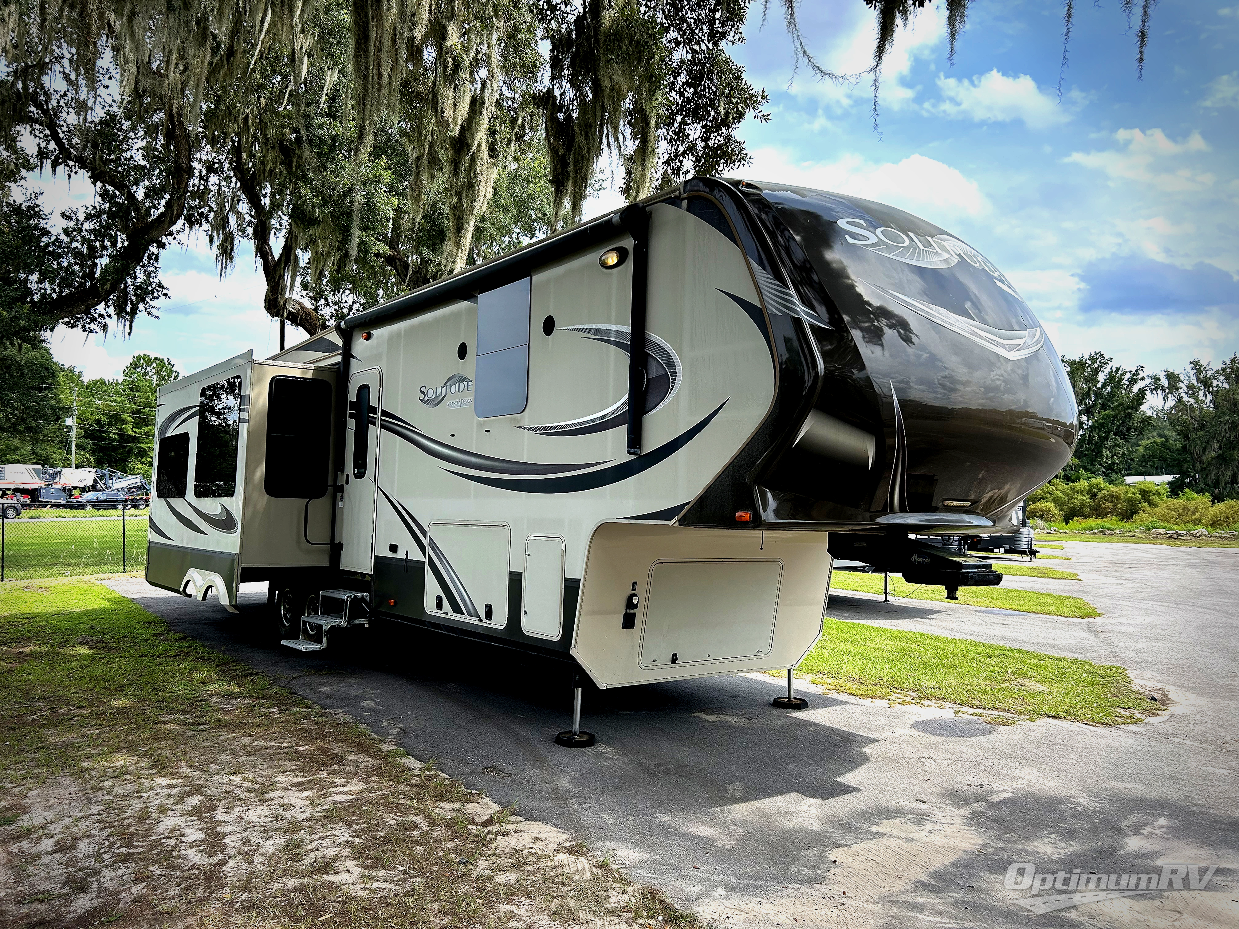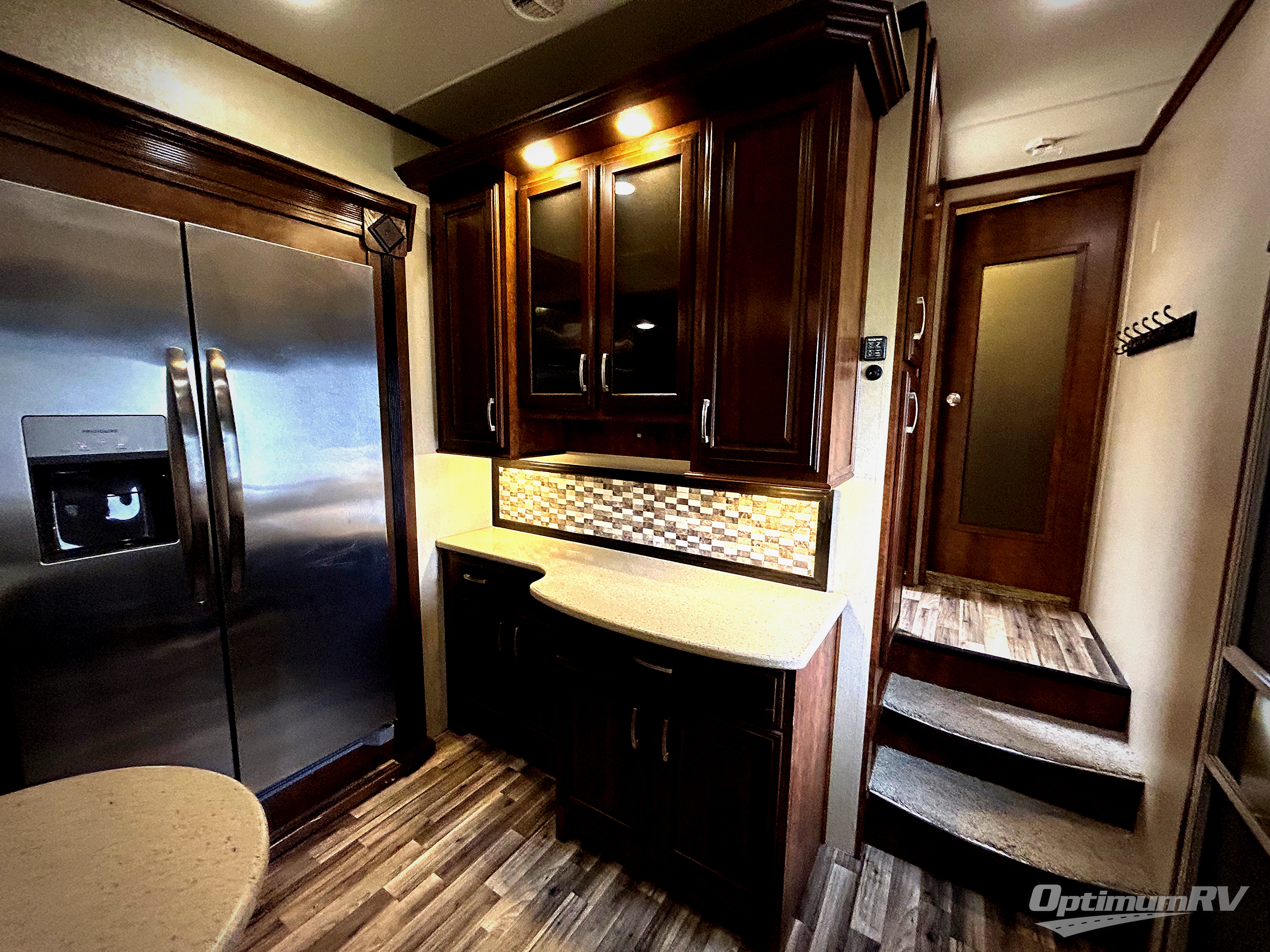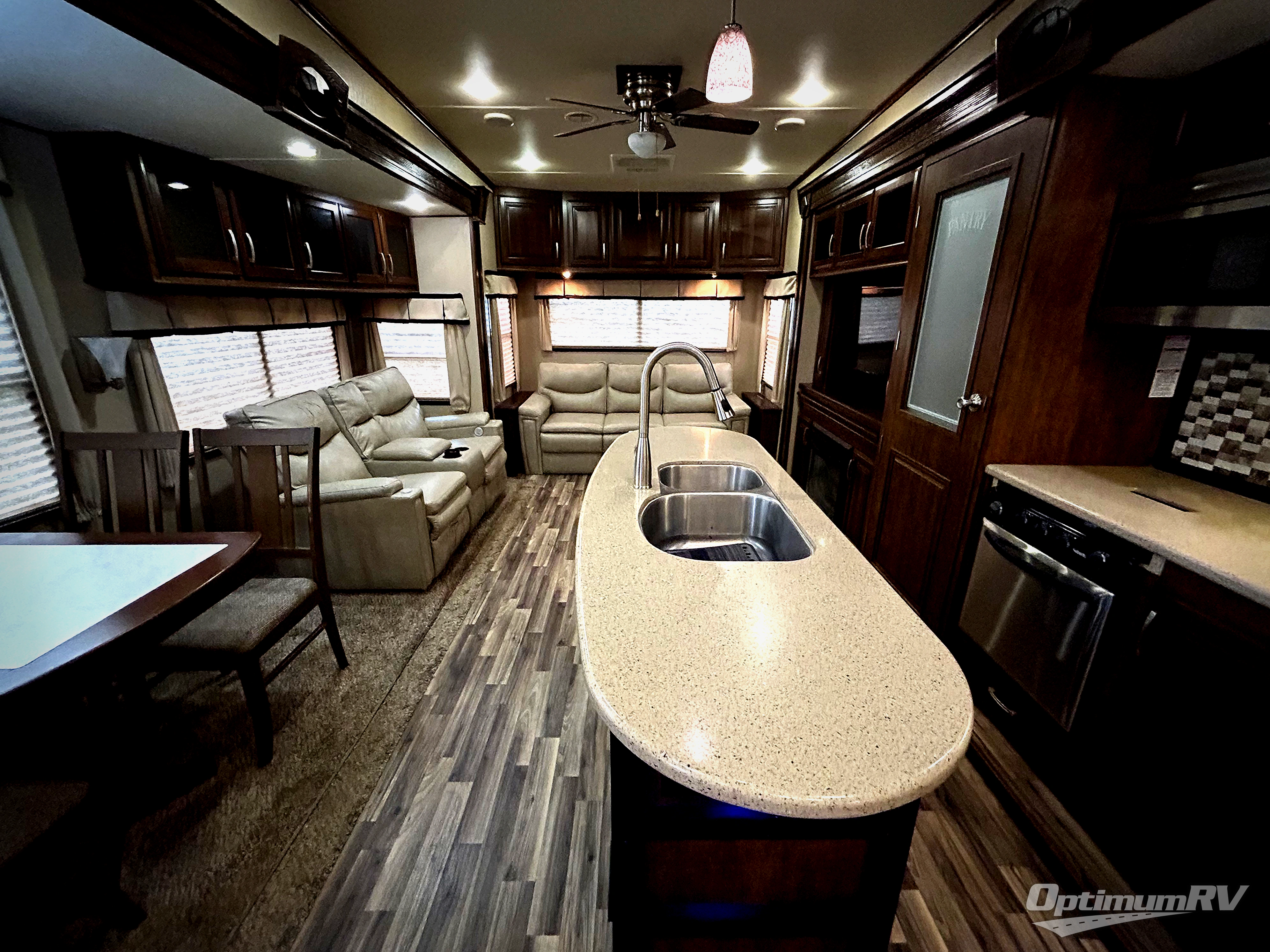 Enter this Solitude fifth wheel 369RL by Grand Design and be amazed at the wide open space you see with dual opposing slides in the combined kitchen and living area.