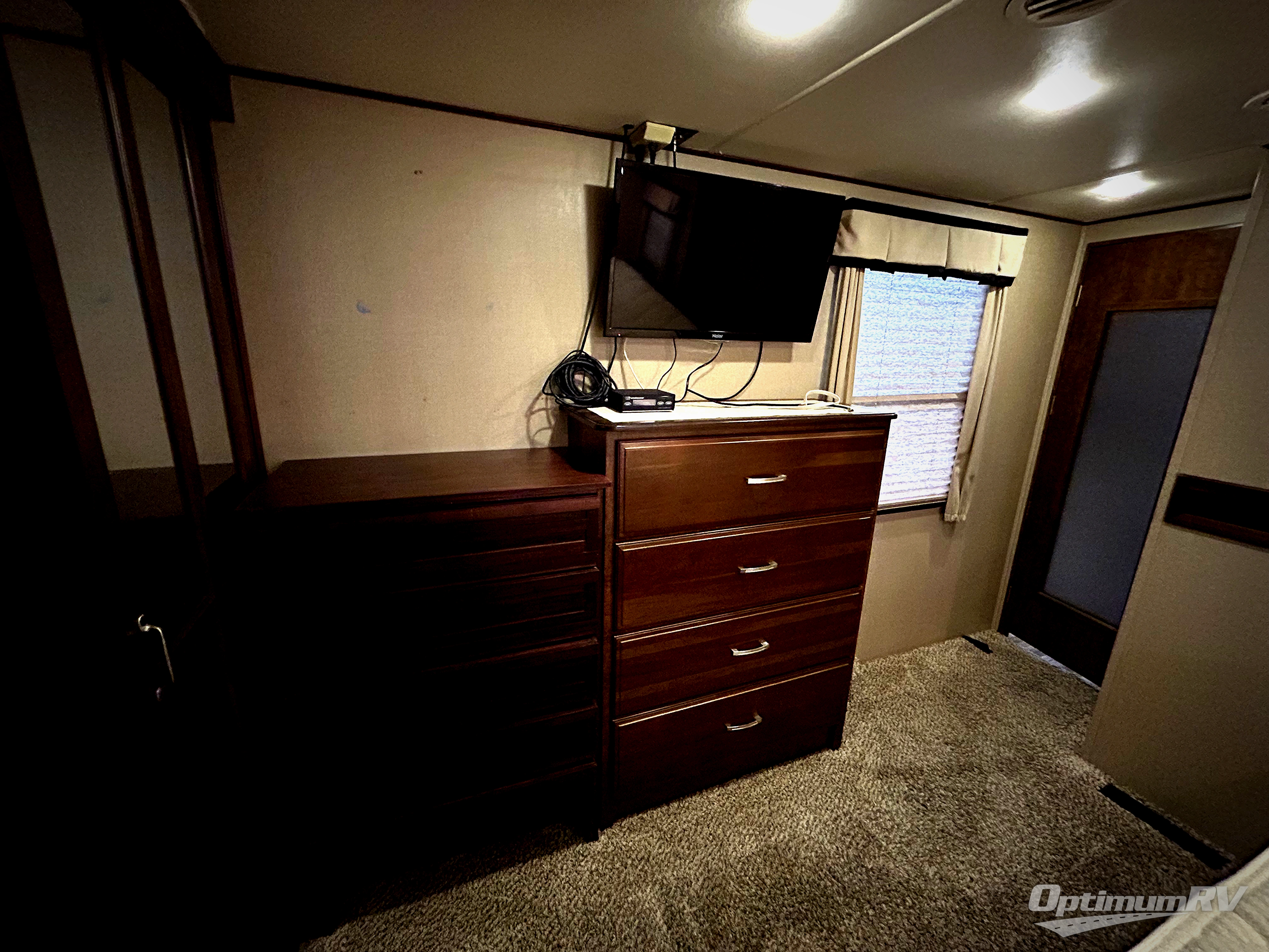 Enjoy a sofa along the rear wall featuring overhead cabinets and end tables. The entertainment center is located in the opposite slide featuring an LED TV with fireplace below and slide-out desk with drawers also. Along with the entertainment center there is also a large pantry for storing dry goods, a three burner range, counter space, and refrigerator. You may choose to add a larger side-by-side refrigerator if you like. The convenient kitchen island provides a bit more counter space and dual sinks making cleanup and food prep a breeze.