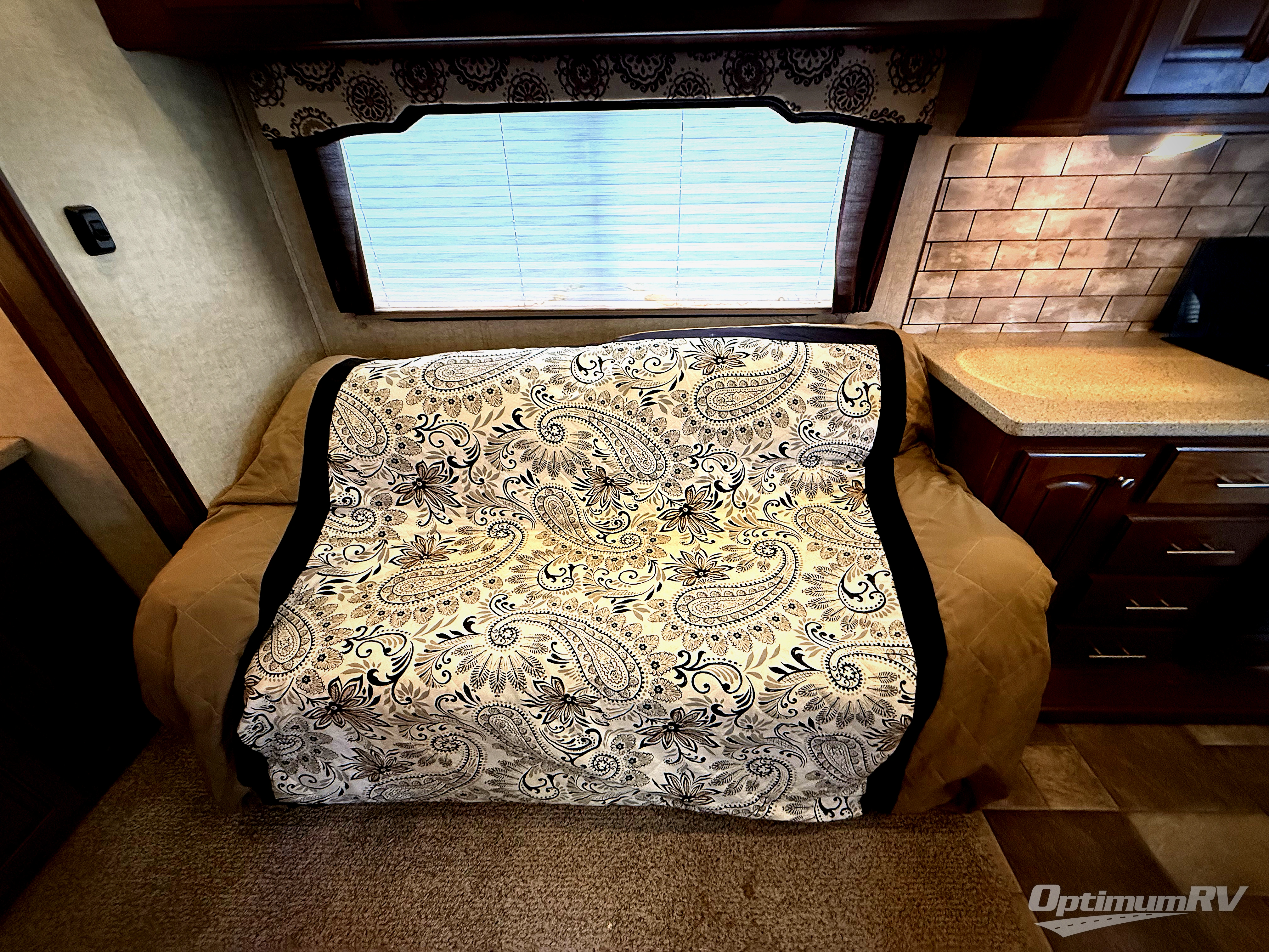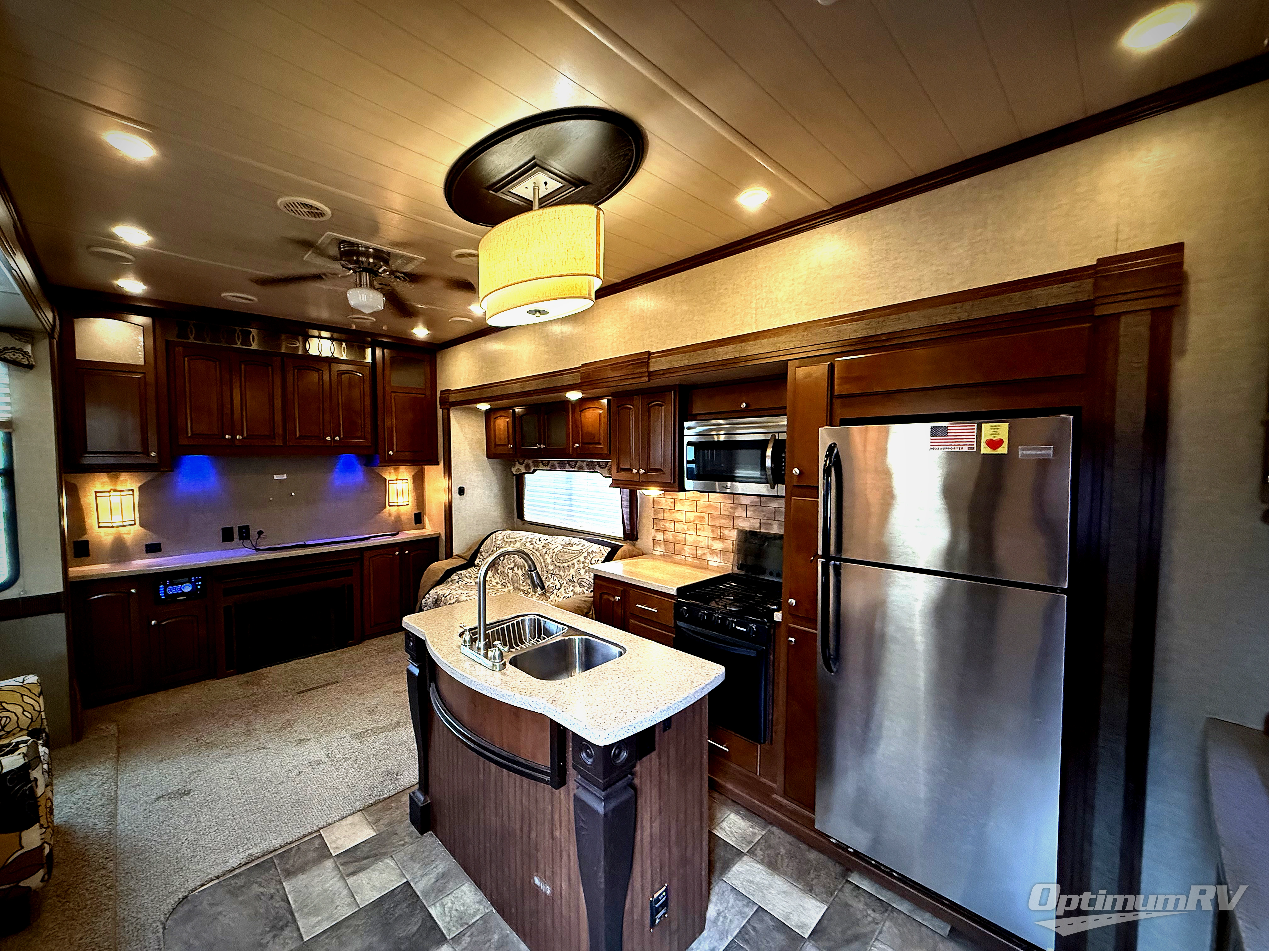 Along the rear wall enjoy a full wall entertainment center with optional fireplace below the TV area, plus overhead and side storage cabinets.
