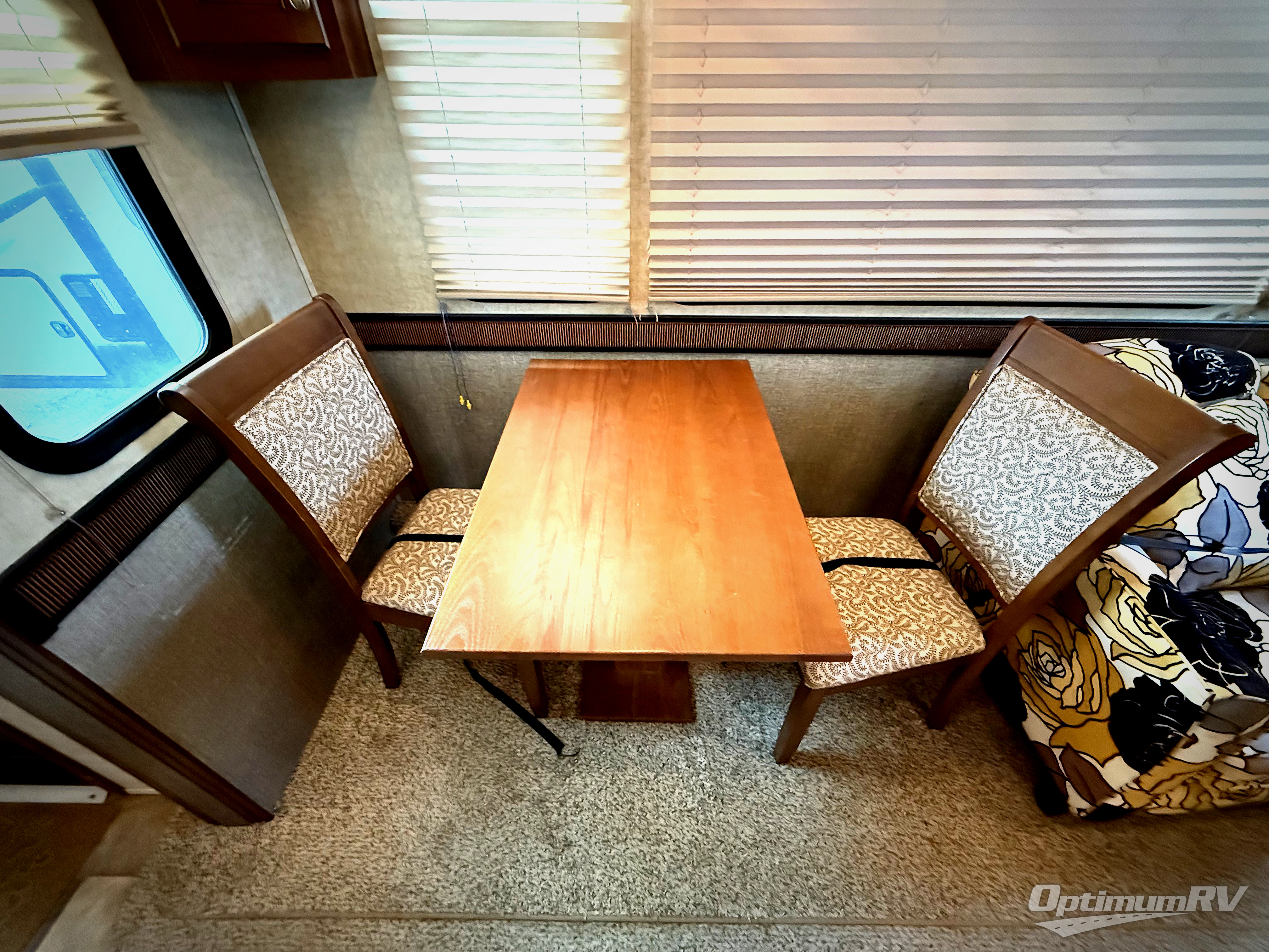 Step inside and notice how open the interior is with dual opposing slides in the main combined kitchen and living area. There is a dining table with four chairs and two lounge chairs in a slide out on the left.
