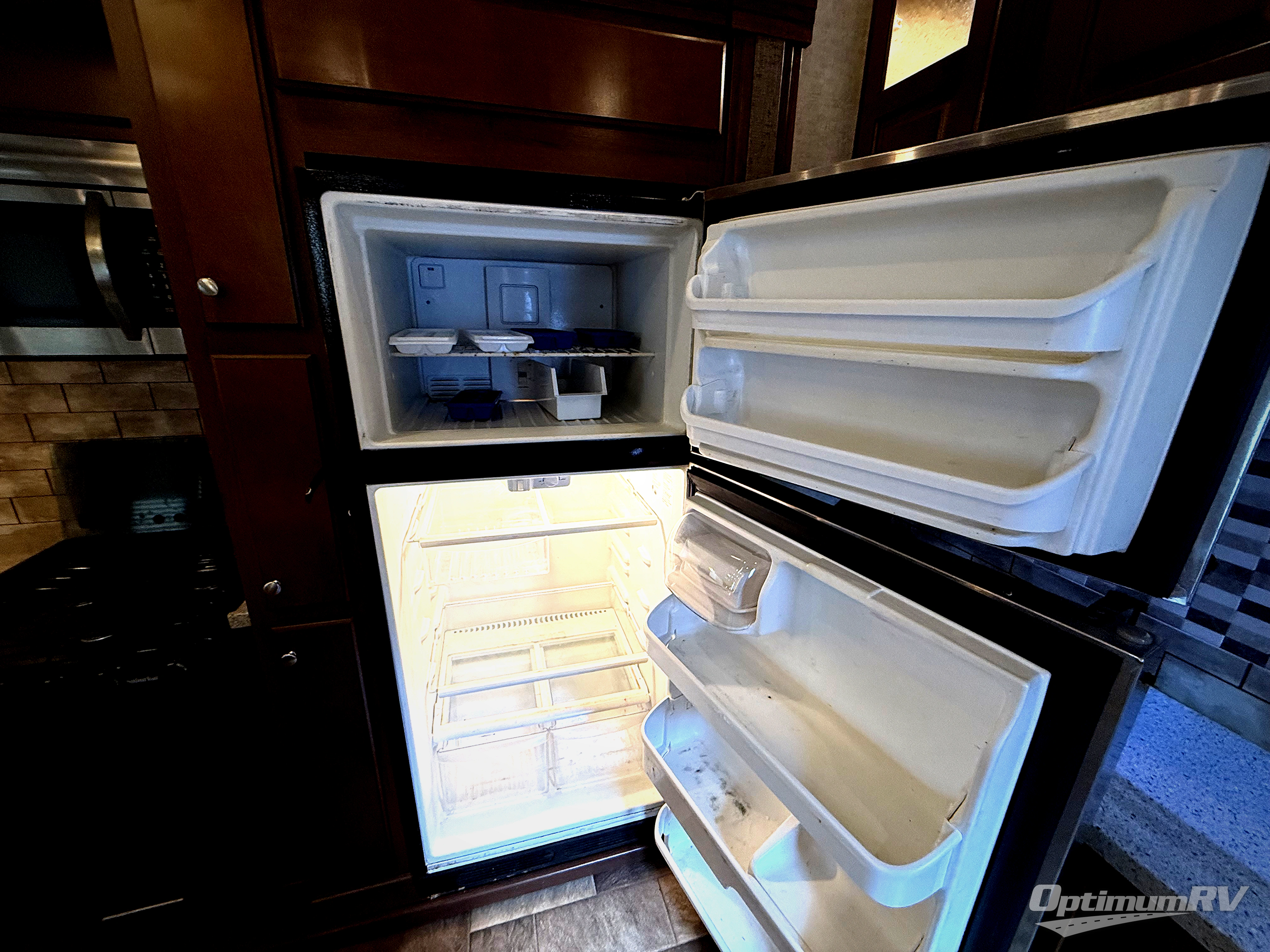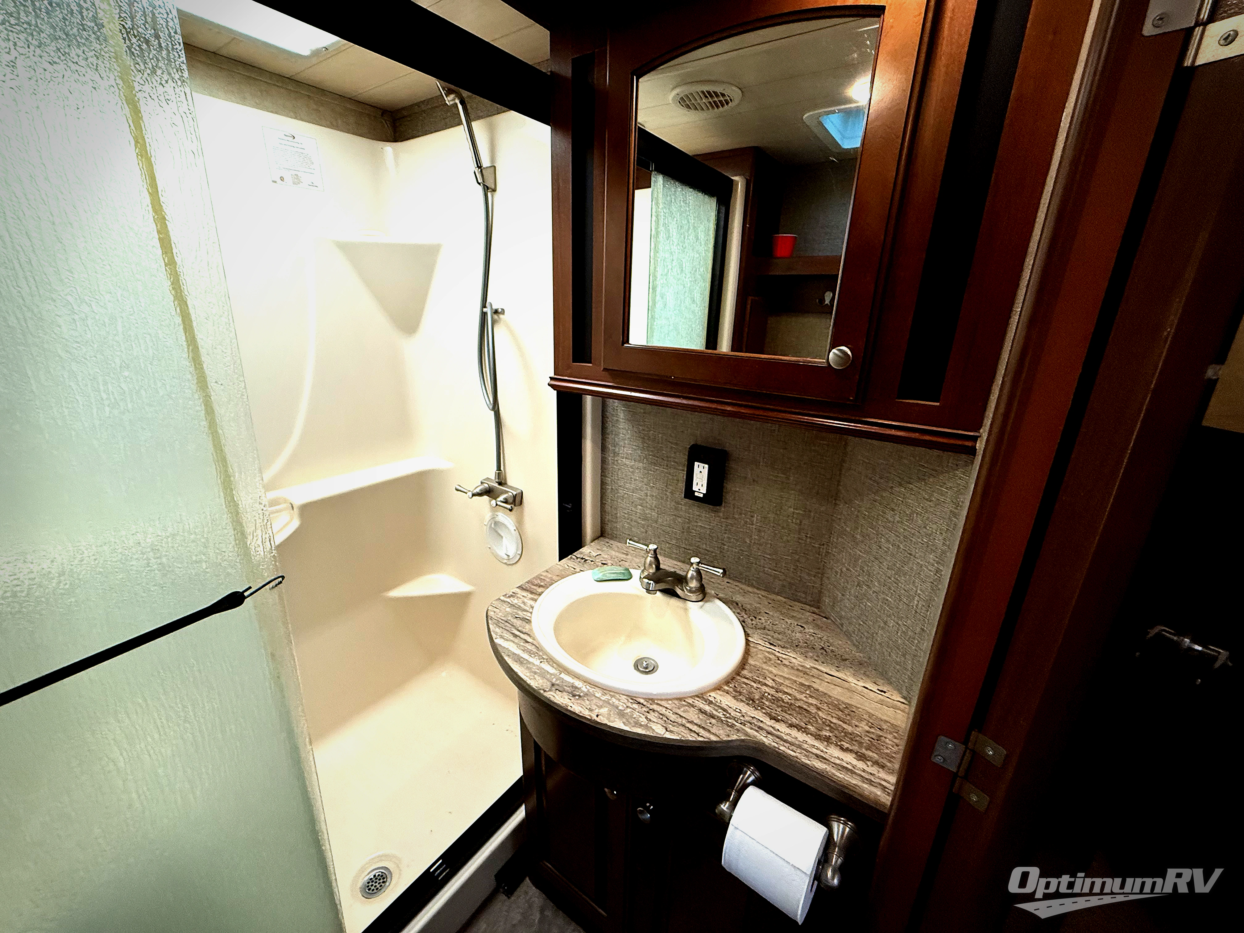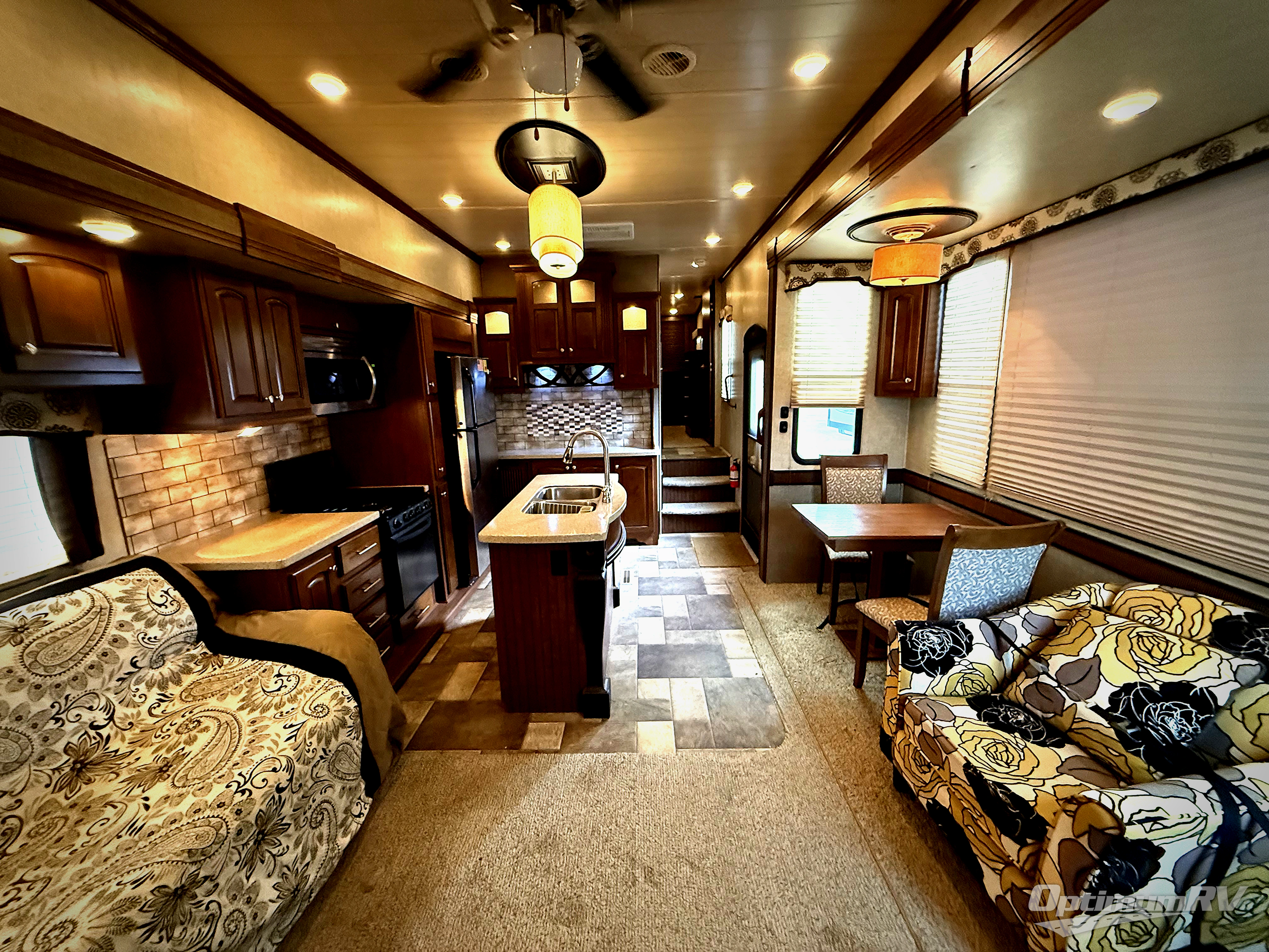 This Heartland Oakmont fifth wheel 325RE features a rear entertainment layout, triple slides, and a king size bed.