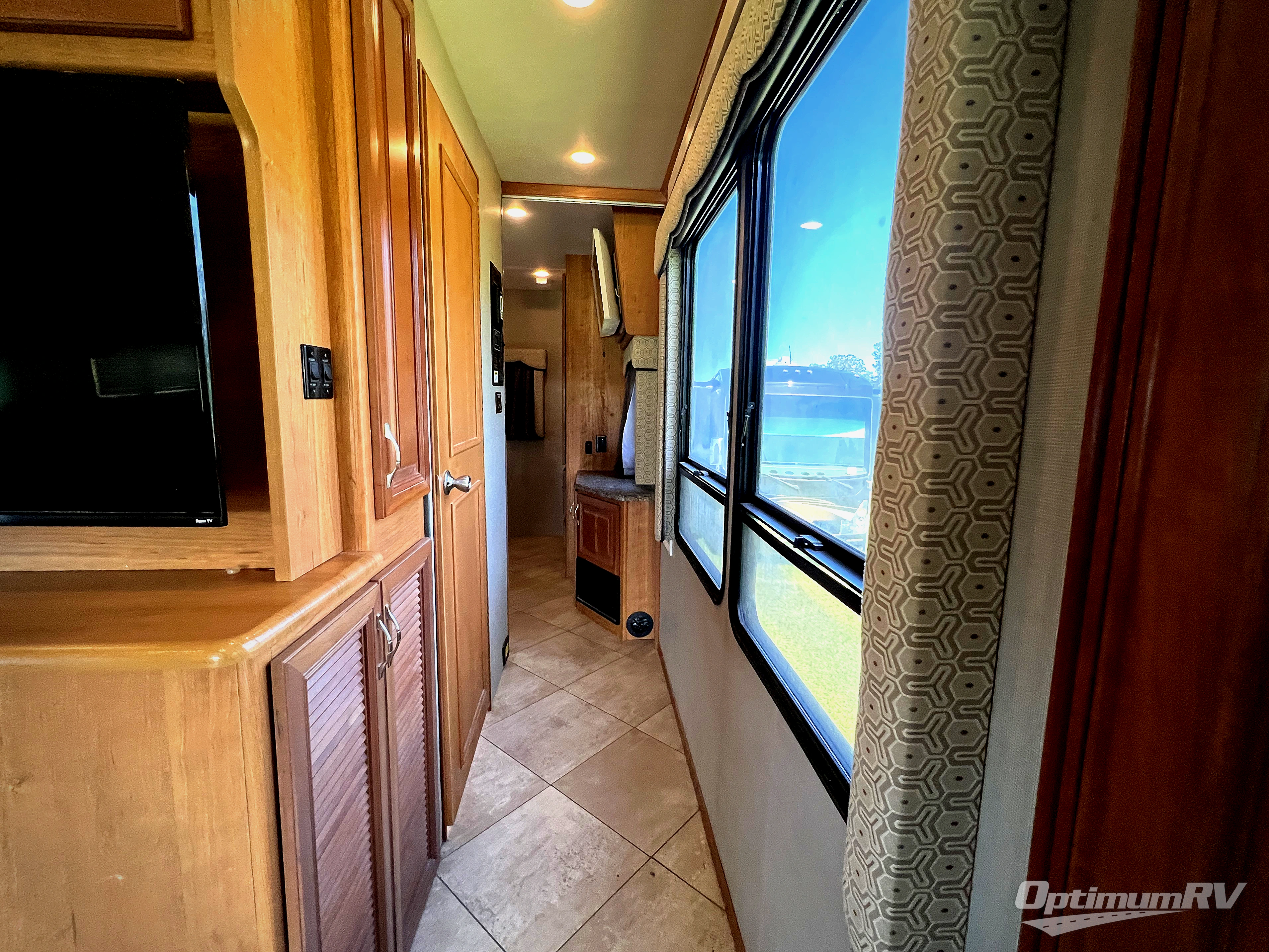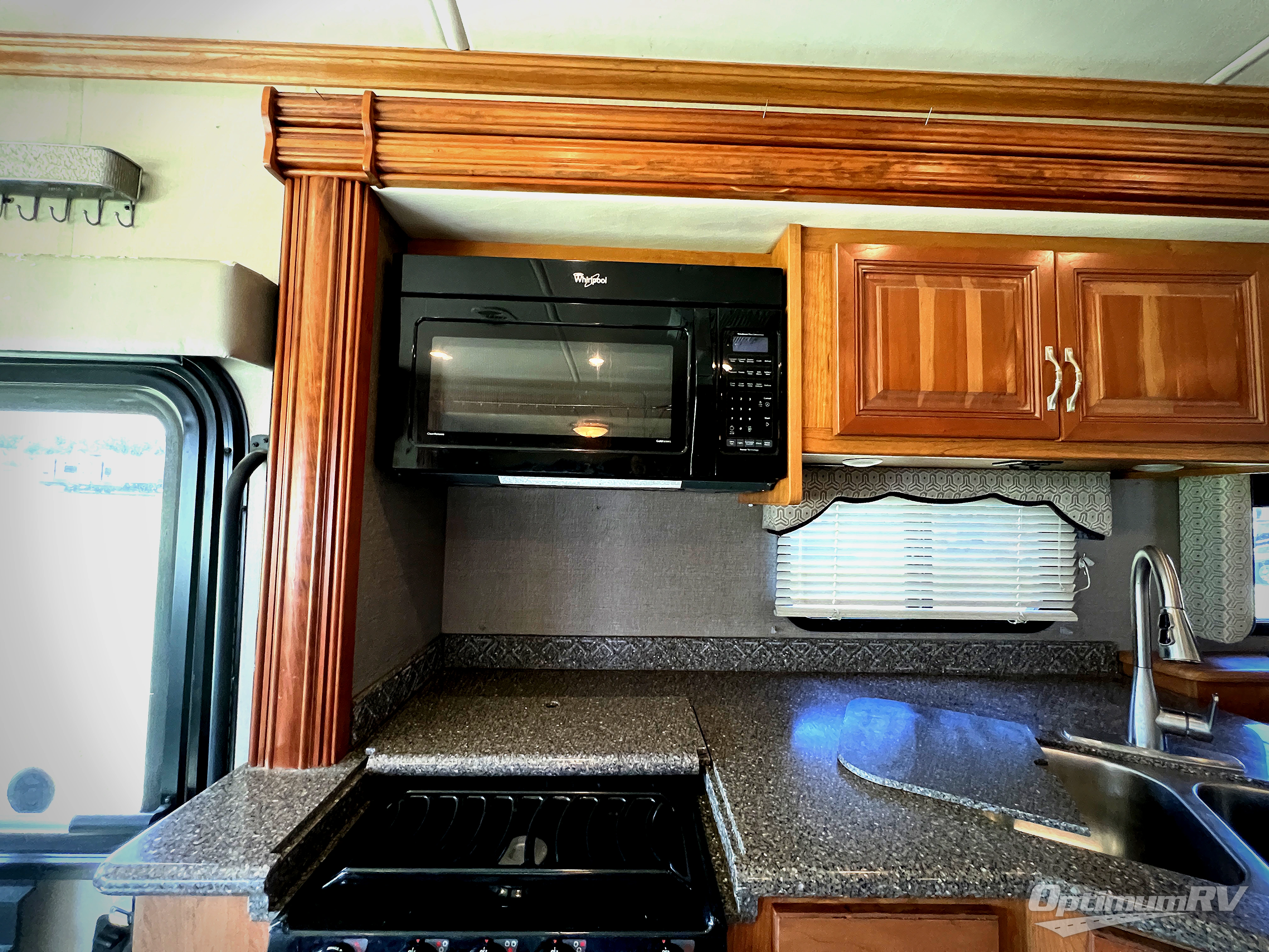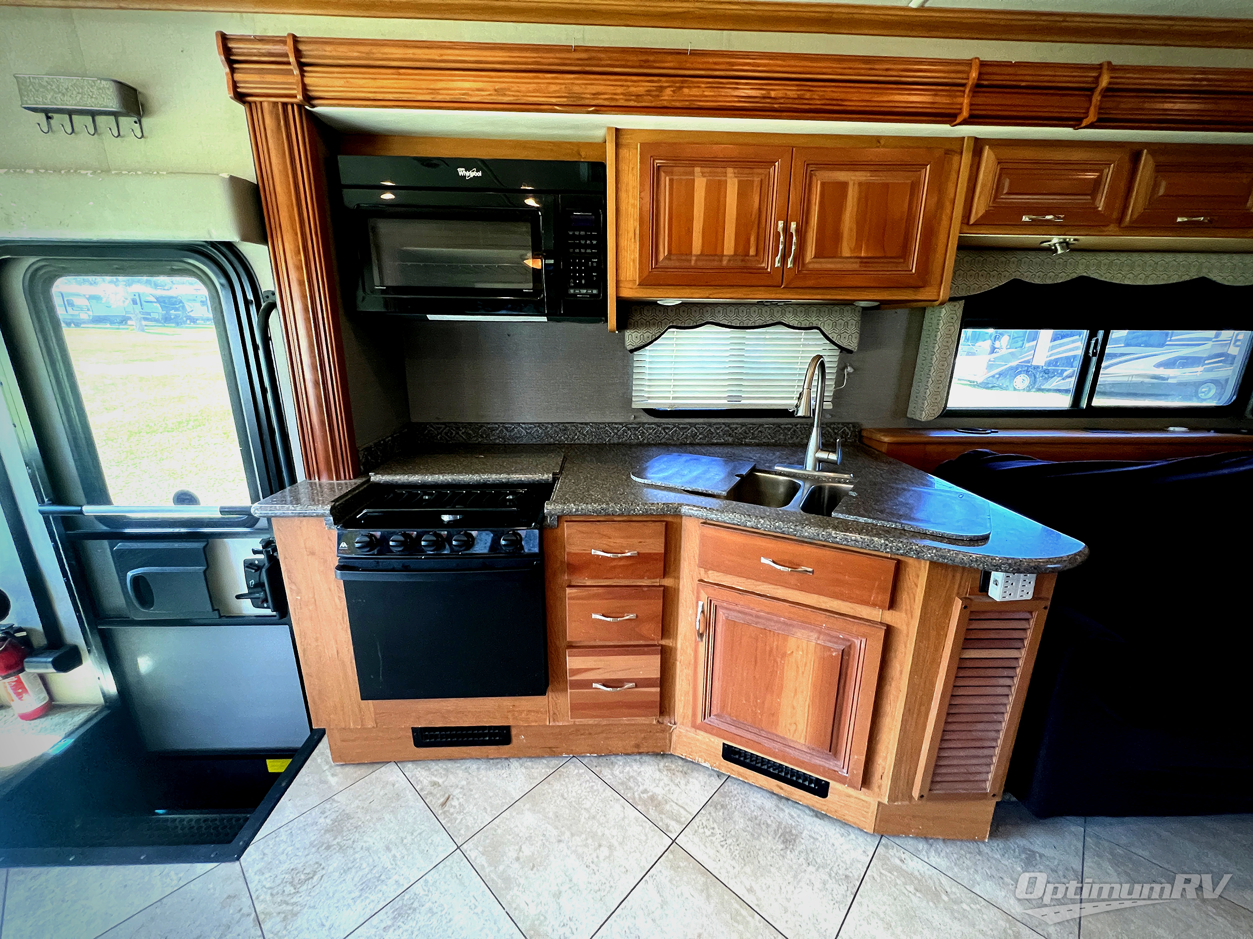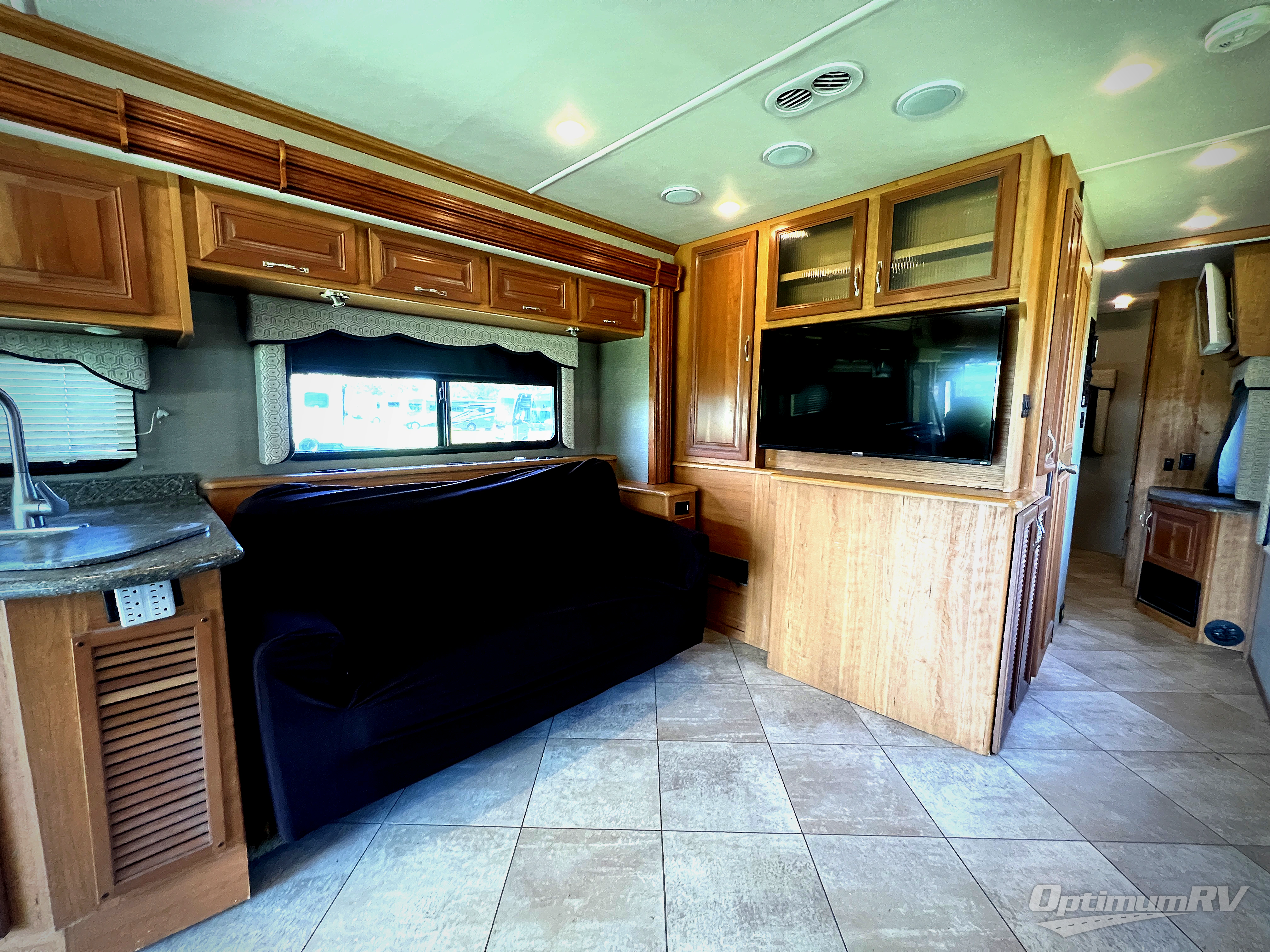 The slide on the passenger's side includes a 3 burner range with overhead microwave, an angled double kitchen sink, a sofa with a shelf behind it and overhead cabinets the width of the slide. There is a 39" LED TV mounted mid coach to face the front of the coach so that it is easily viewed from all of the seating.