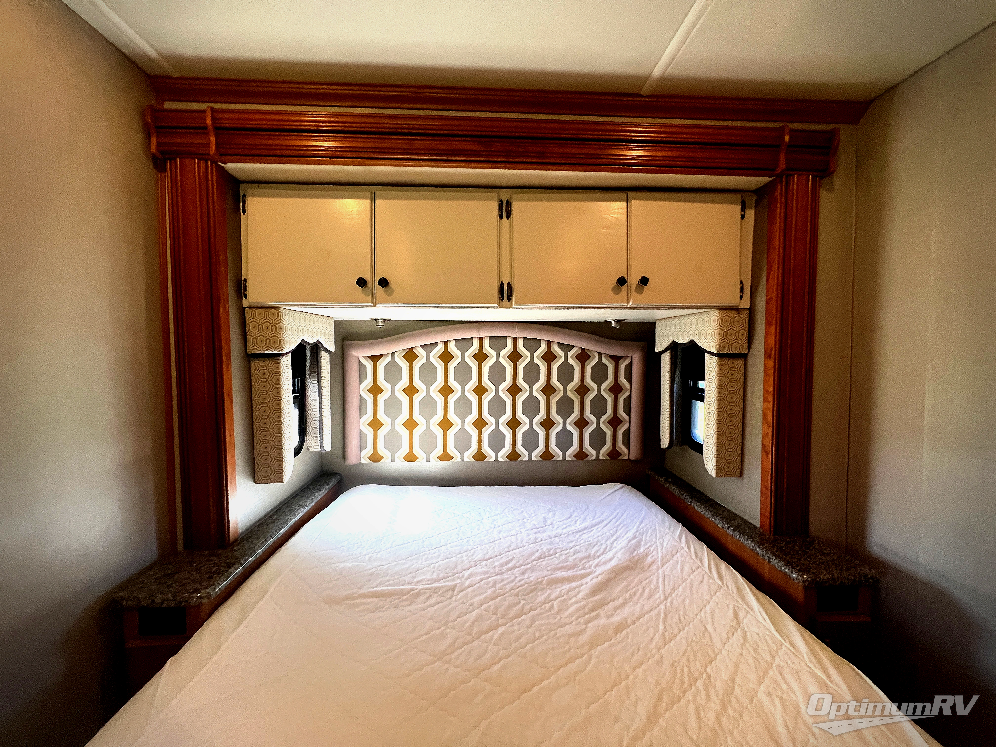 The rear bedroom includes a queen bed slide out with nightstands on each side and overhead cabinets. You may choose an optional king bed or an optional memory foam mattress in either king or queen size. The wall opposite the bed includes a large wardrobe and a 24" LED TV.