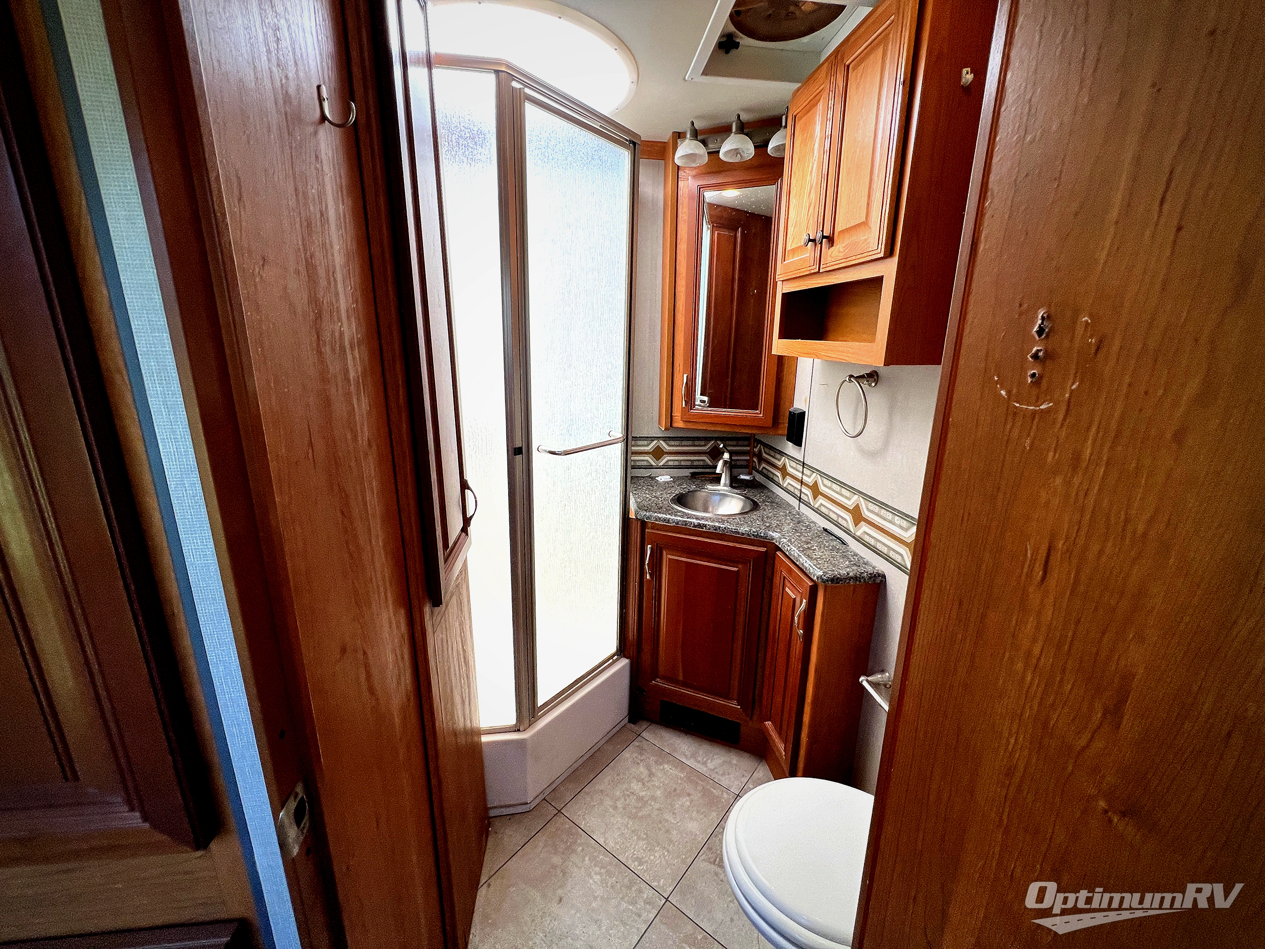 Moving back, the side aisle bathroom includes storage, a corner shower, a corner vanity sink, a medicine cabinet and a toilet.