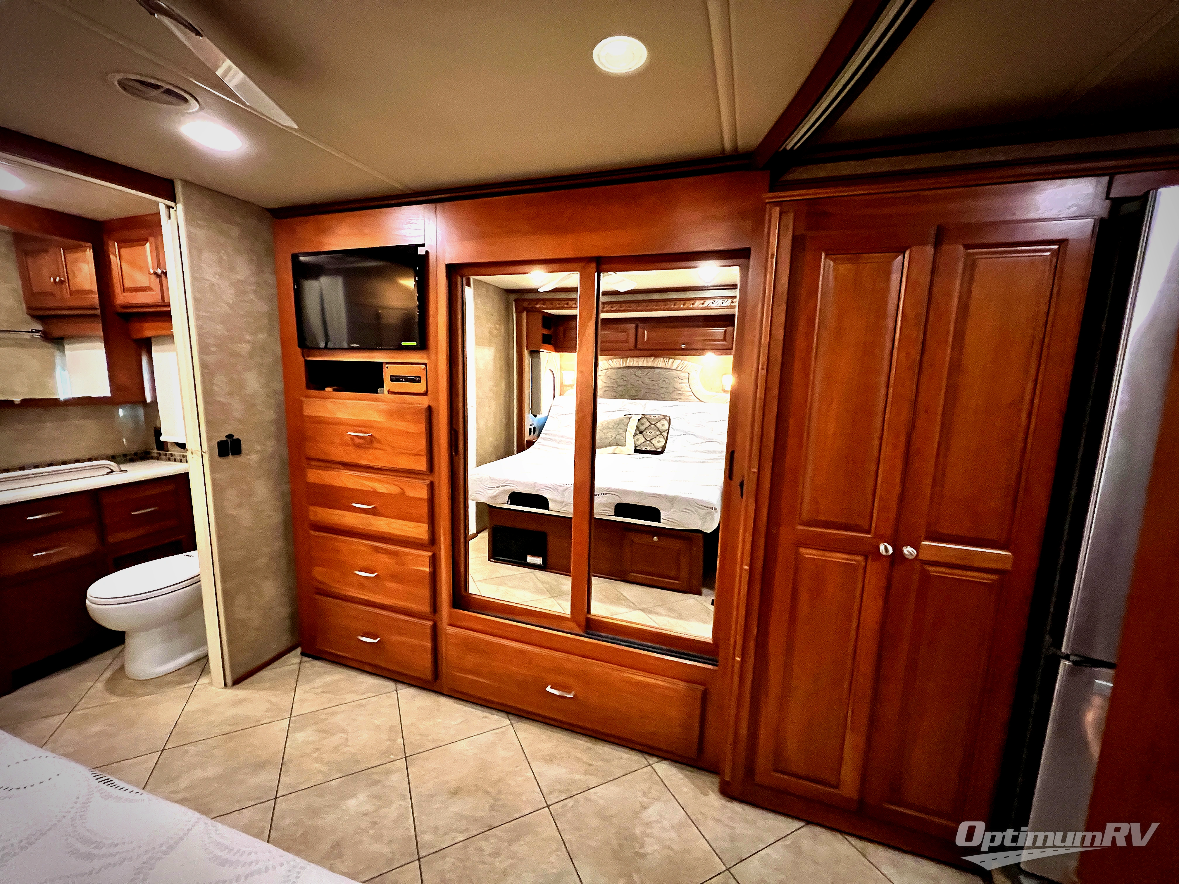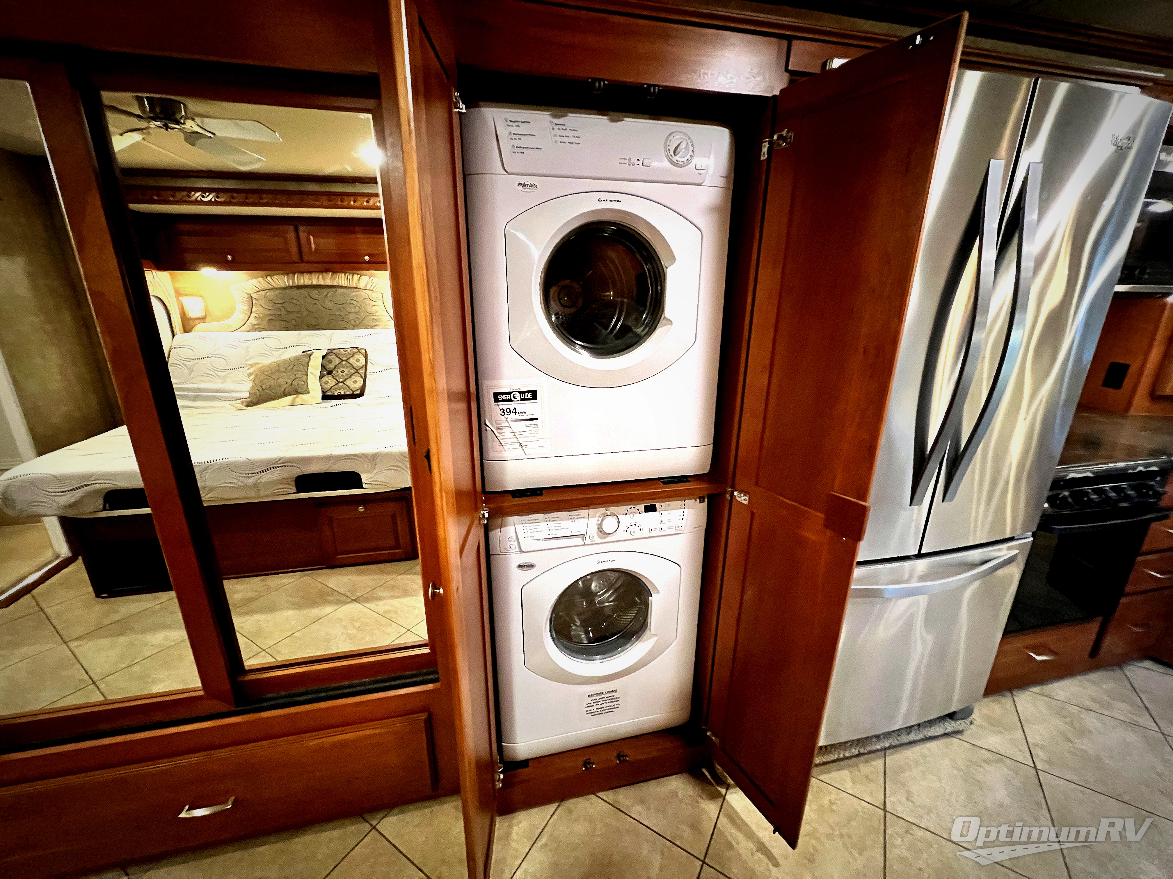 Opposite the door side in front enjoy meals at the Glide and Dine dinette with buffet and retractable 47" HD TV location found in the full wall slide. There is also a double kitchen sink, counter space, three burner range, 4 door refrigerator, a storage cabinet that is perfect for an optional washer and dryer if you like, and the bedroom wardrobe and chest of drawers, plus 28" HD TV location too.