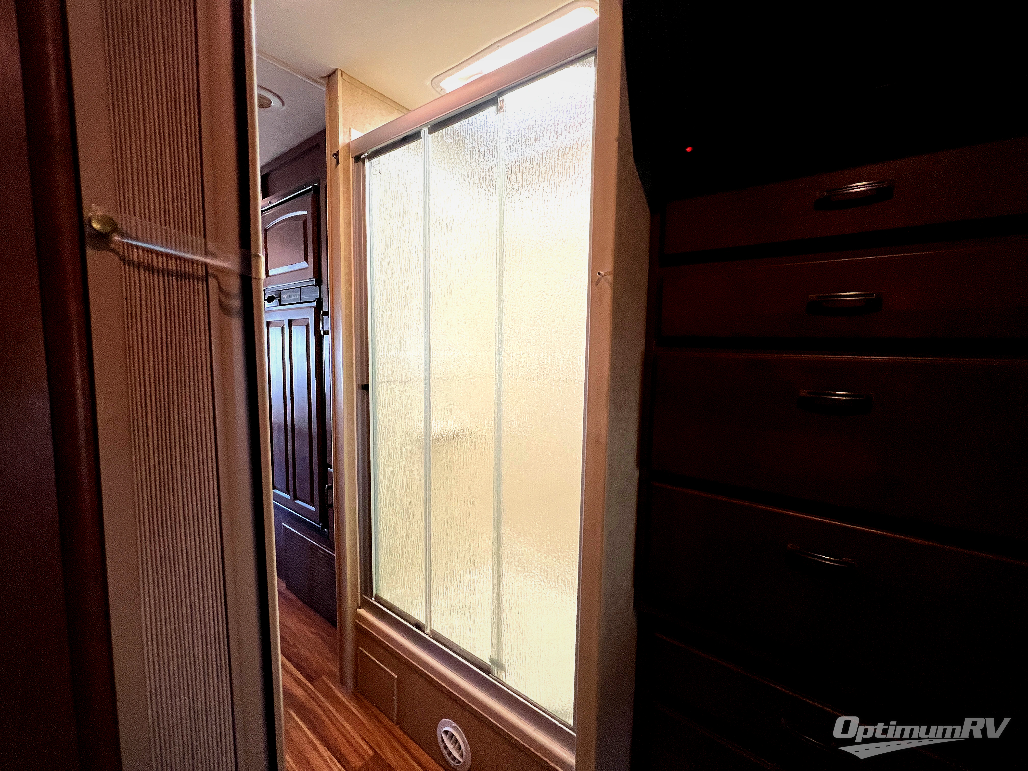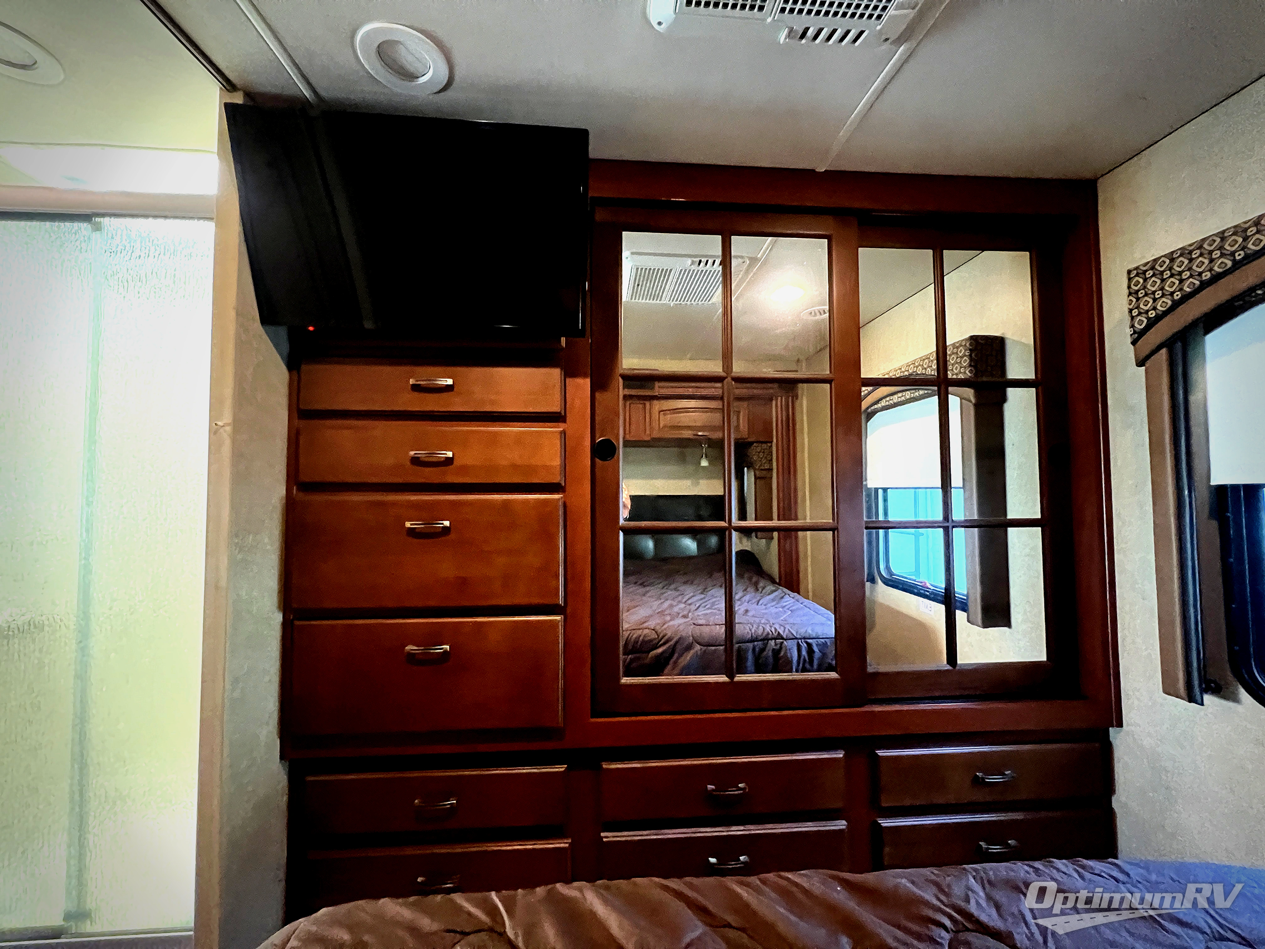 The rear bedroom has a queen bed slide and nightstands on either side of the bed. You will also find a wardrobe and a TV cabinet with drawers.