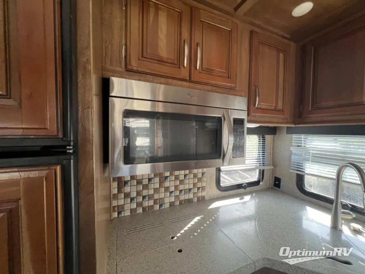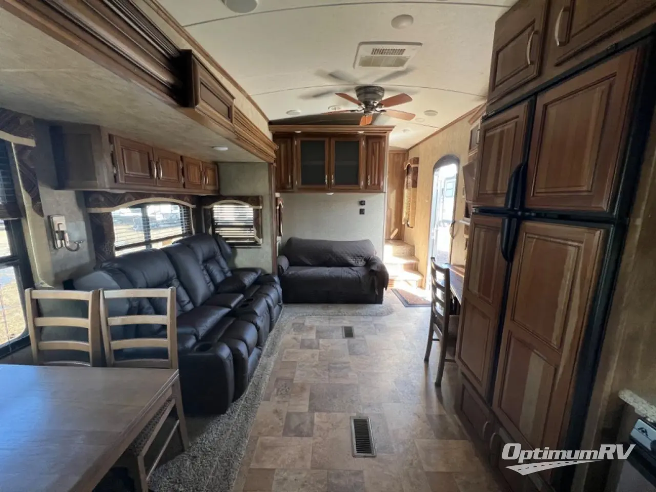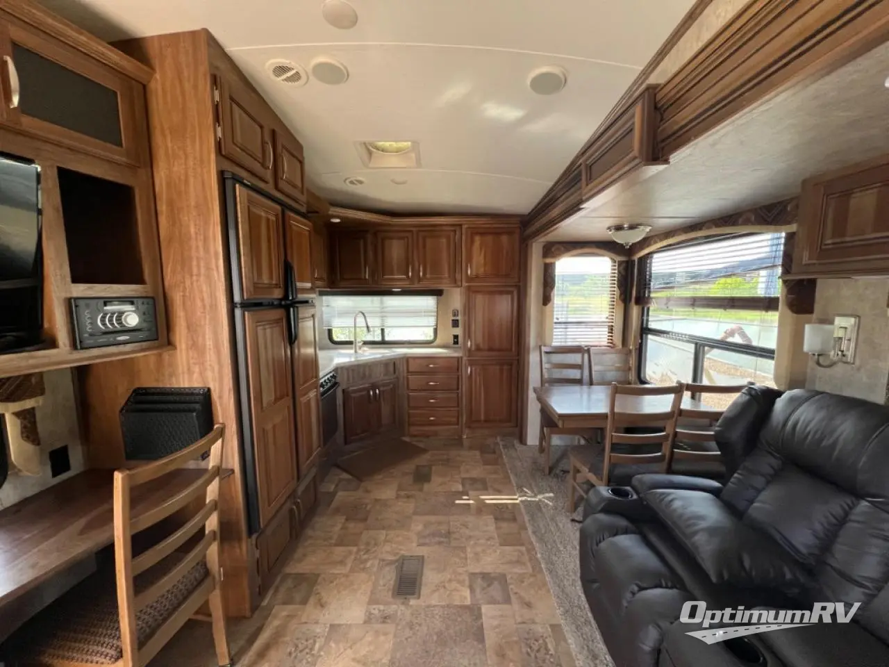 Step inside and find a rear kitchen with combined living space featuring a single slide with optional free standing dinette and optional theater seating for two. The kitchen provides a refrigerator, pantry, three burner range, double kitchen sink, and plenty of counter space and overhead cabinets for storage. Everything you need to prepare and cook food for your family while traveling.