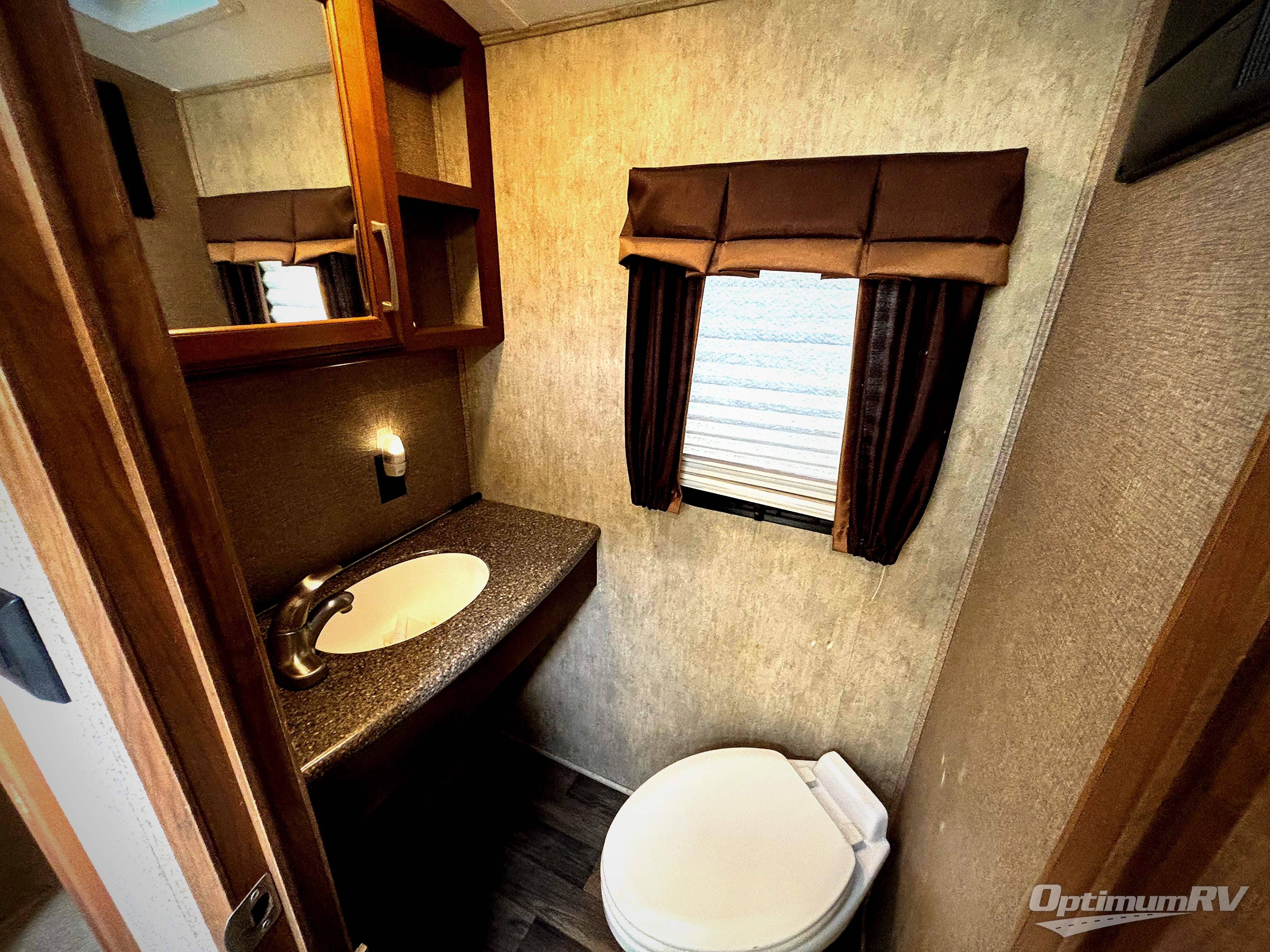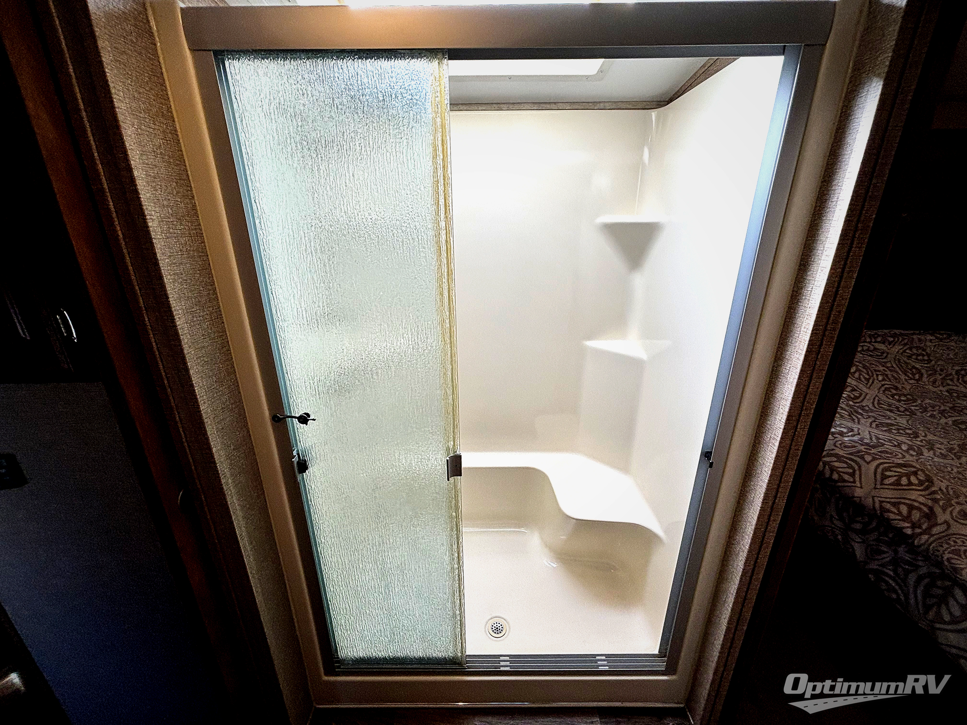 A sliding door leads you into the front master bedroom. The bedroom offers a slide out wardrobe and queen size bed including storage beneath, or you may choose the optional king. There is a sink with overhead cabinet in the corner, plus a dresser opposite the bed including an HD TV above. Along the front wall find a wardrobe with plenty of storage for all of your clothes.