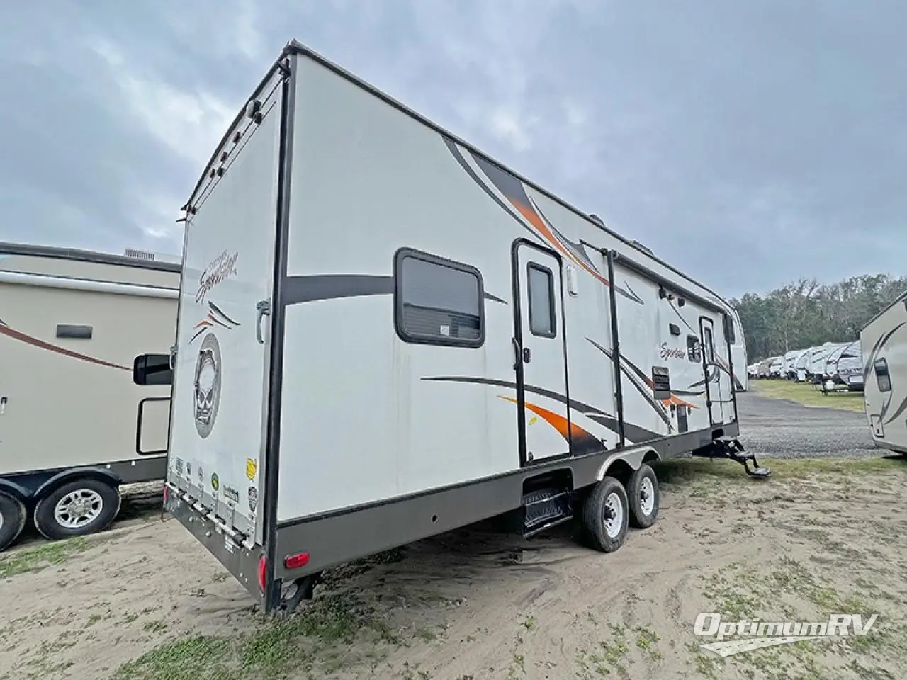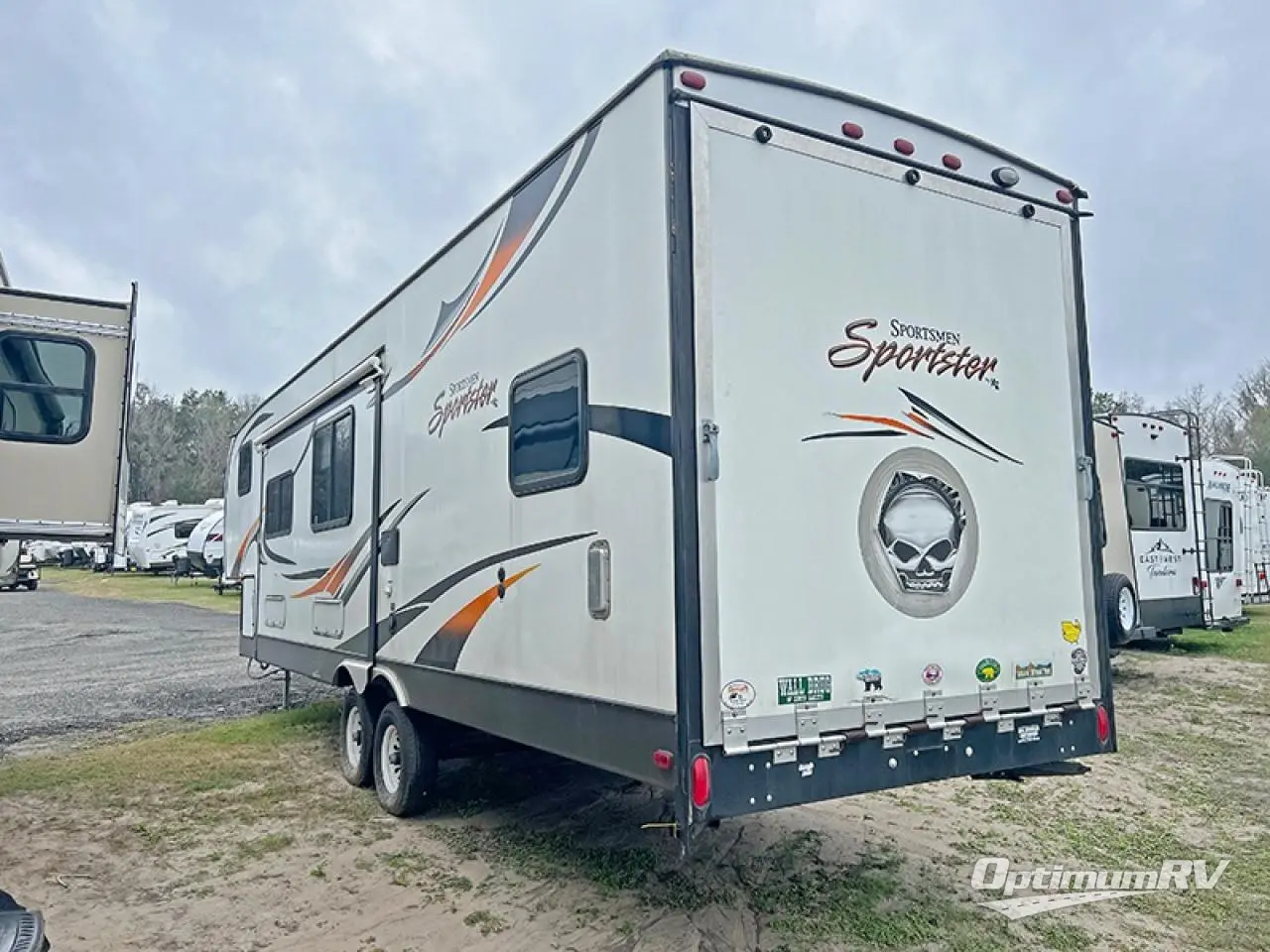 The Sportsmen Sportster 315TH toy hauler fifth wheel by KZ offers a 88" x 91" ramp door and a single slide.