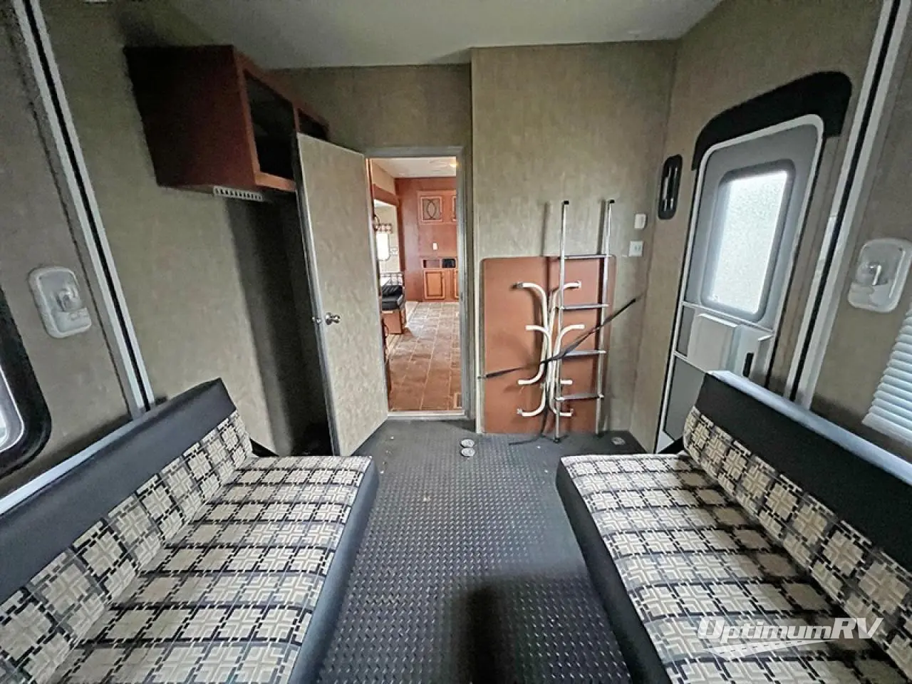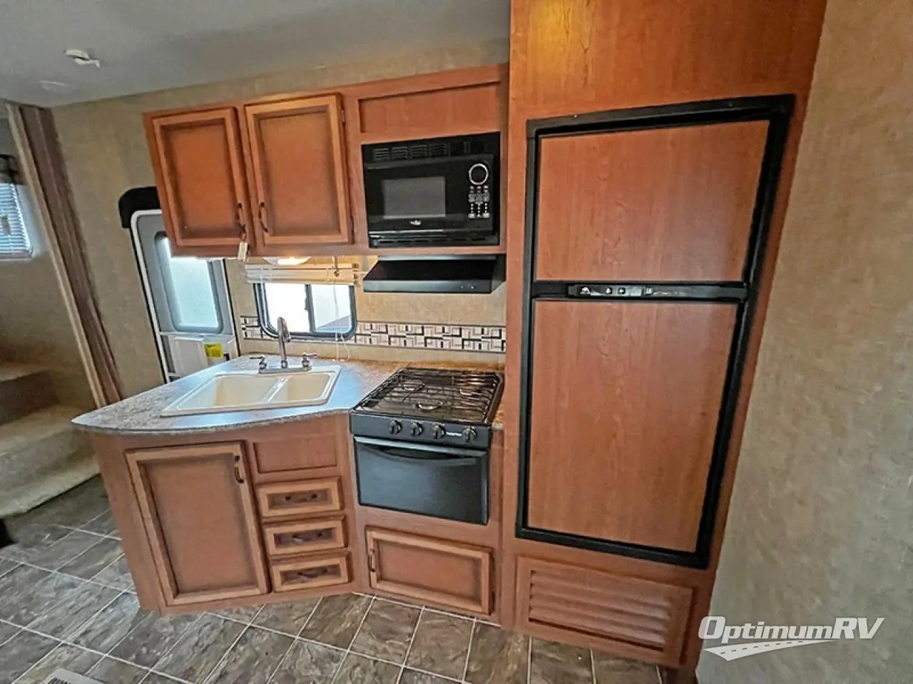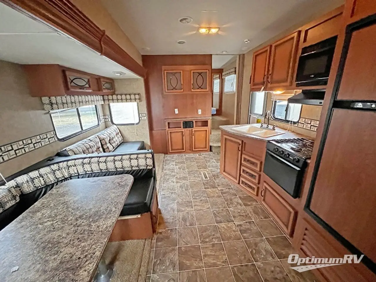In the main living and kitchen area there is a refrigerator, three burner range, and double kitchen sink on one side. On the other side you will find a closet, and a slide with a u-dinette and sofa. Along the front wall there is an entertainment center.