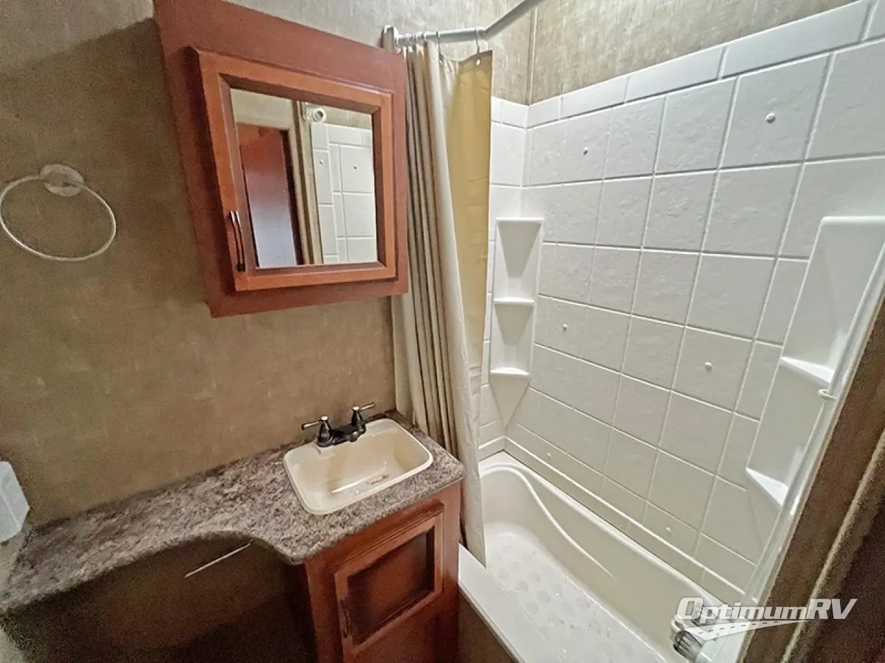 As you enter the main living area from the cargo area, you will come to the bathroom along the right side of the fifth wheel. Inside the bathroom there is a tub, sink, medicine cabinet, and toilet.