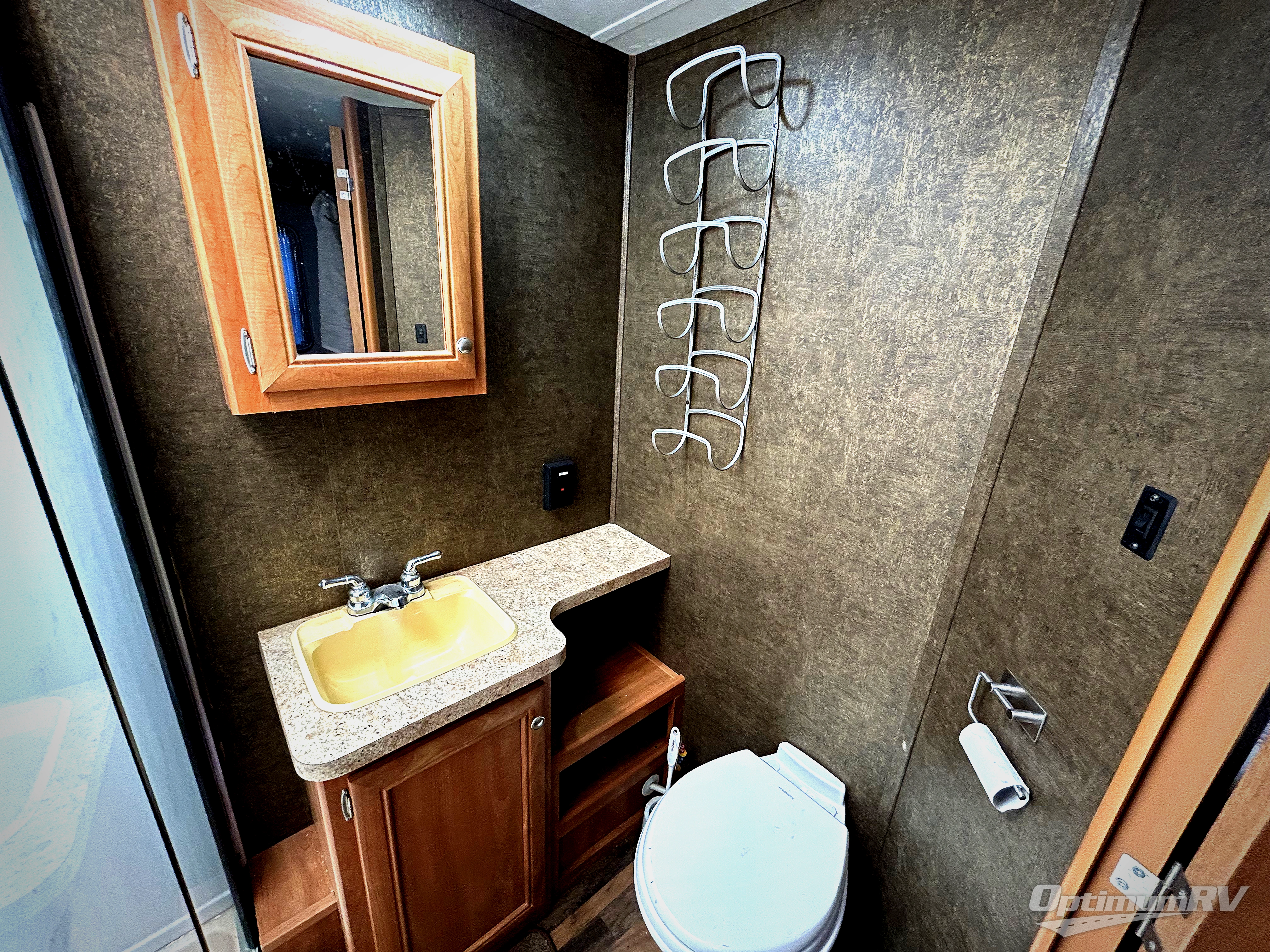 A side bath mid coach offers easy access from the front most outer entry door and features a 36" tub/shower, toilet, and sink with medicine cabinet above.