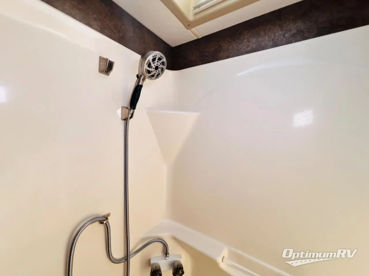 A sliding door blocks off the bedroom and bathroom space from the front living area. When you enter you will find a shower on your right and private toilet and vanity with sink on your left including some overhead storage cabinets.