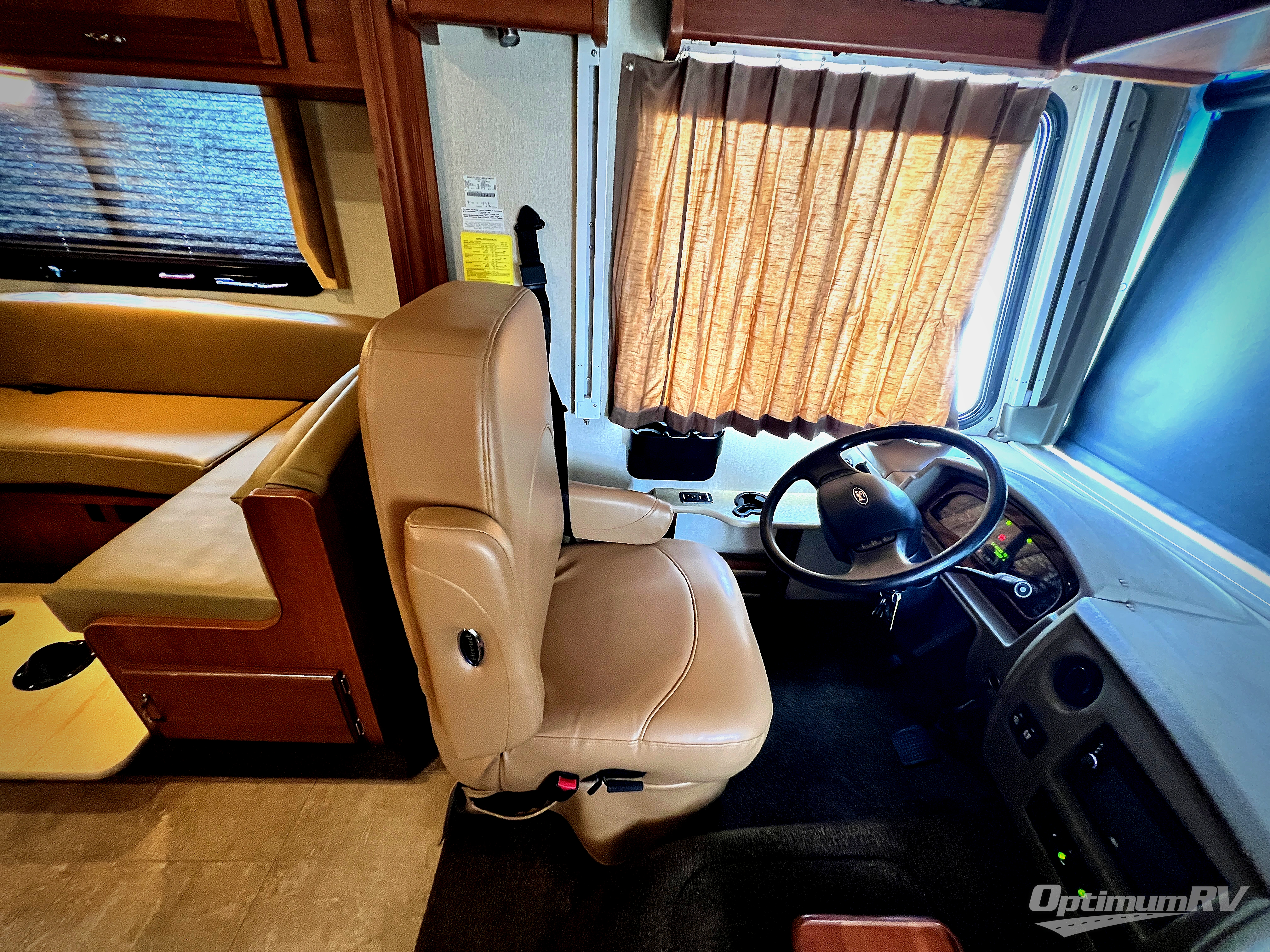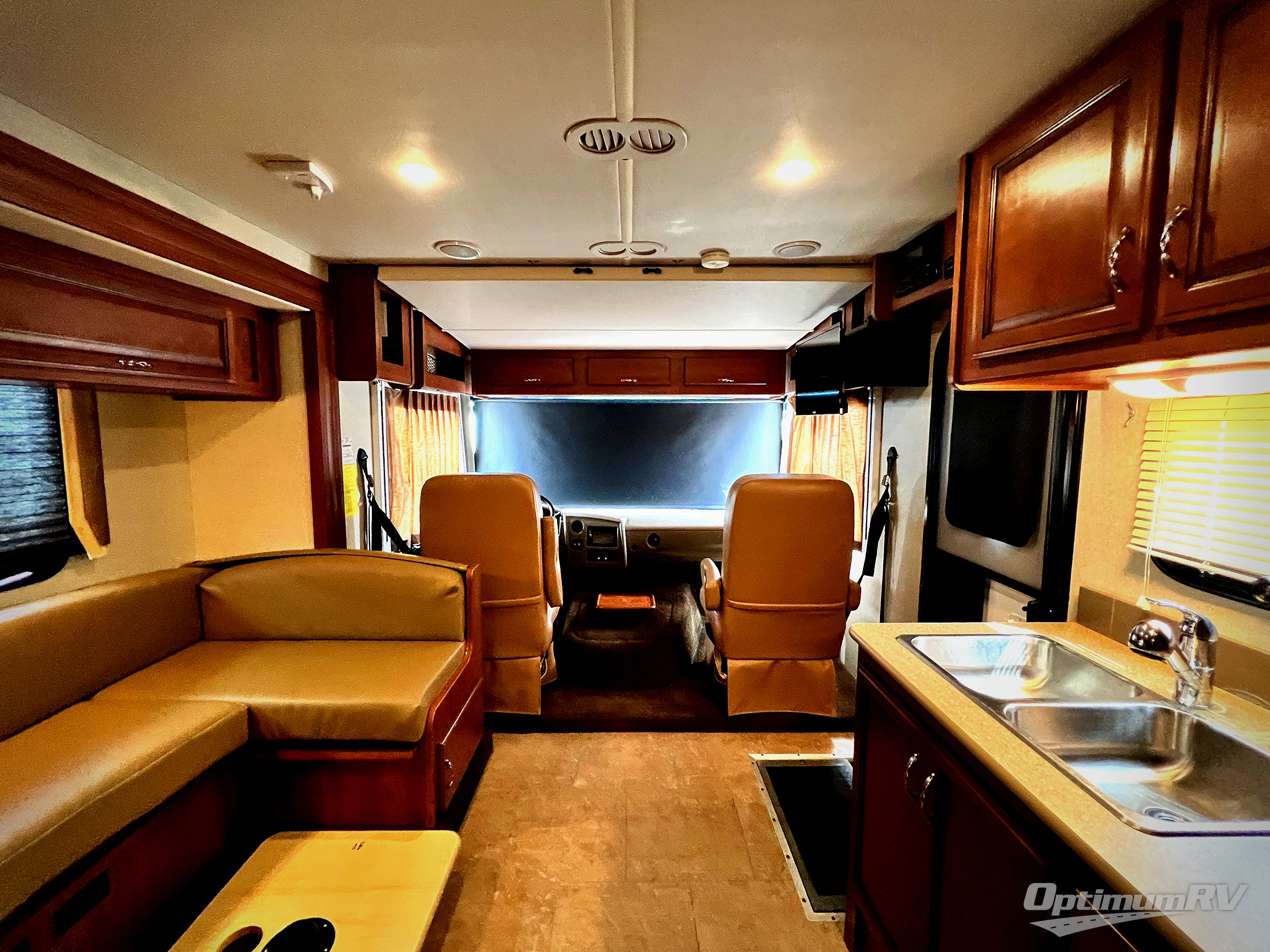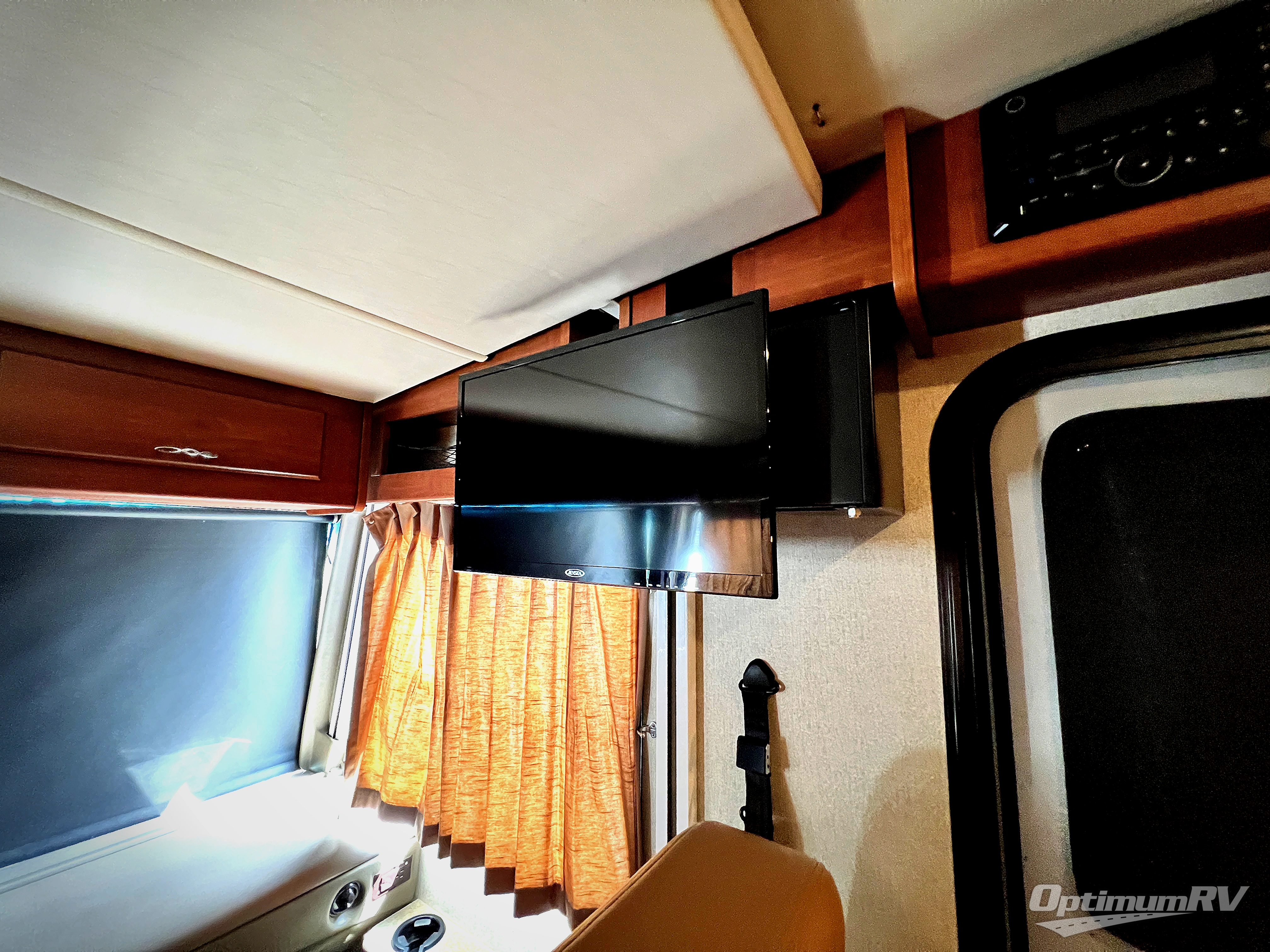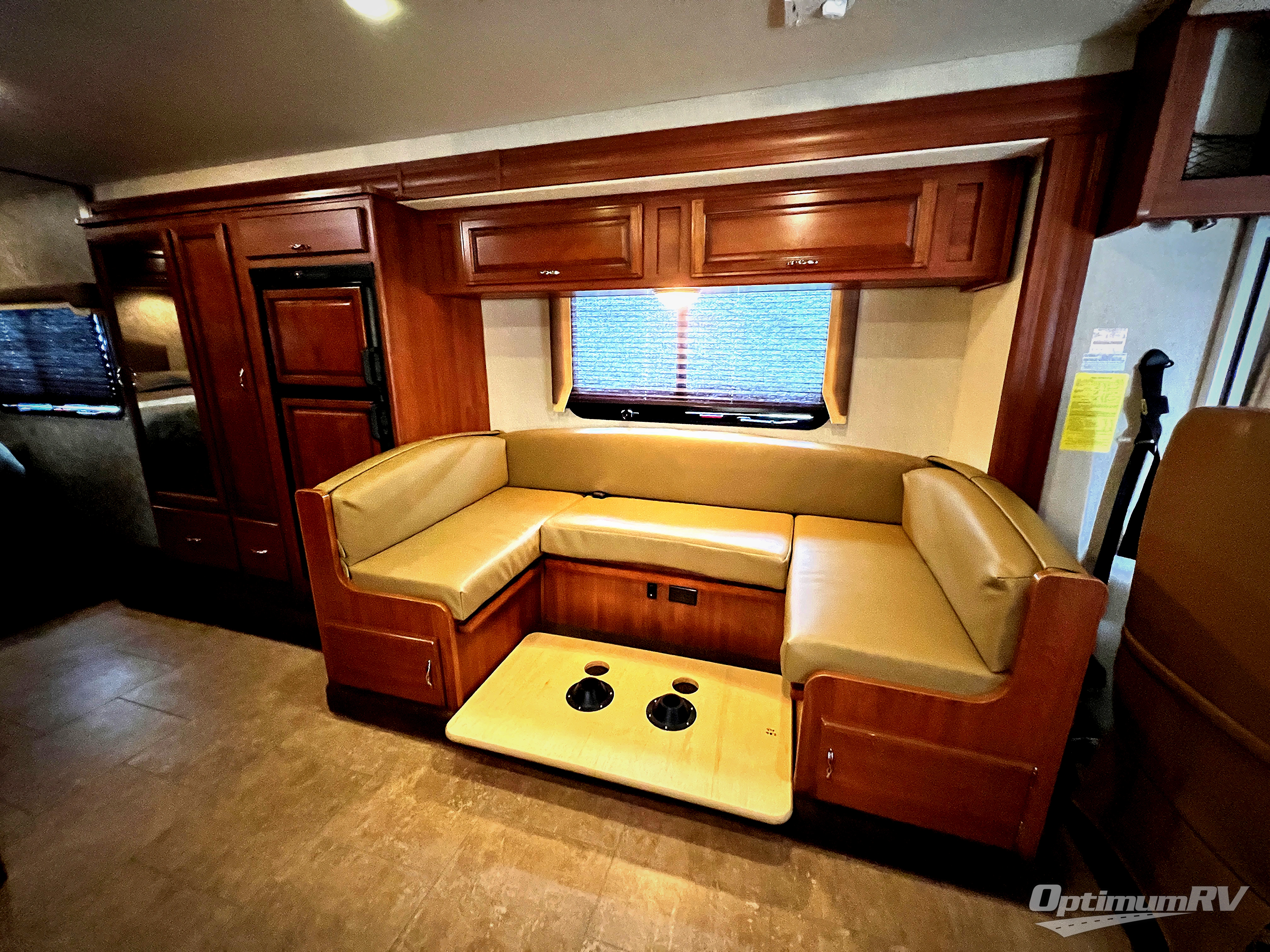As you enter notice the 32" LED TV above the cab area for enjoyment. Look back to the rear of the coach and see plenty of seating to enjoy all of your meals at including three sets of seat belts on the u-shaped dinette. This slide out also features a refrigerator and wardrobe/pantry.