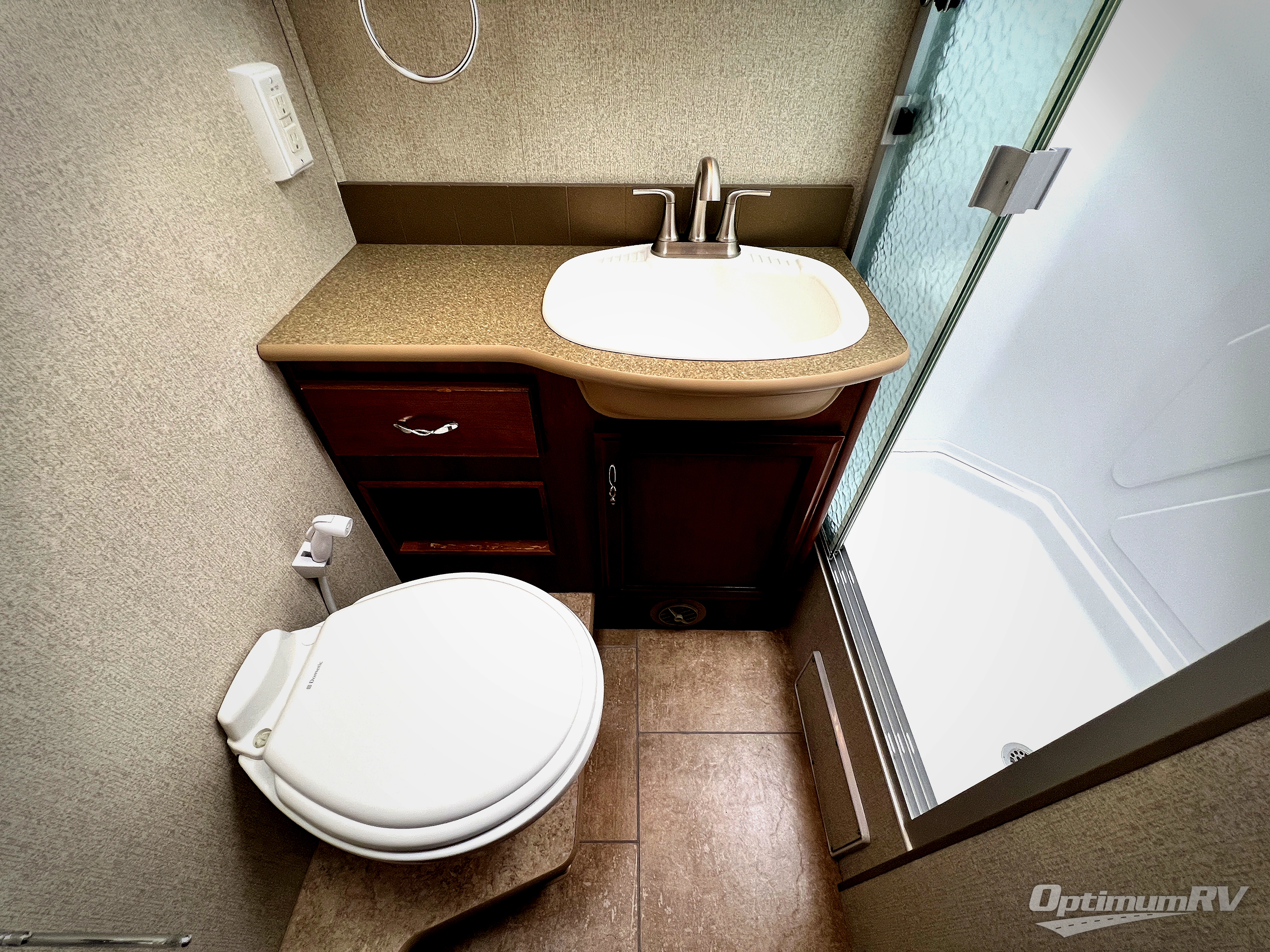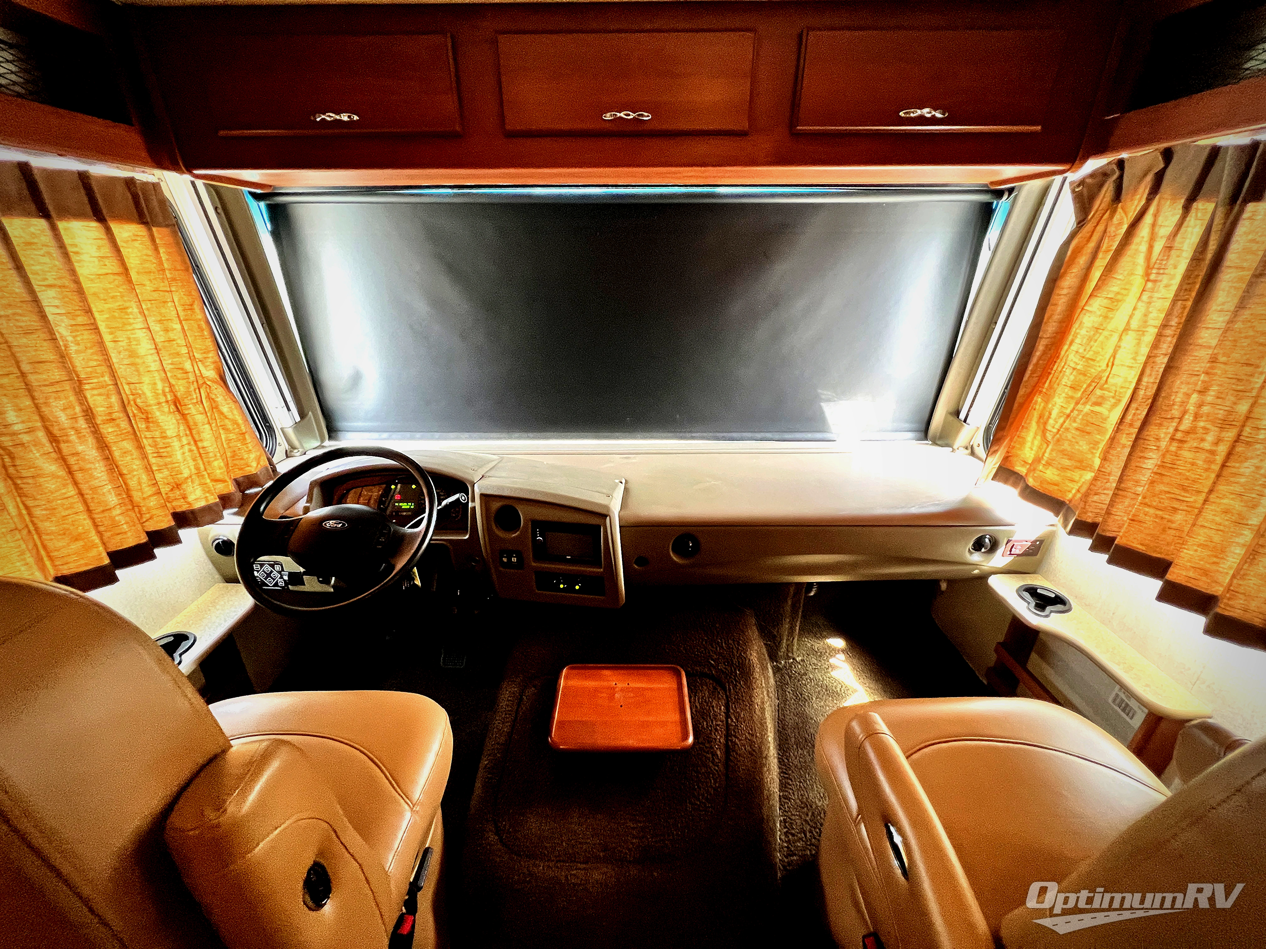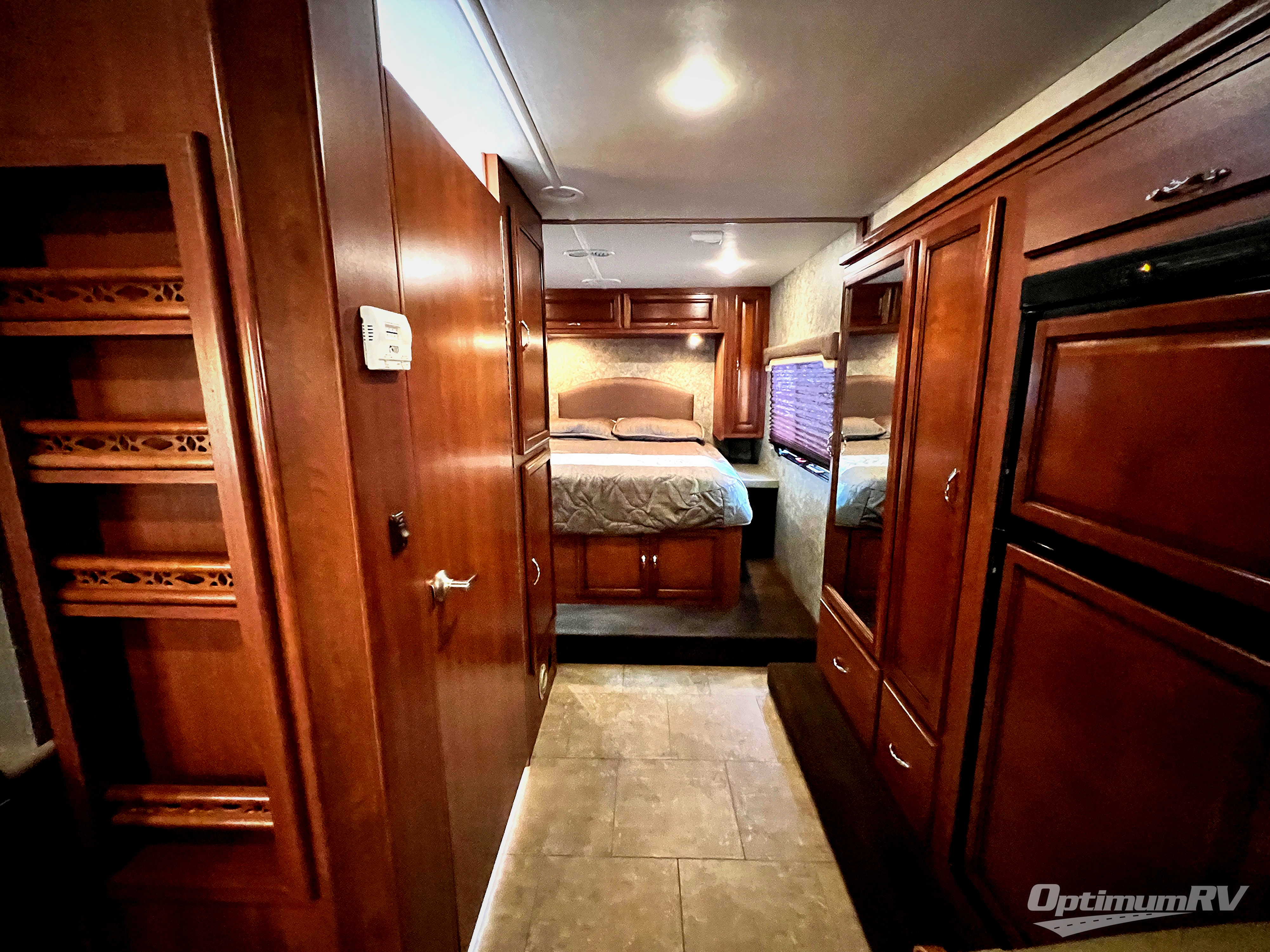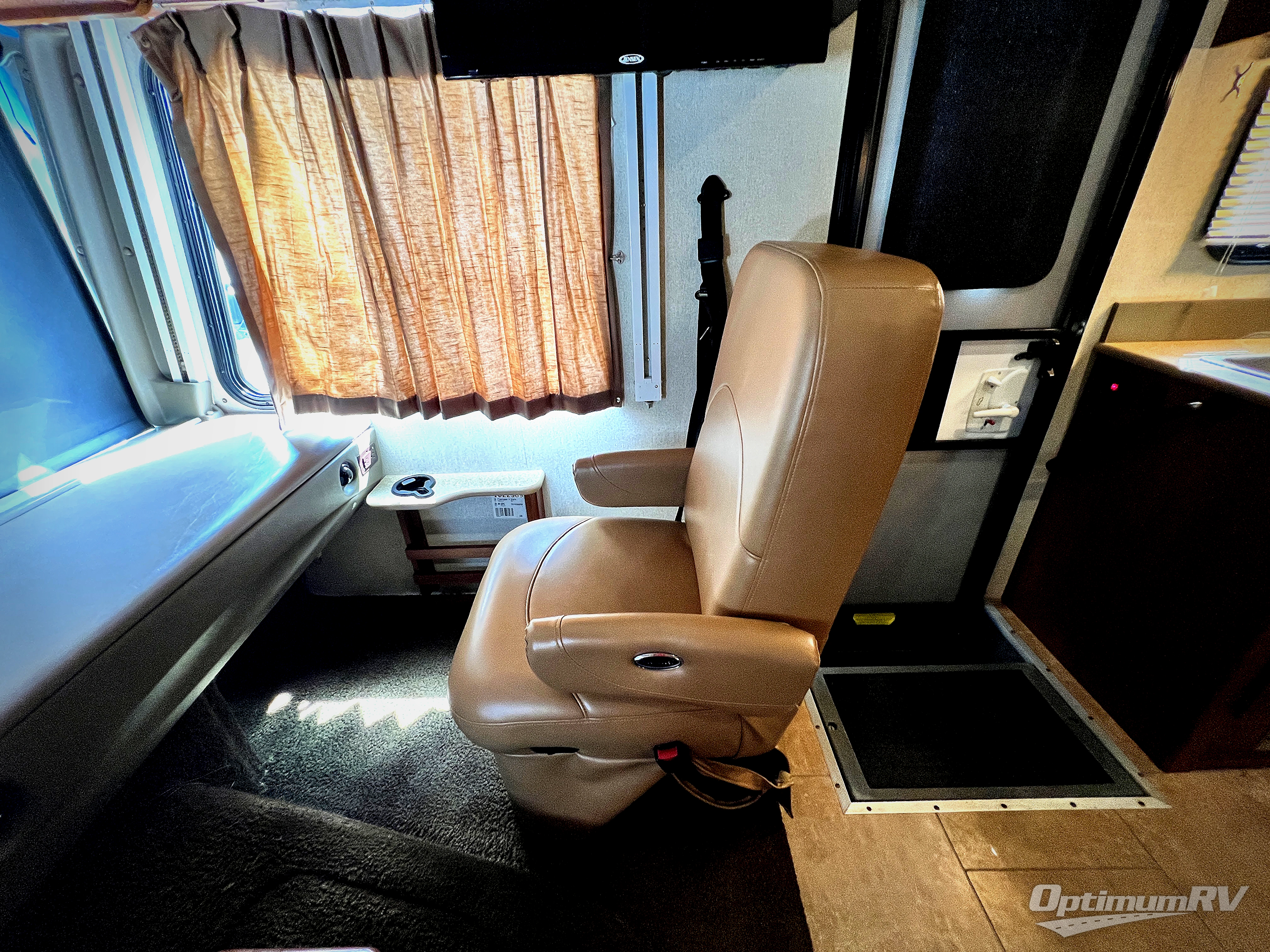 As you enter notice the 32" LED TV above the cab area for enjoyment. Look back to the rear of the coach and see plenty of seating to enjoy all of your meals at including three sets of seat belts on the u-shaped dinette. This slide out also features a refrigerator and wardrobe/pantry.
