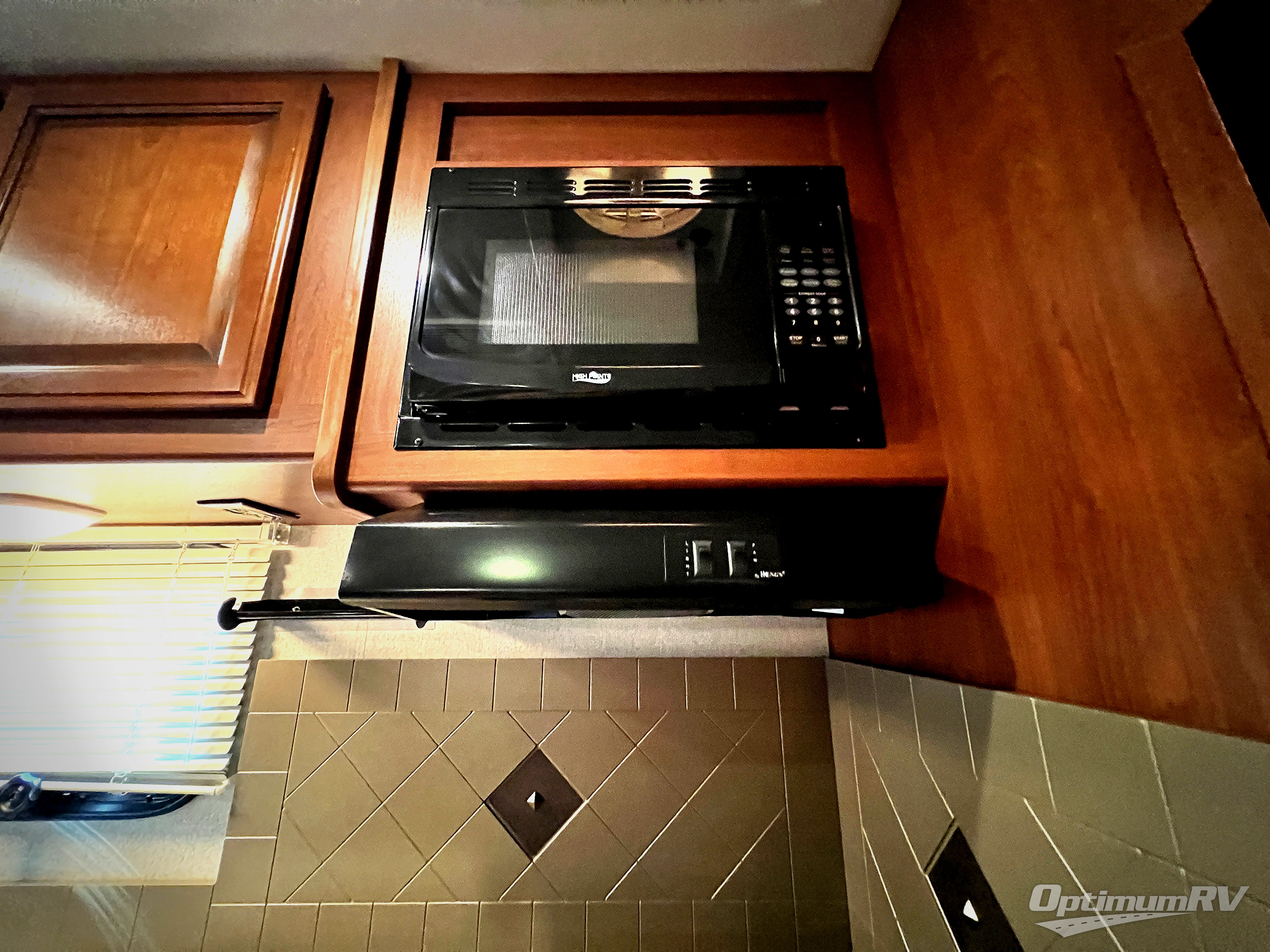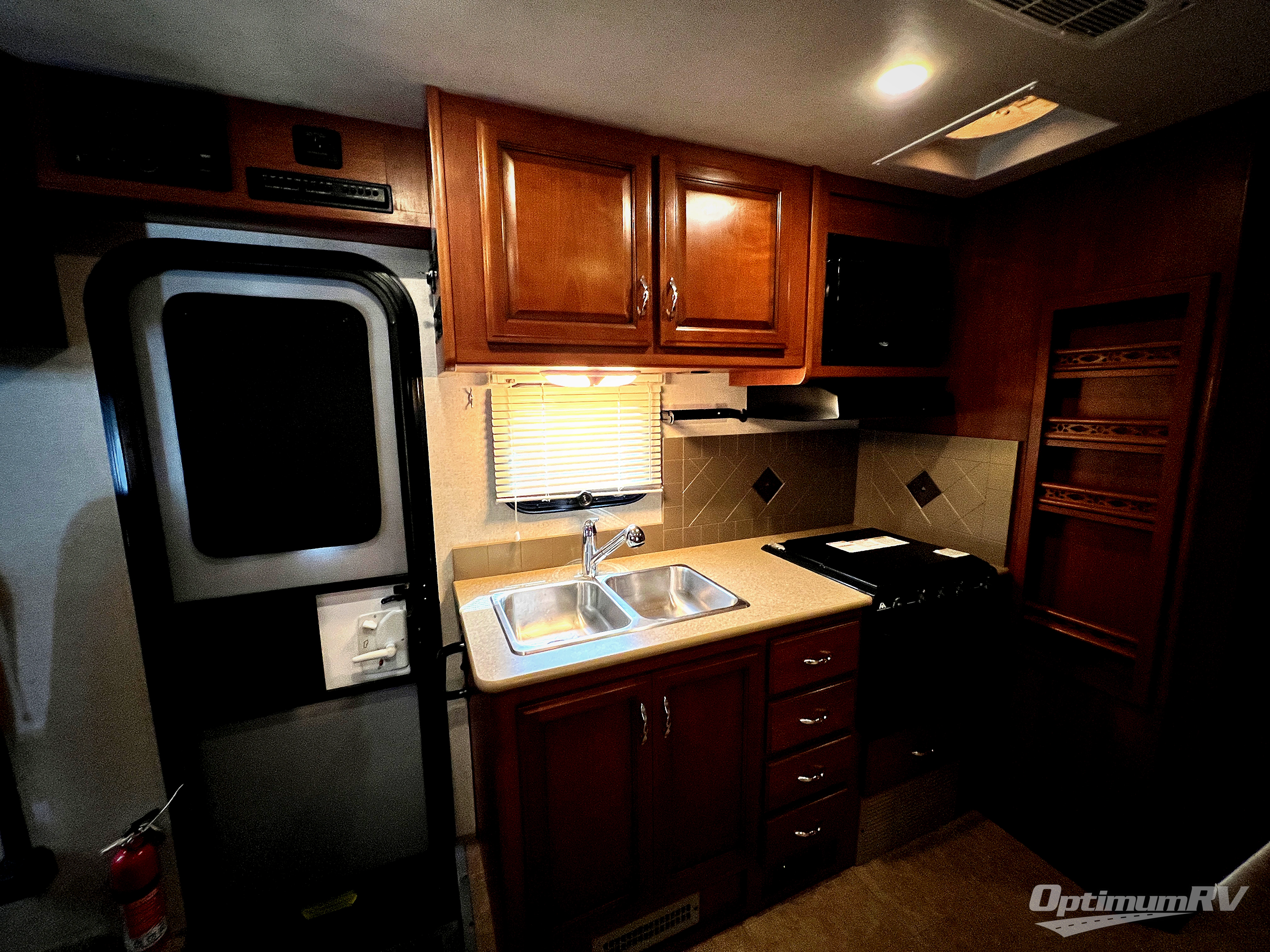 To the left of the door find a double sink, a three burner range with overhead microwave oven, and ample storage for dishes and things.