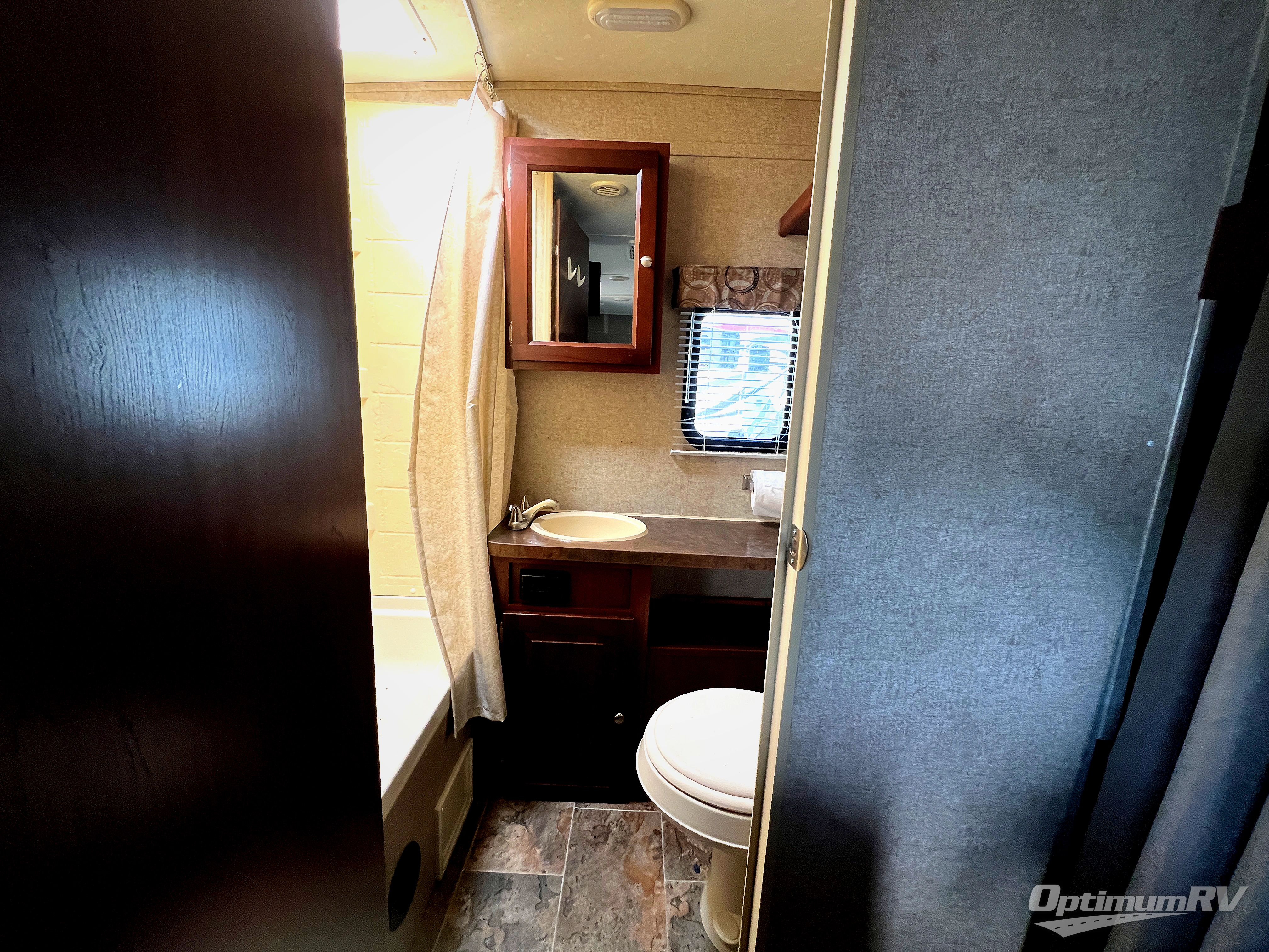 As you enter the travel trailer, to the left is a dinette with an entertainment center above. Next to the dinette you will find a refrigerator. On the other side of the travel trailer there is a three burner range, microwave, double kitchen sink, and counter extension.