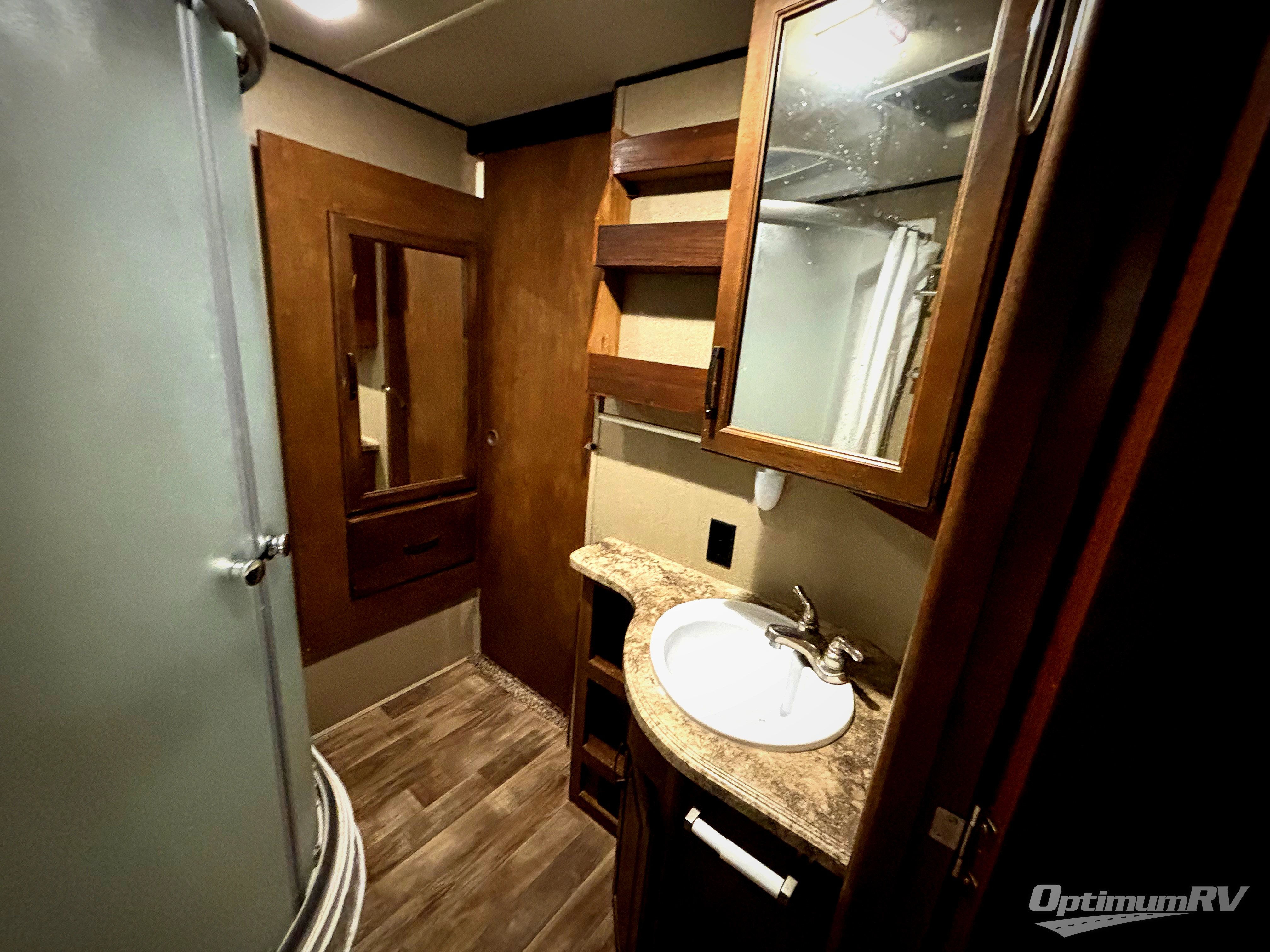 Back at the entry door you can step up to the right and find a front master suite with bathroom accessible from the hall door, or from within the bedroom. Enjoy a restful nights sleep in a comfortable queen bed including overhead storage cabinets and nightstands beside the bed. There is a slide out with wardrobes, and linen cabinet that falls within the bath when the sliding door is closed.