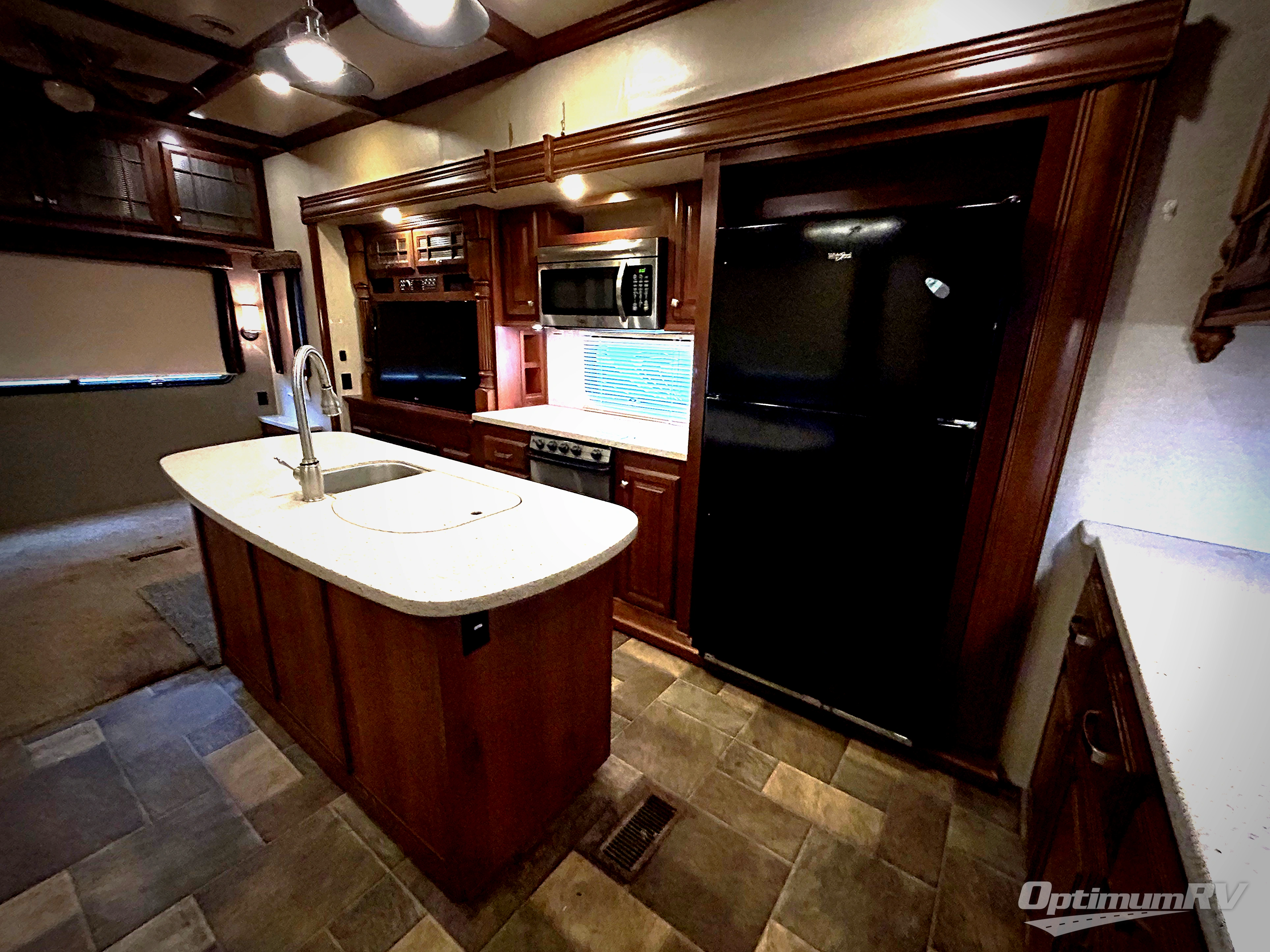 Step in and see how comfortable your next camping trip would be. There is a dining table for two within a slide out that also contains two swivel glider recliners as well. Along the rear wall find more seating with a sofa including end tables on either side. Adjacent to the sofa enjoy an entertainment center with flat screen TV that slides out, along with a pull-out desk, plus overhead storage. This slide also features the kitchen appliances which includes a double door refrigerator and a three burner range. There is also a kitchen island with double sink, and added counter space along the interior wall.