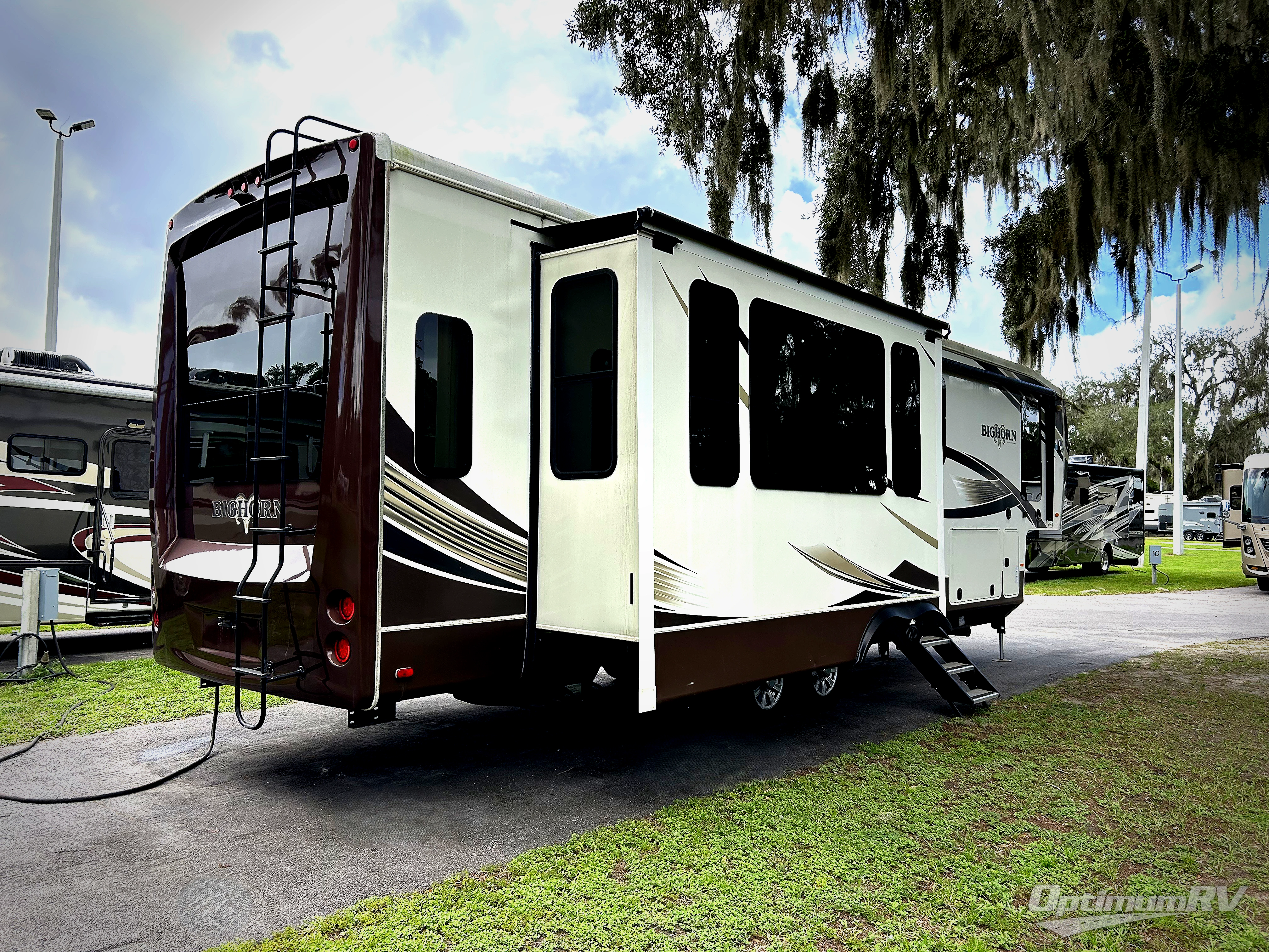 This Heartland Bighorn luxury fifth wheel model 3575EL will have you enjoying your every adventure! This model features a rear living layout, Mega tall slide outs, a convenient kitchen island, and a king size bed in the master, plus more!