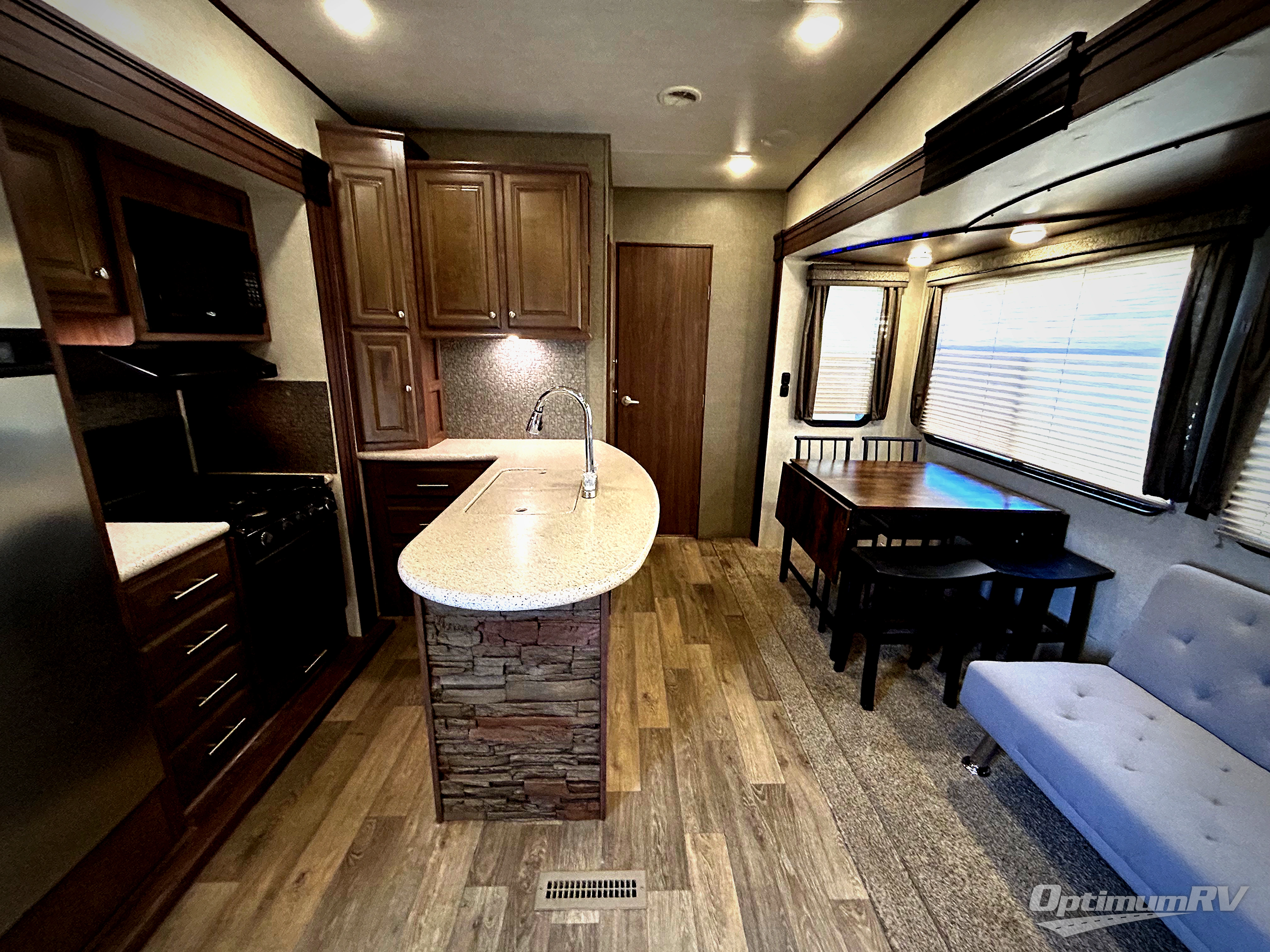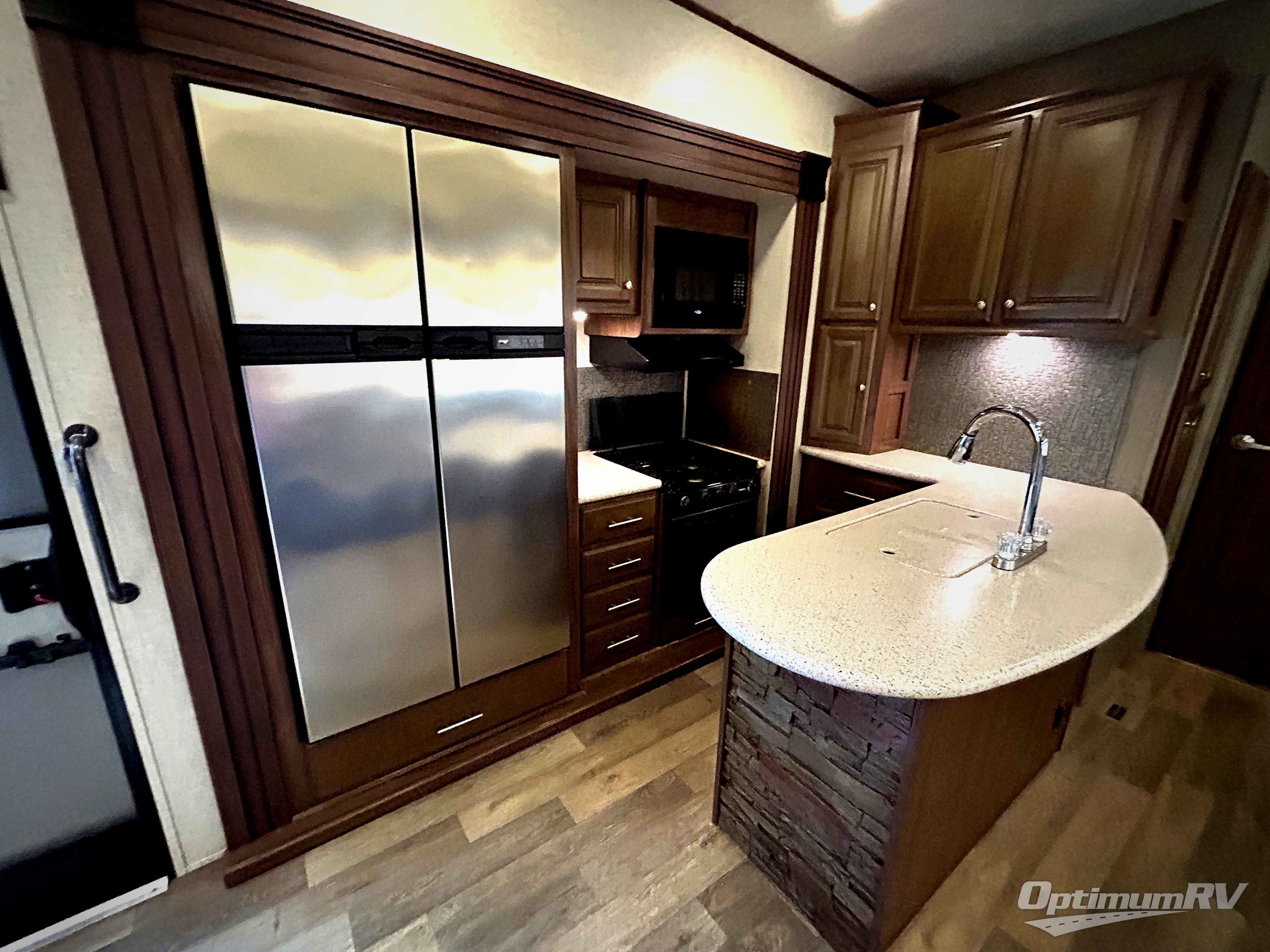 Back in the main living space find a slide out refrigerator (four door optional available), and three burner range with microwave oven above. Next, a L-shaped counter which includes the double kitchen sink. There are two bar stools so you can enjoy a conversation easily with family or friends as you prepare and cook food. A LCD TV is located above the counter and can easily be viewed throughout the space.