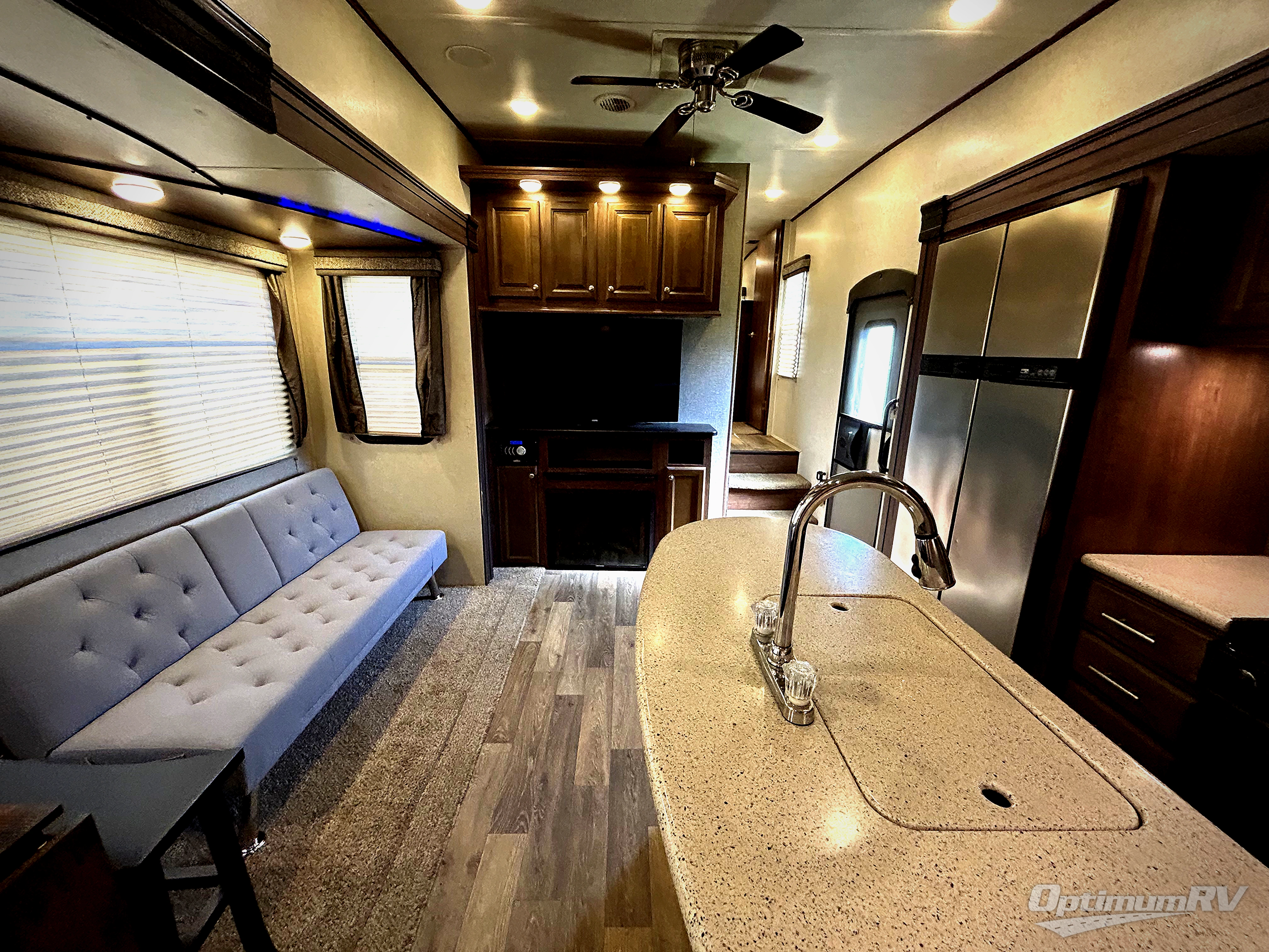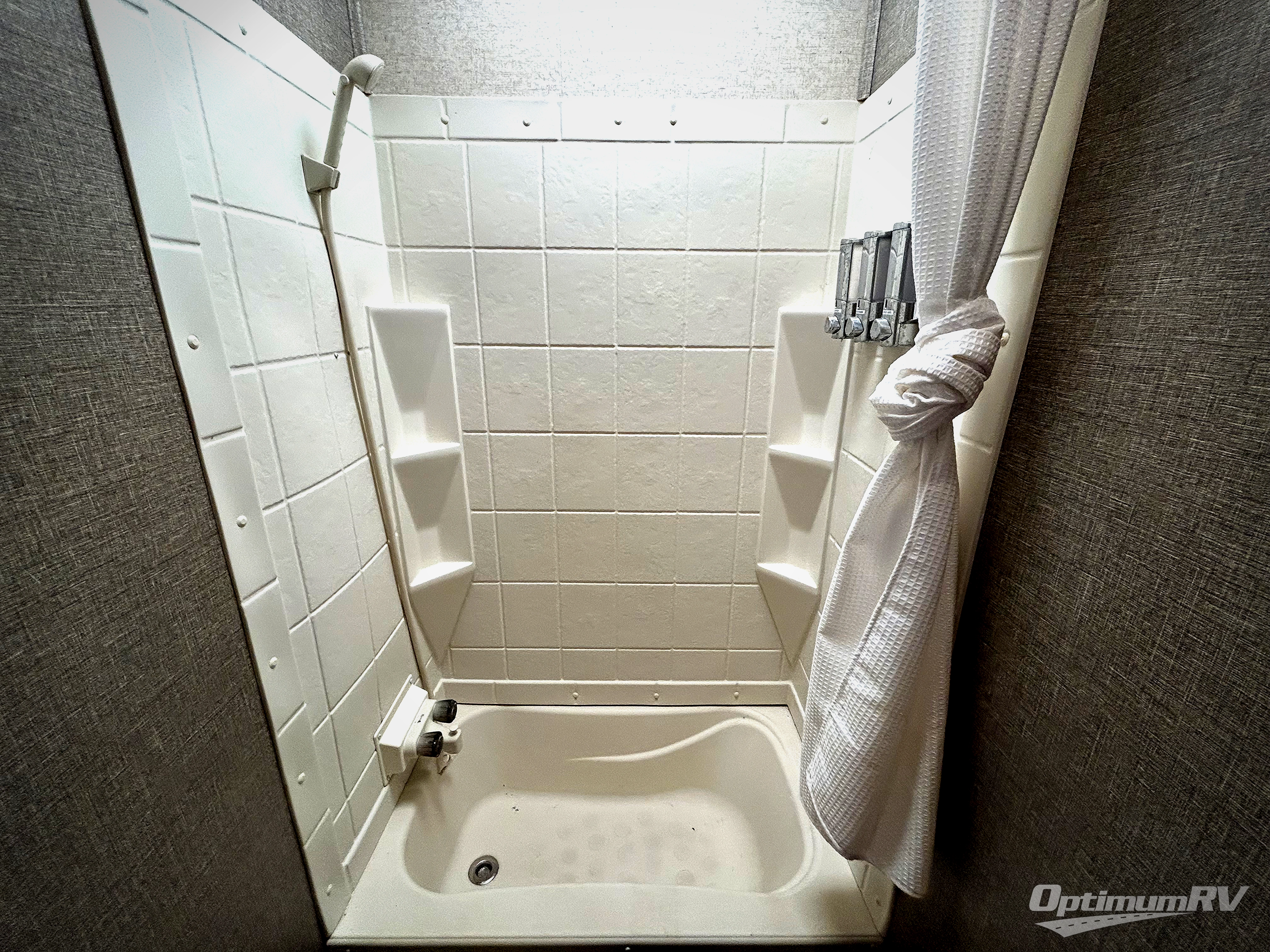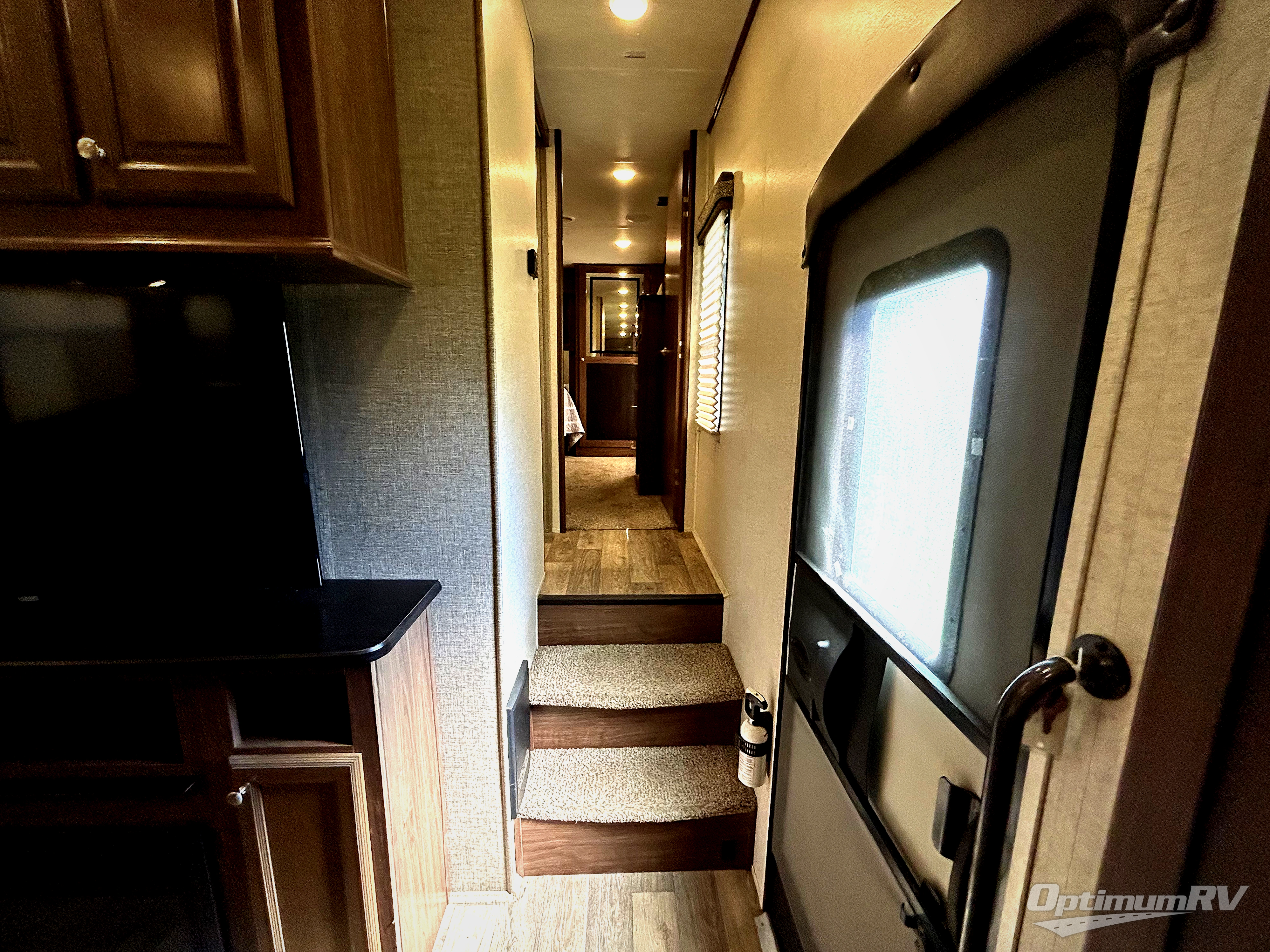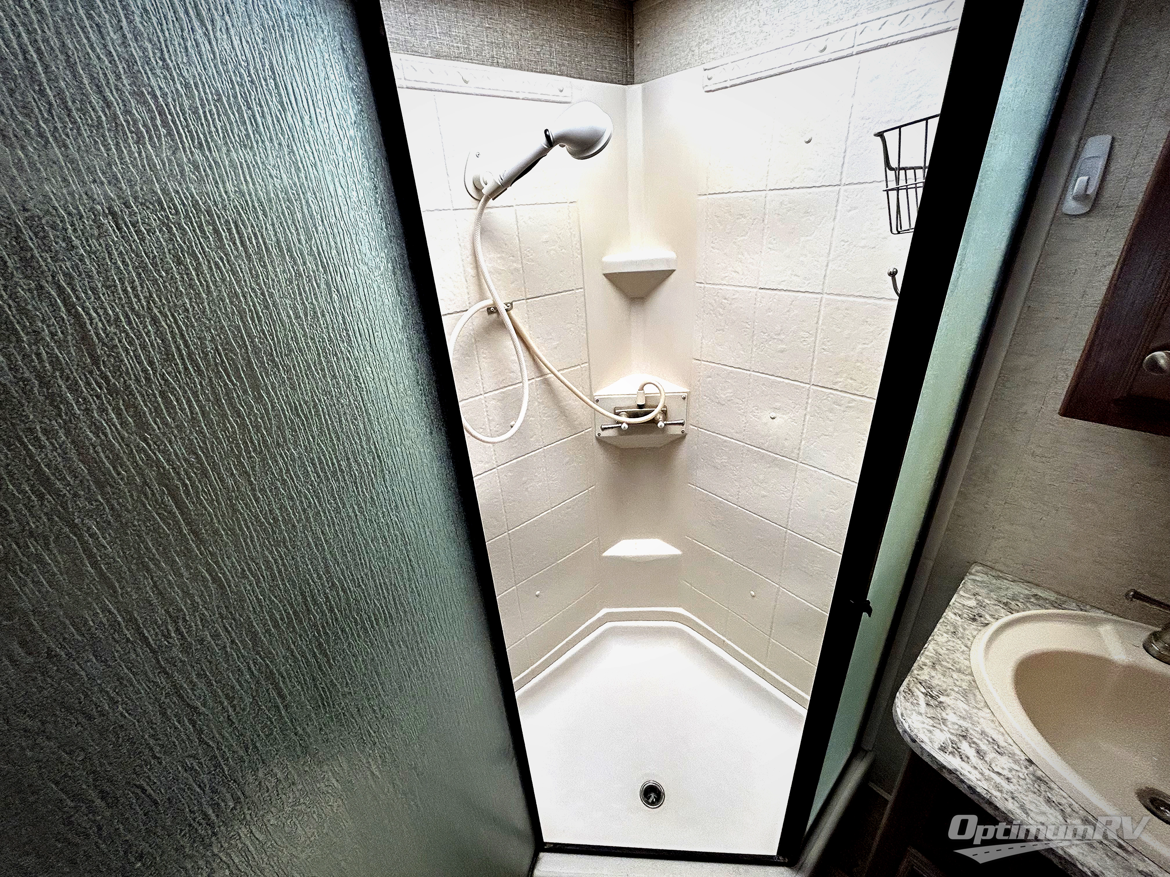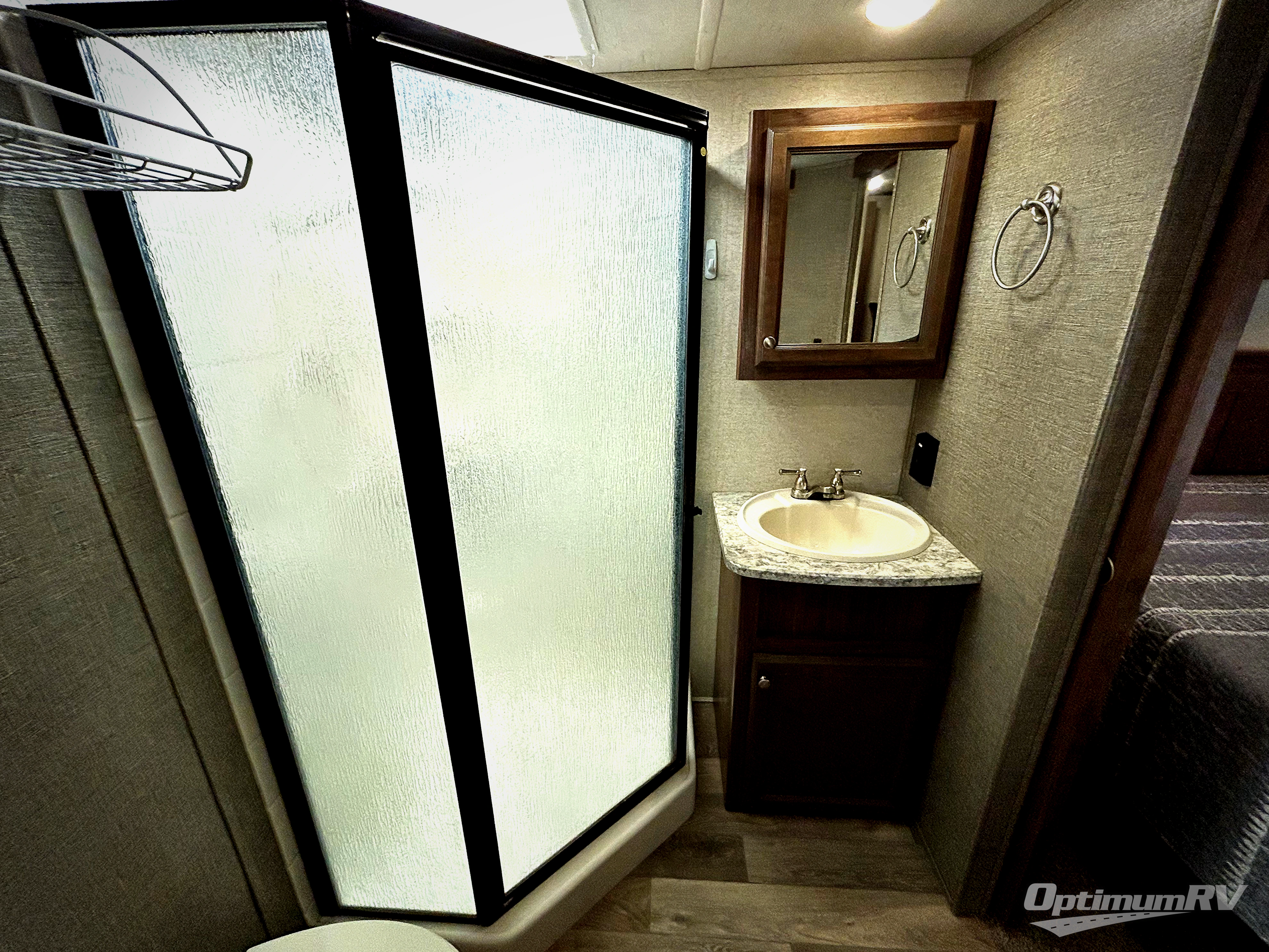 Step inside model 38RSRT and be completely amazed at what you find inside. Head up the steps to the right of the main side entry door and see a full bath at the top of the steps on your left. It includes an angled shower, toilet, and sink.