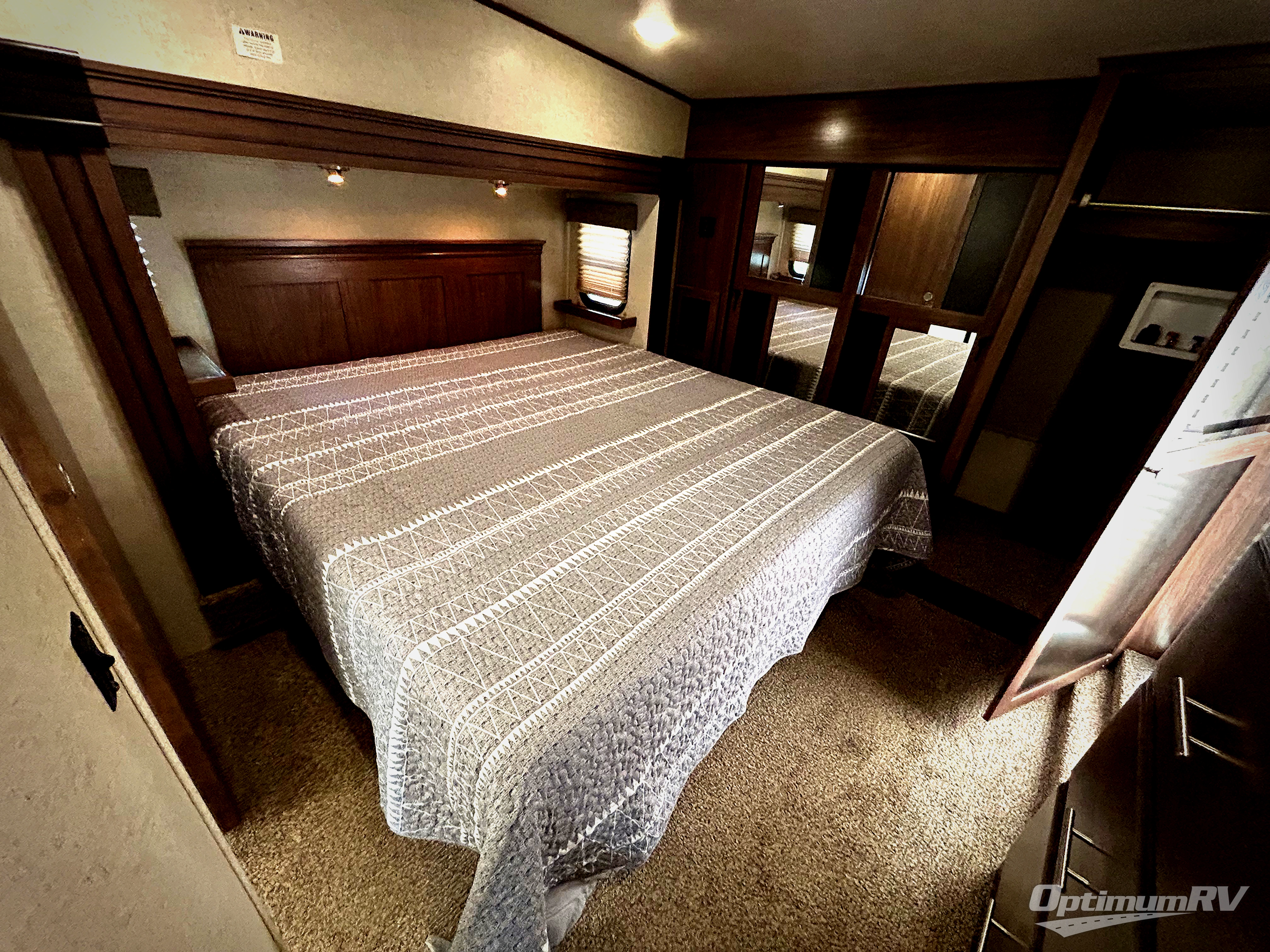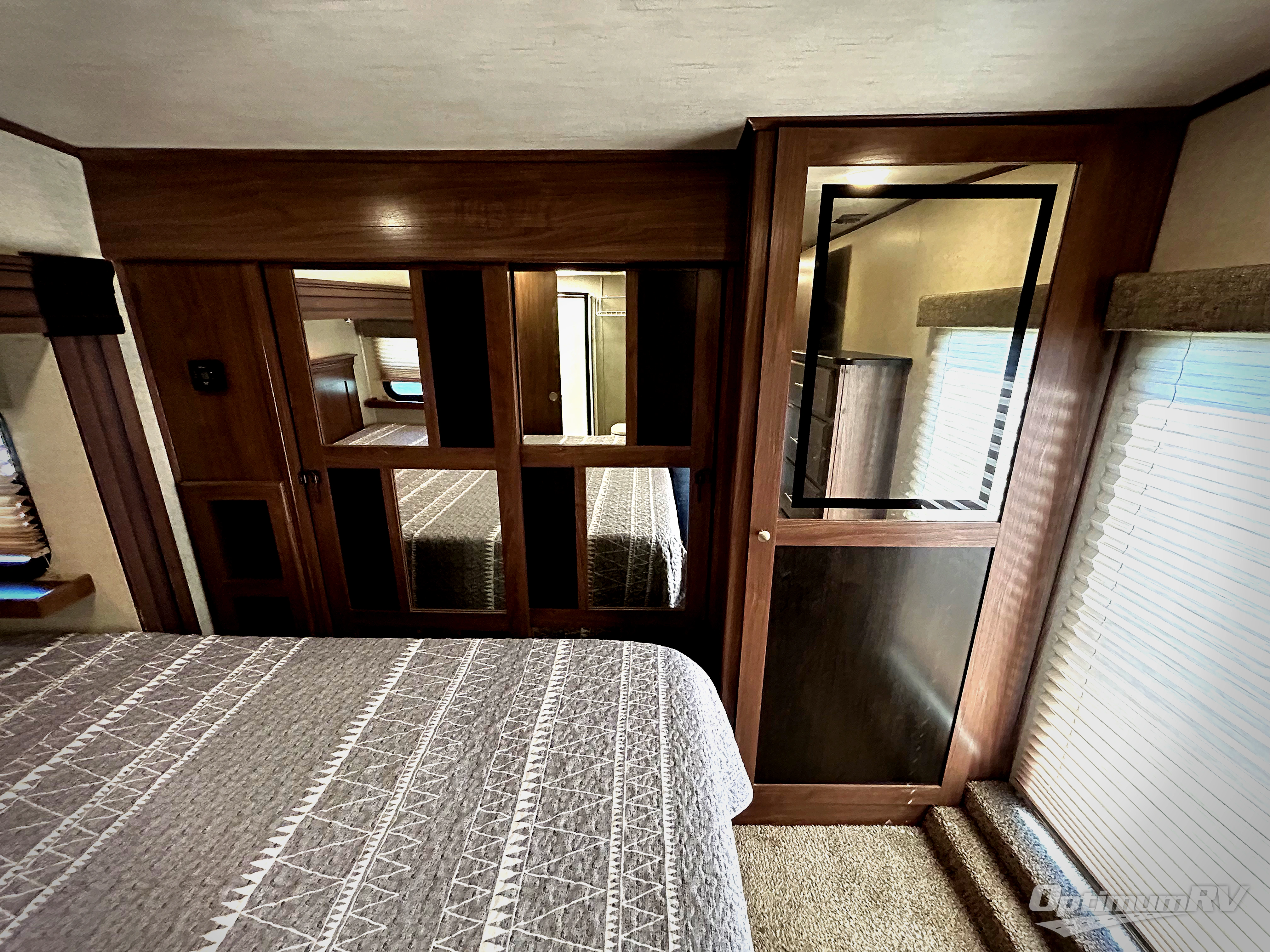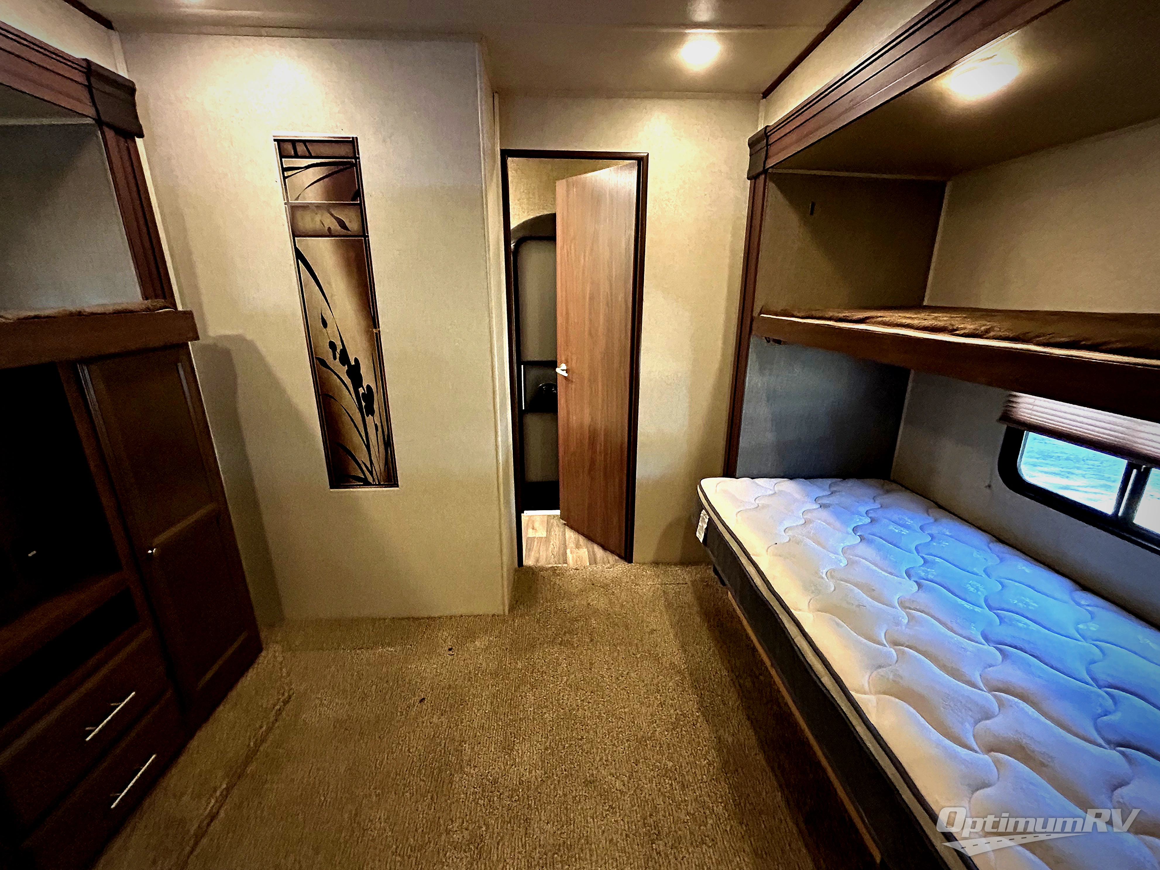 The front bedroom features a king size bed slide with upgraded pillow-top mattress, or optional queen. There is a dresser along the opposite wall of the bed, and a full front wardrobe with sliding doors for all of your hanging clothes.