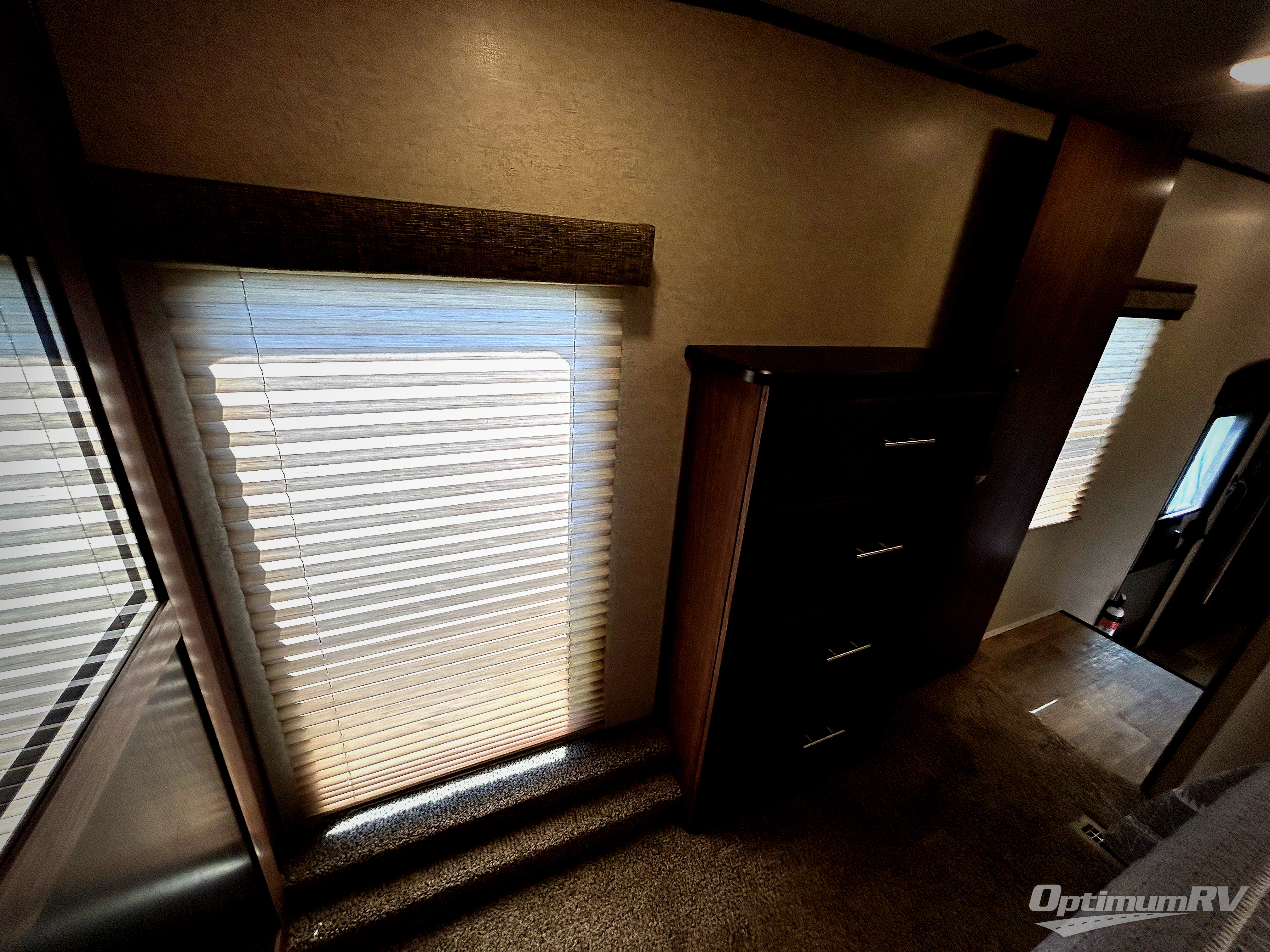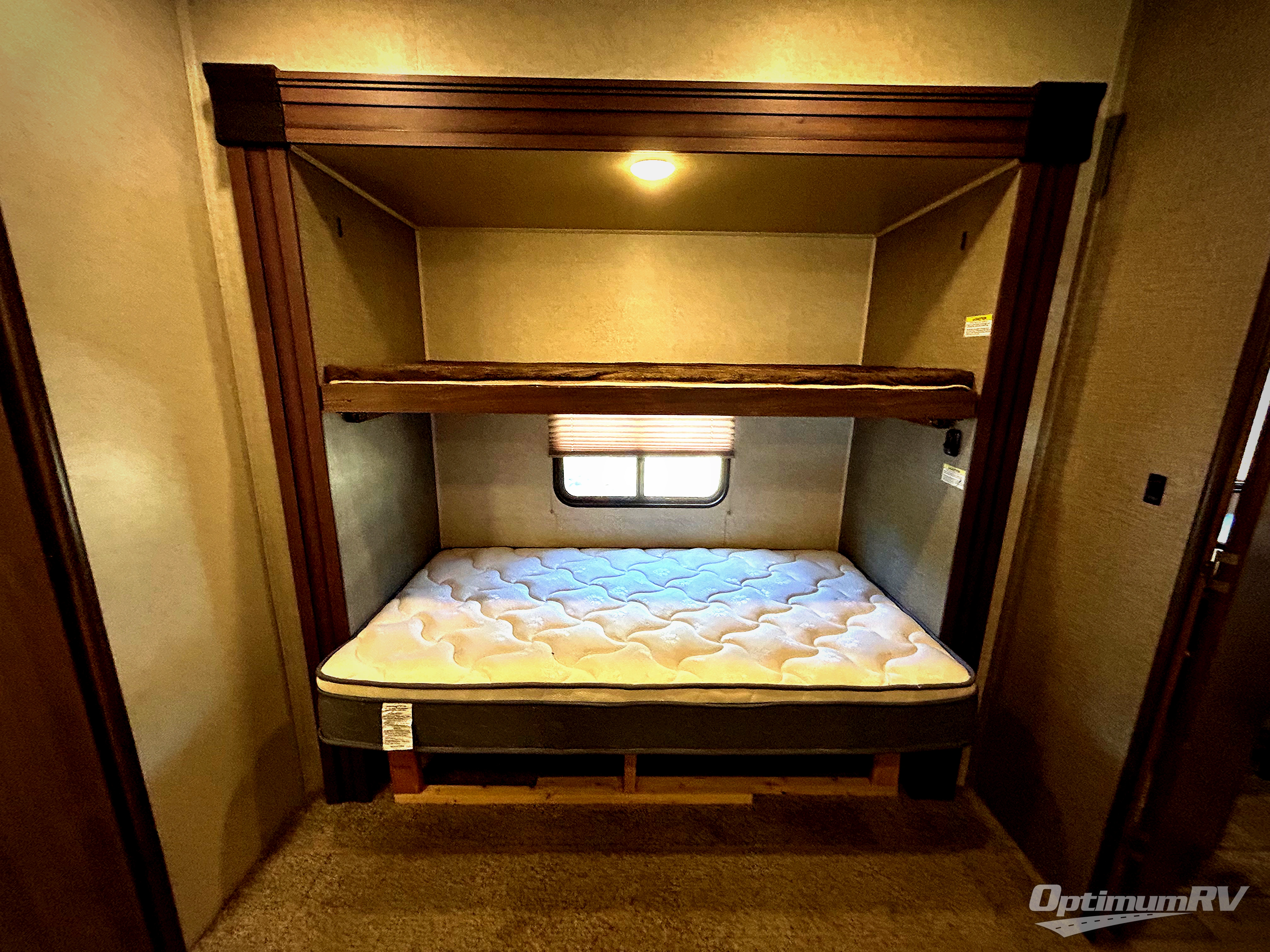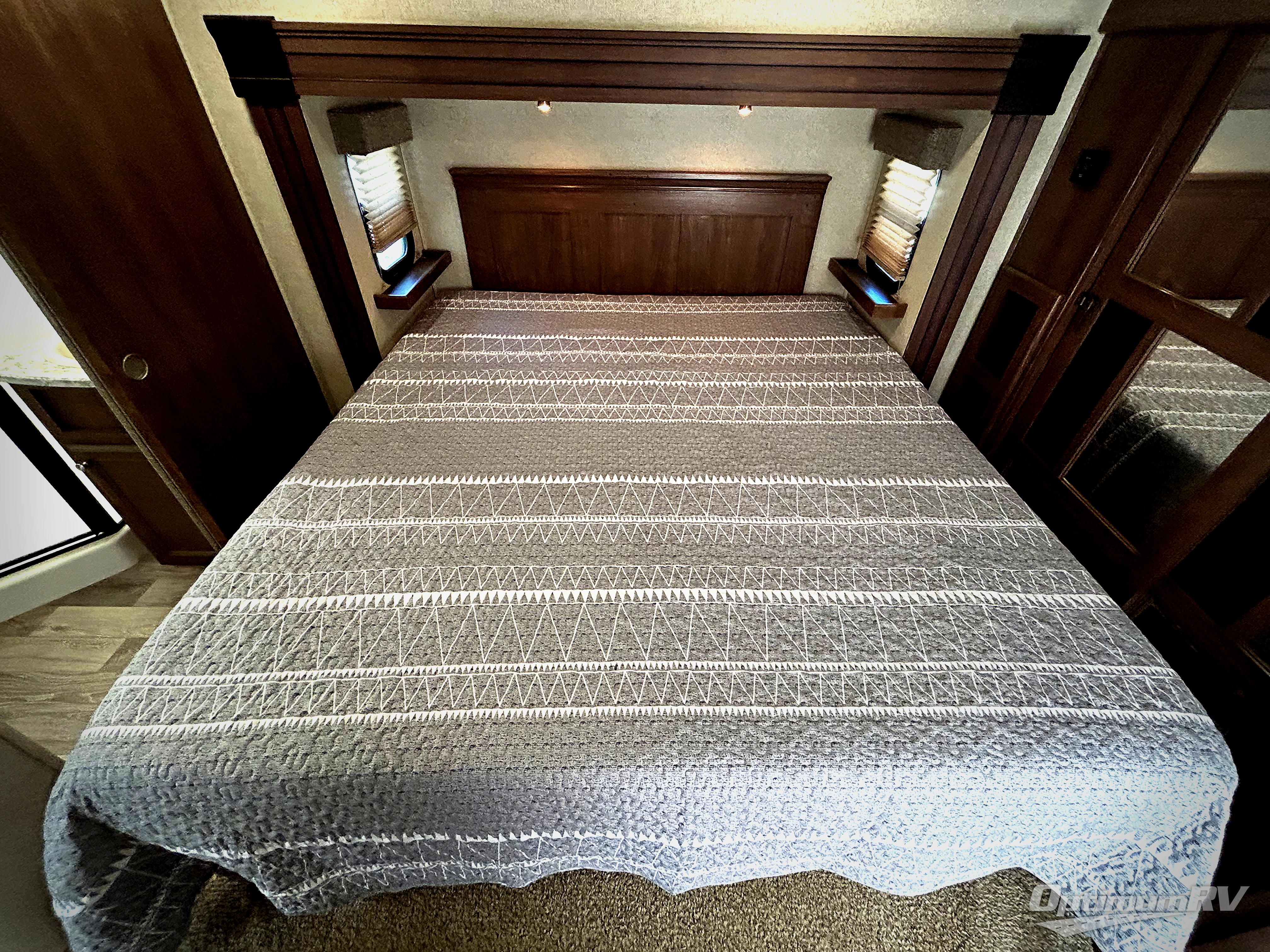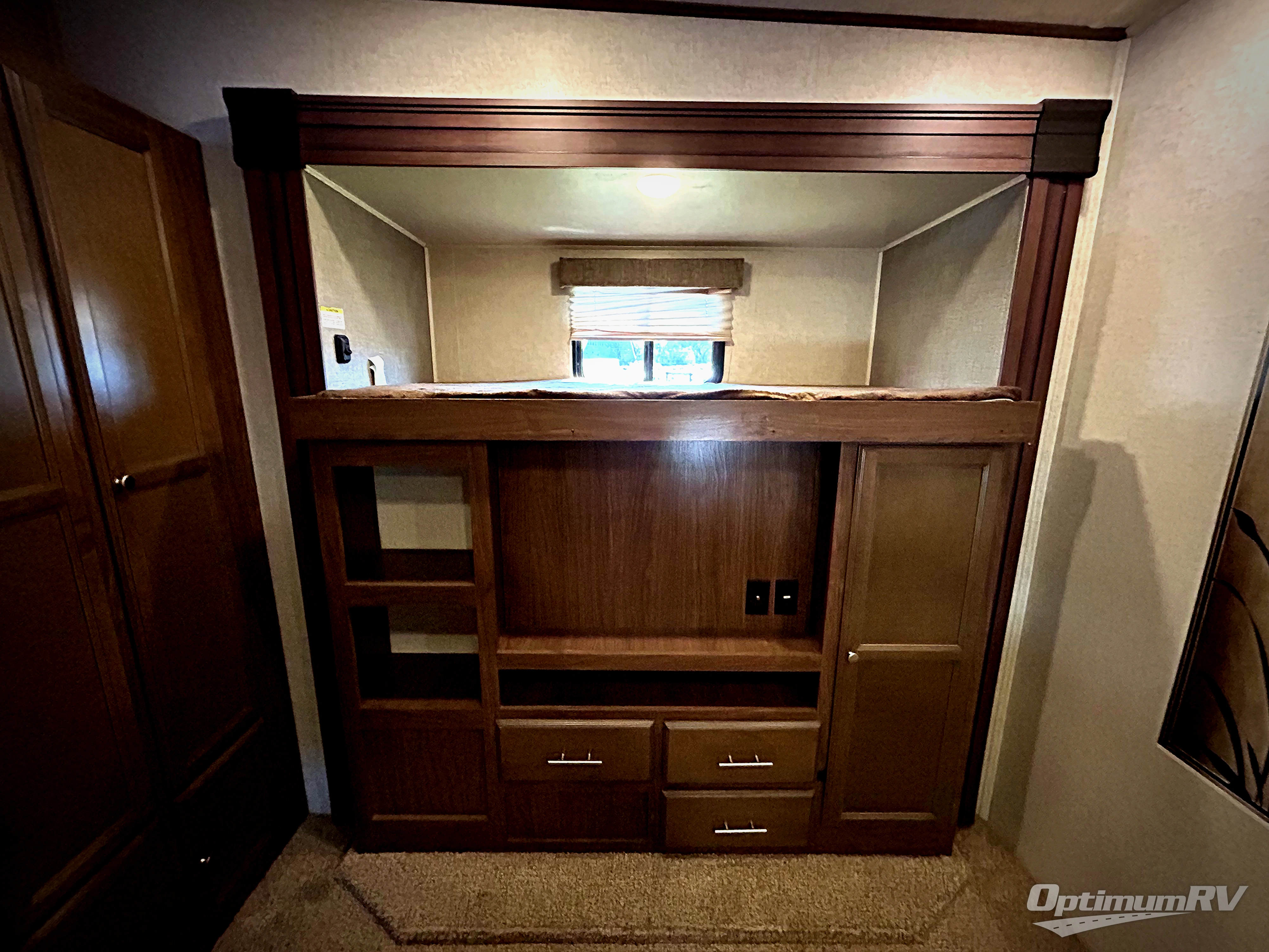 The front bedroom features a king size bed slide with upgraded pillow-top mattress, or optional queen. There is a dresser along the opposite wall of the bed, and a full front wardrobe with sliding doors for all of your hanging clothes.