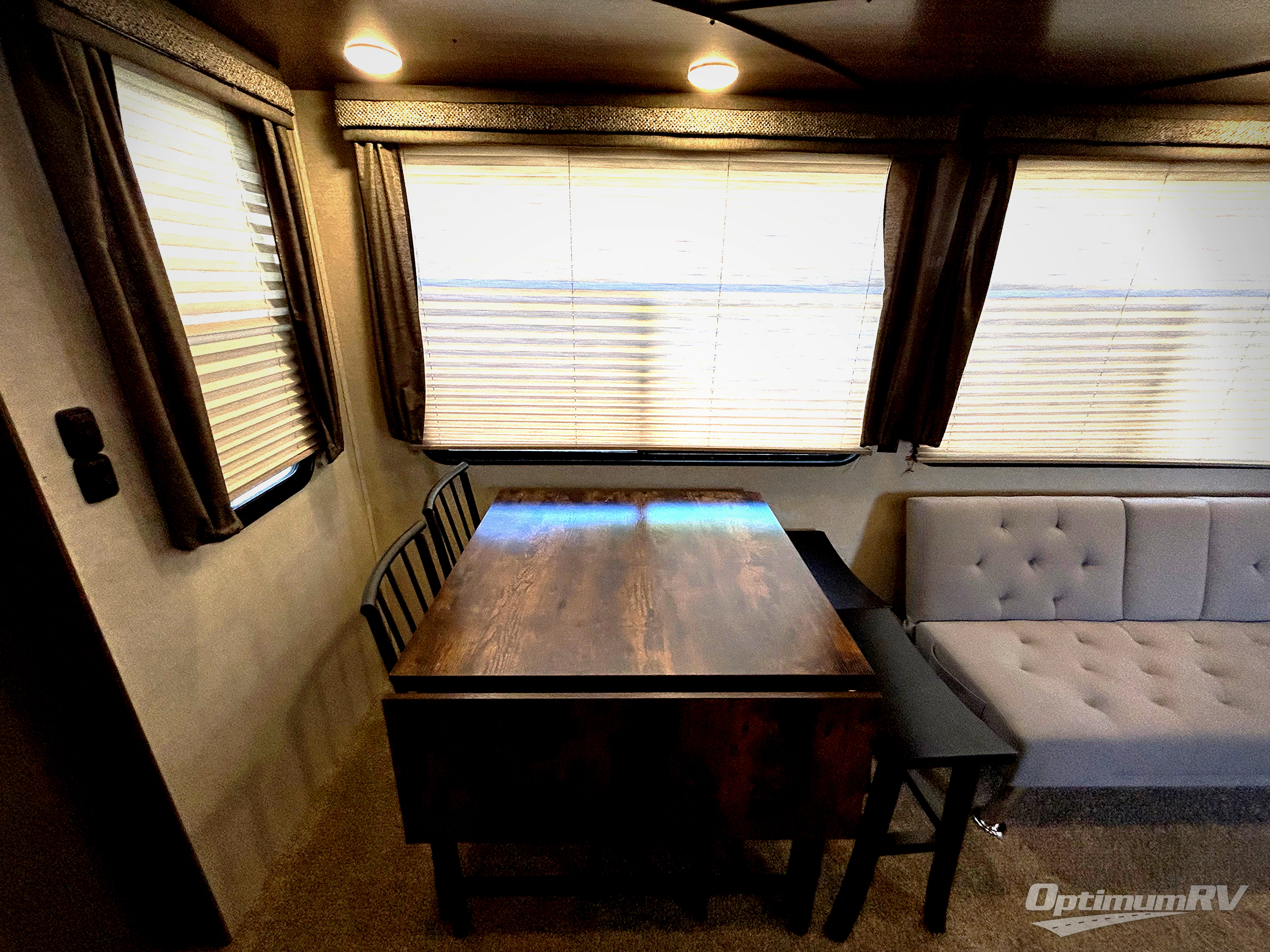 The slide opposite the door side offers a salon style booth dinette and sofa combo for plenty of seating during meals and just hanging out.