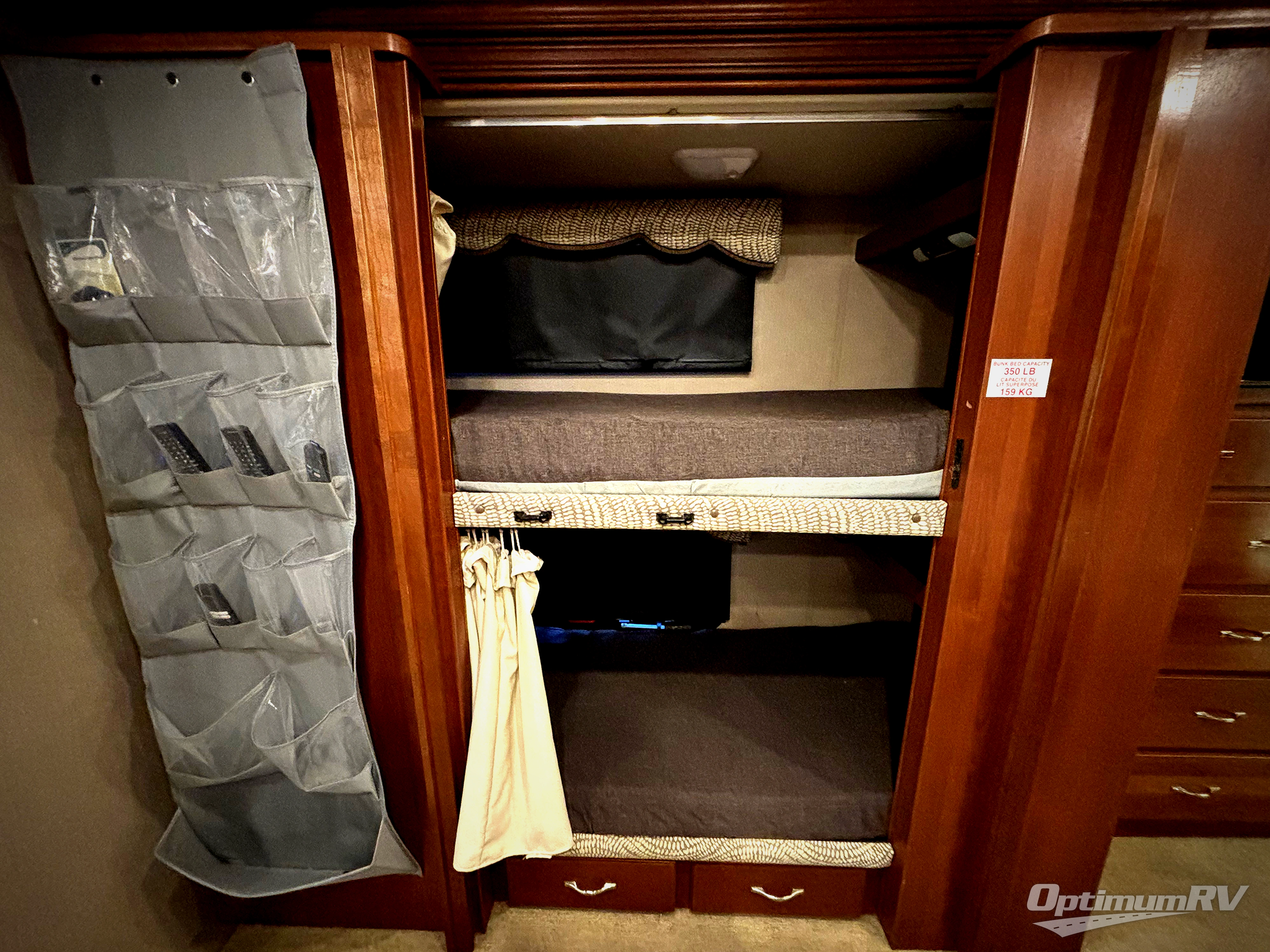 Continue on back and a second slide out increases the rear half of this Vacationer with slide out bunk beds, as well as the master bedroom storage wardrobe and dresser space. There is a half bath opposite the bunks for conveniences, plus easy access from the front of the coach. Inside the half bath find a toilet and vanity with sink, plus an overhead medicine cabinet.