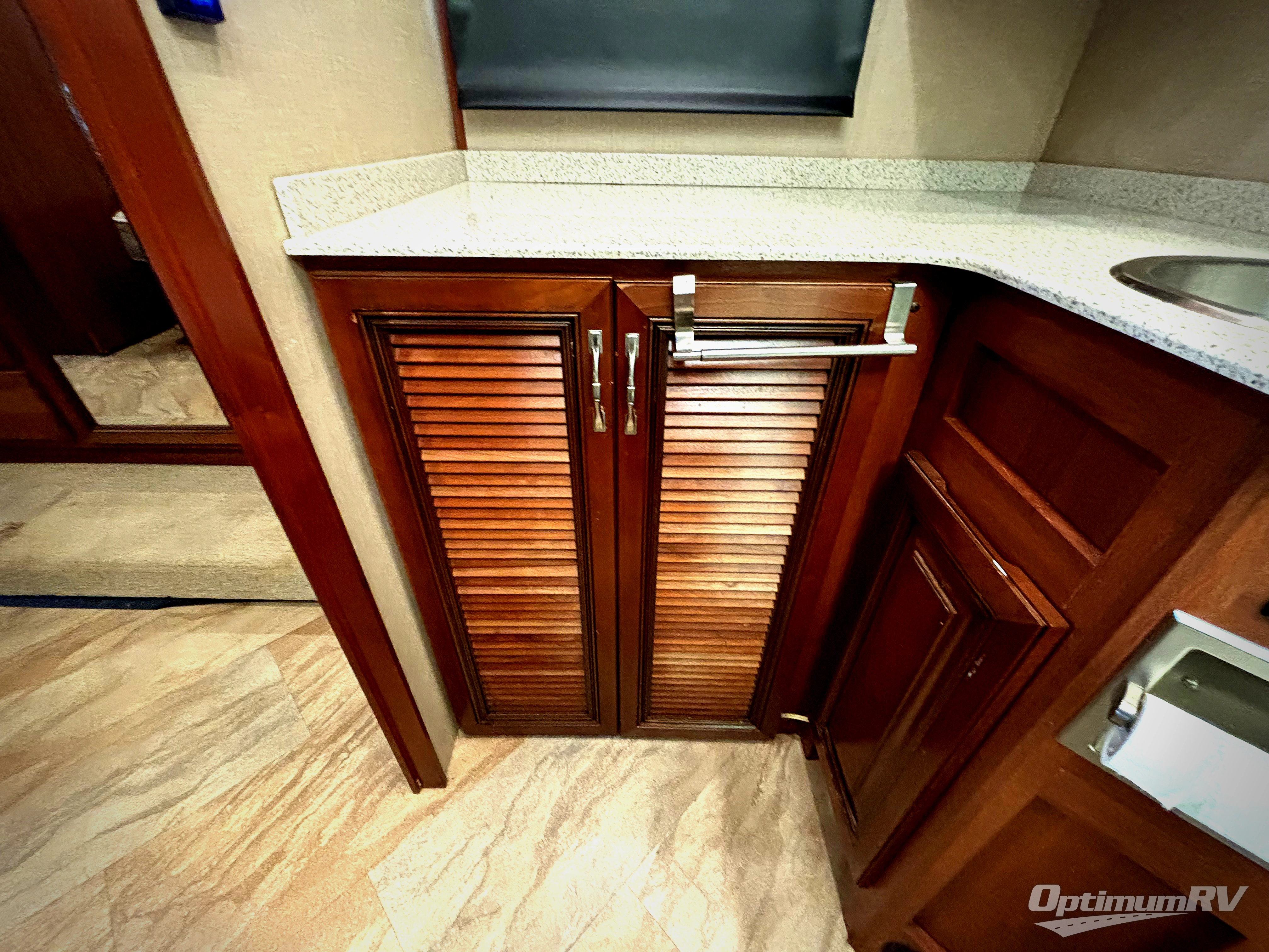 Along the curb side you will find a kitchen area that allows you to easily cook and prepare food along your journey. You will find a double sink, a three burner range with overhead microwave oven, refrigerator, and food pantry. There are also ample overhead cabinets for all of your dishes and things needed.