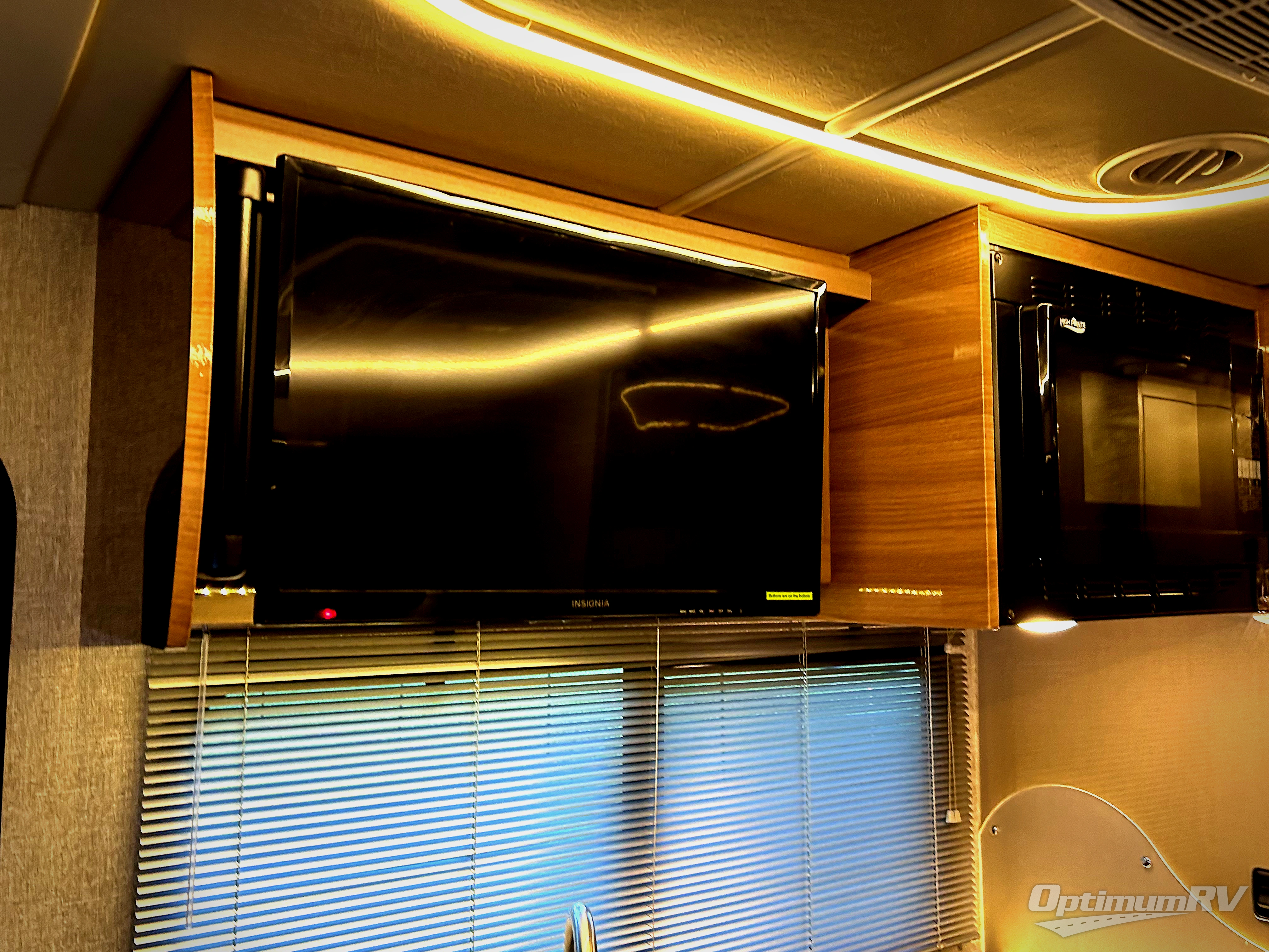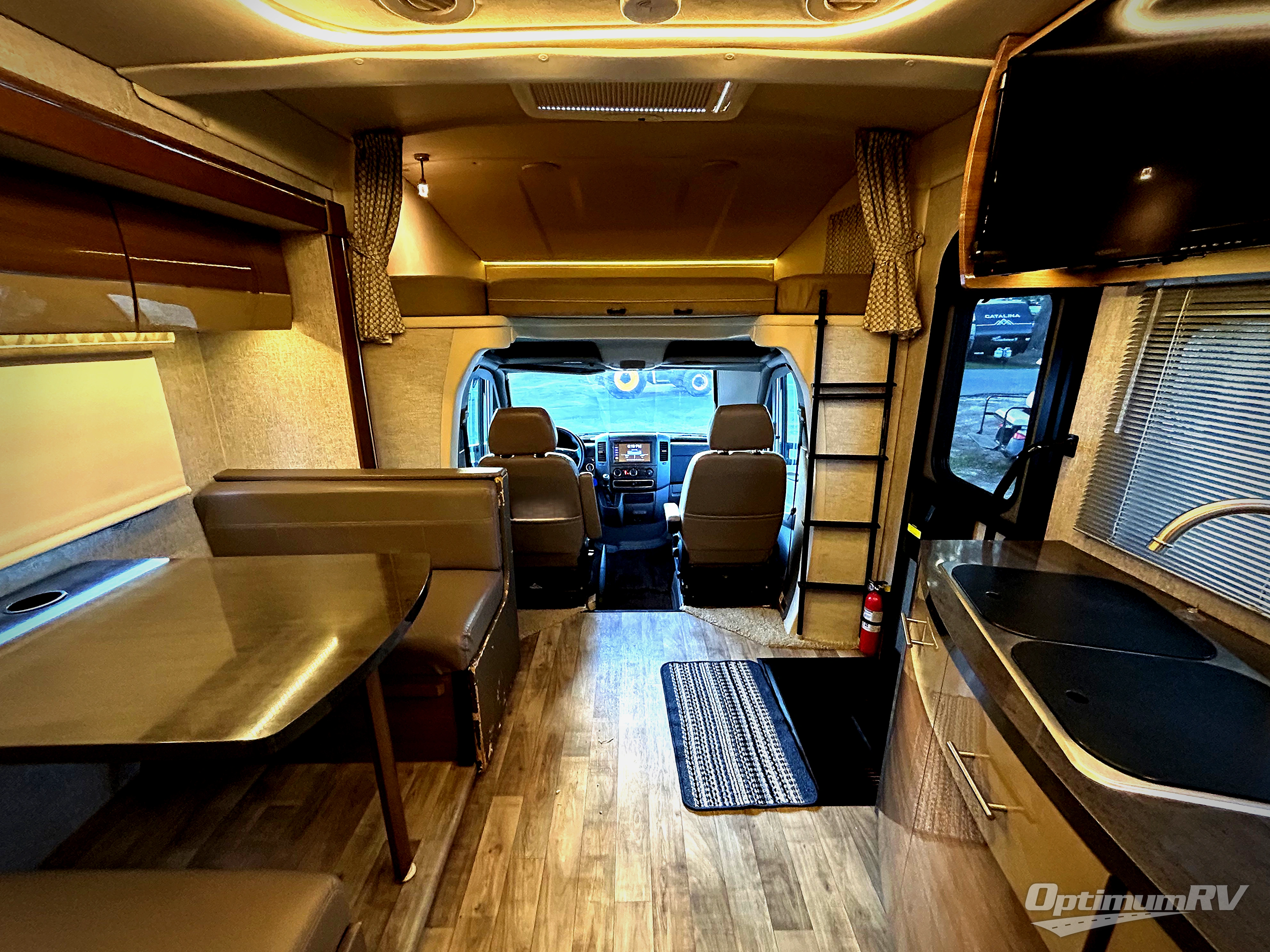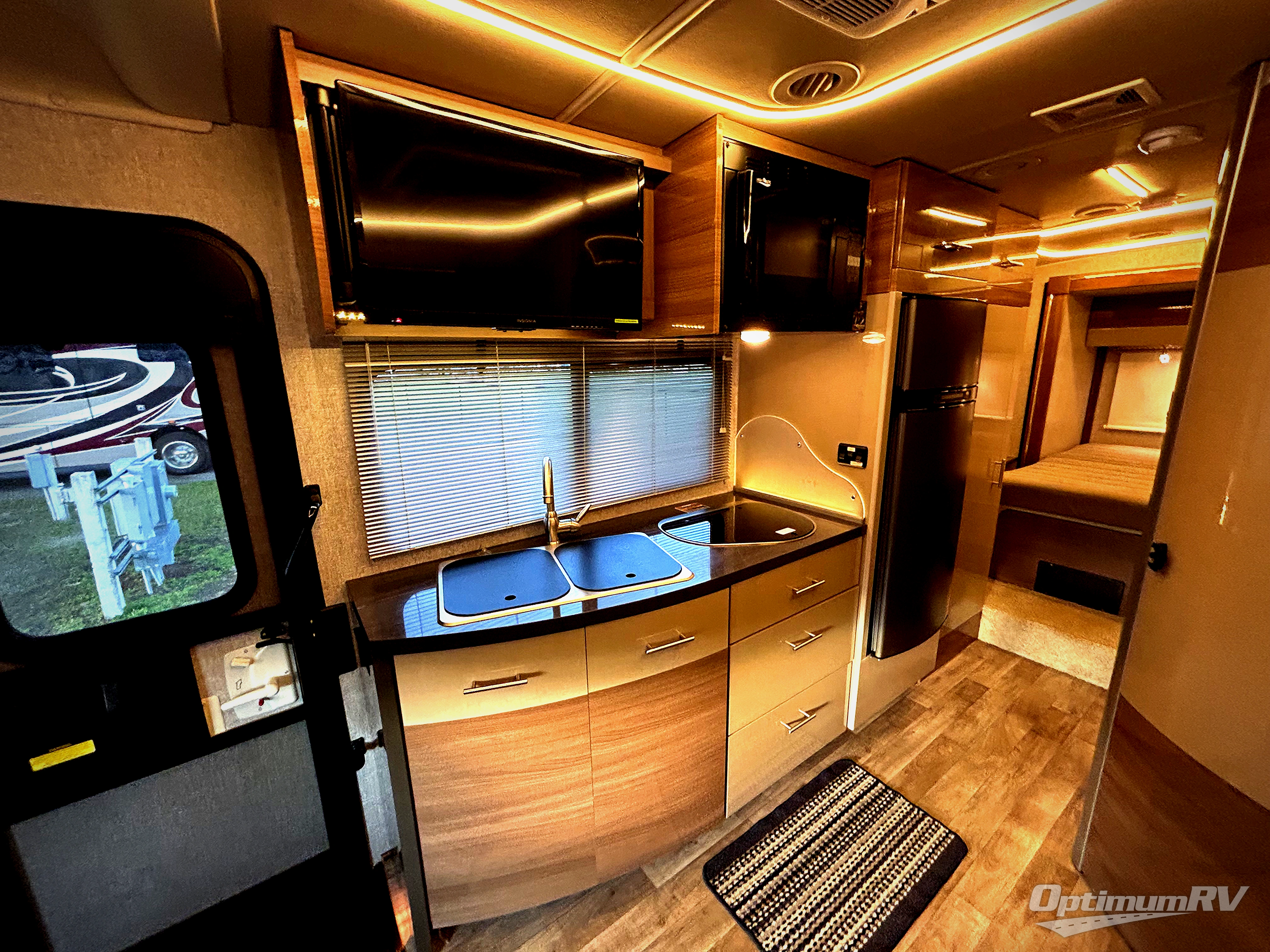 The kitchen area is to the left of the entry door and features a double sink, a two burner cook-top, and refrigerator. You will also find plenty of overhead cabinets for storage too. Above the sink area is where you will find a 28" HDTV for viewing when seated at the dinette opposite.