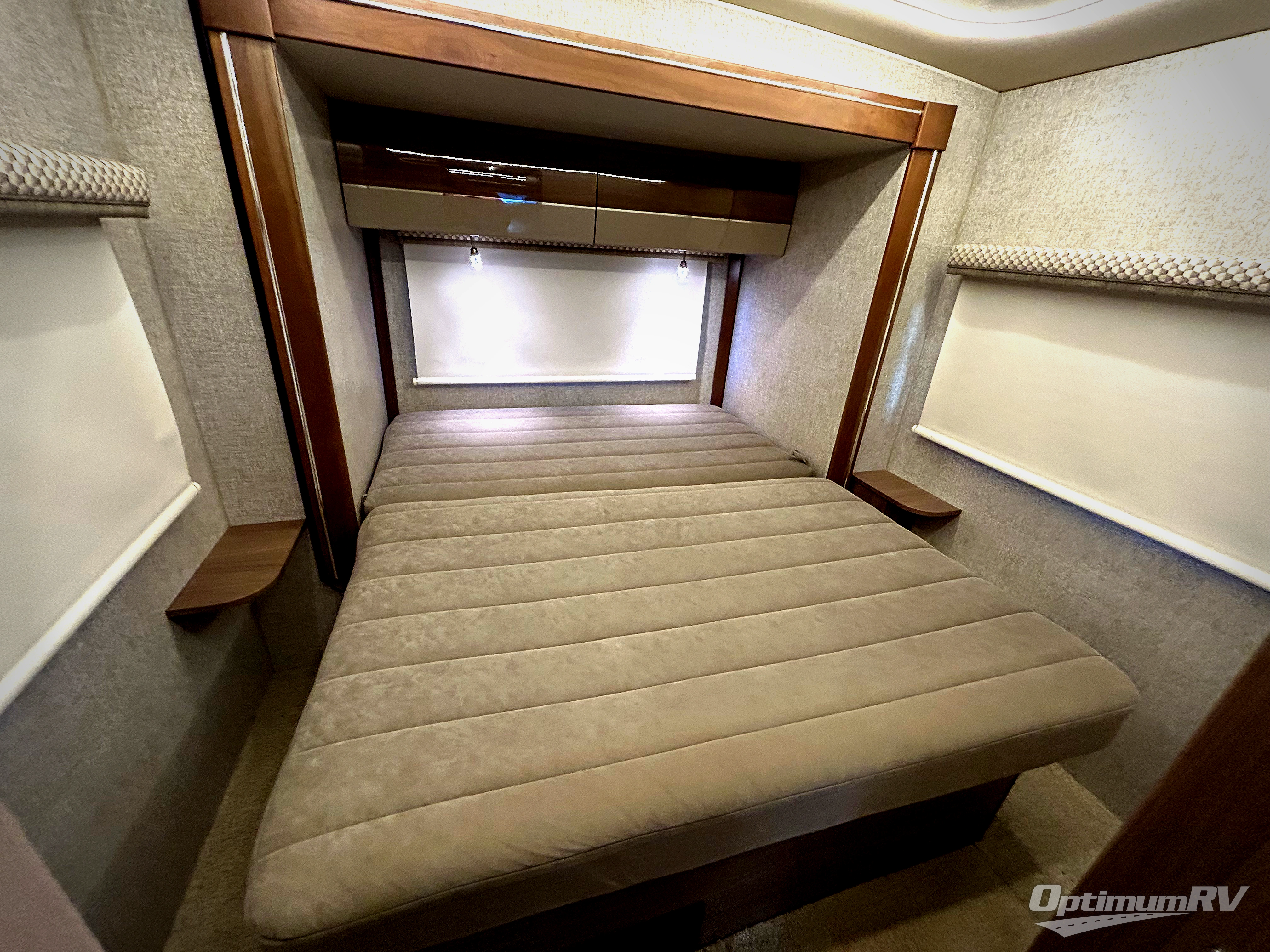 The rear bedroom in model 24G features a slide out rear queen sized bed with overhead storage cabinets for your things. There is also a spot to mount an optional flat screen 24" HDTV in the bedroom just off the foot of the bed along the wall.