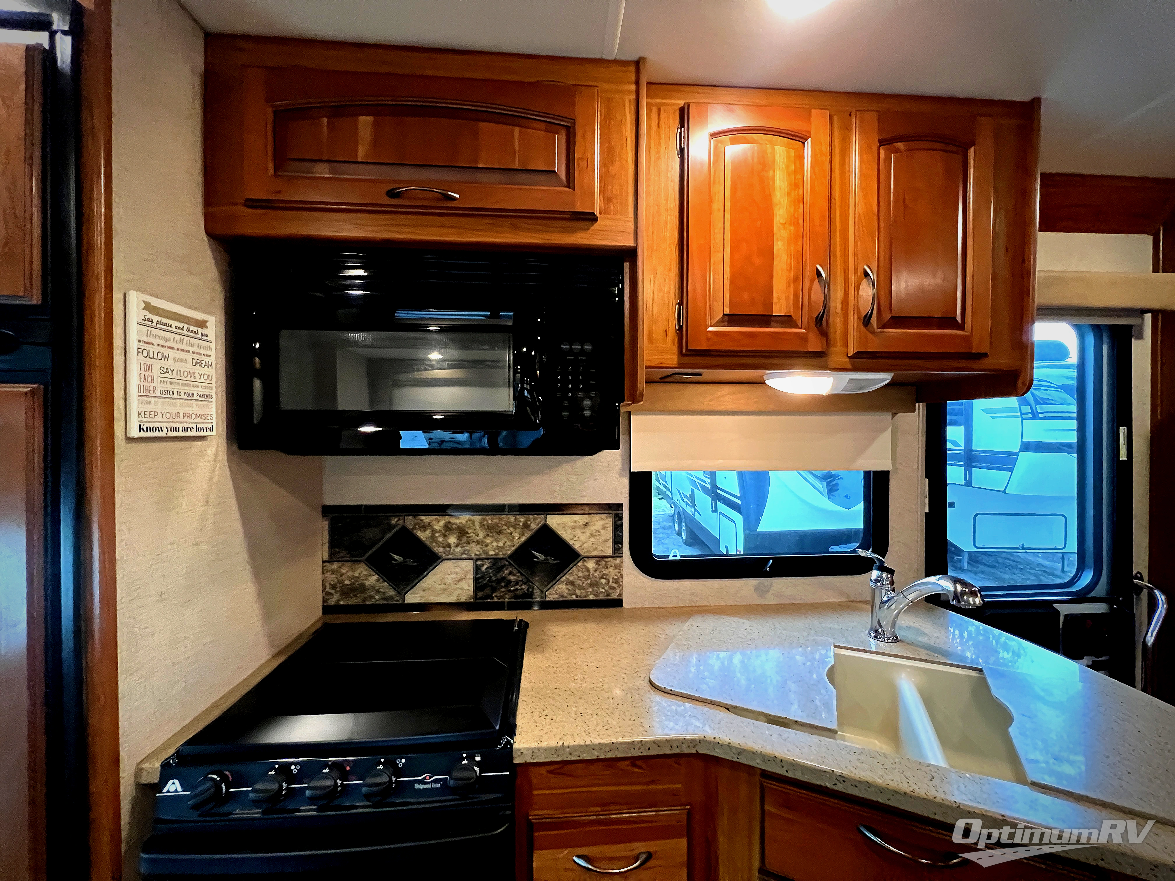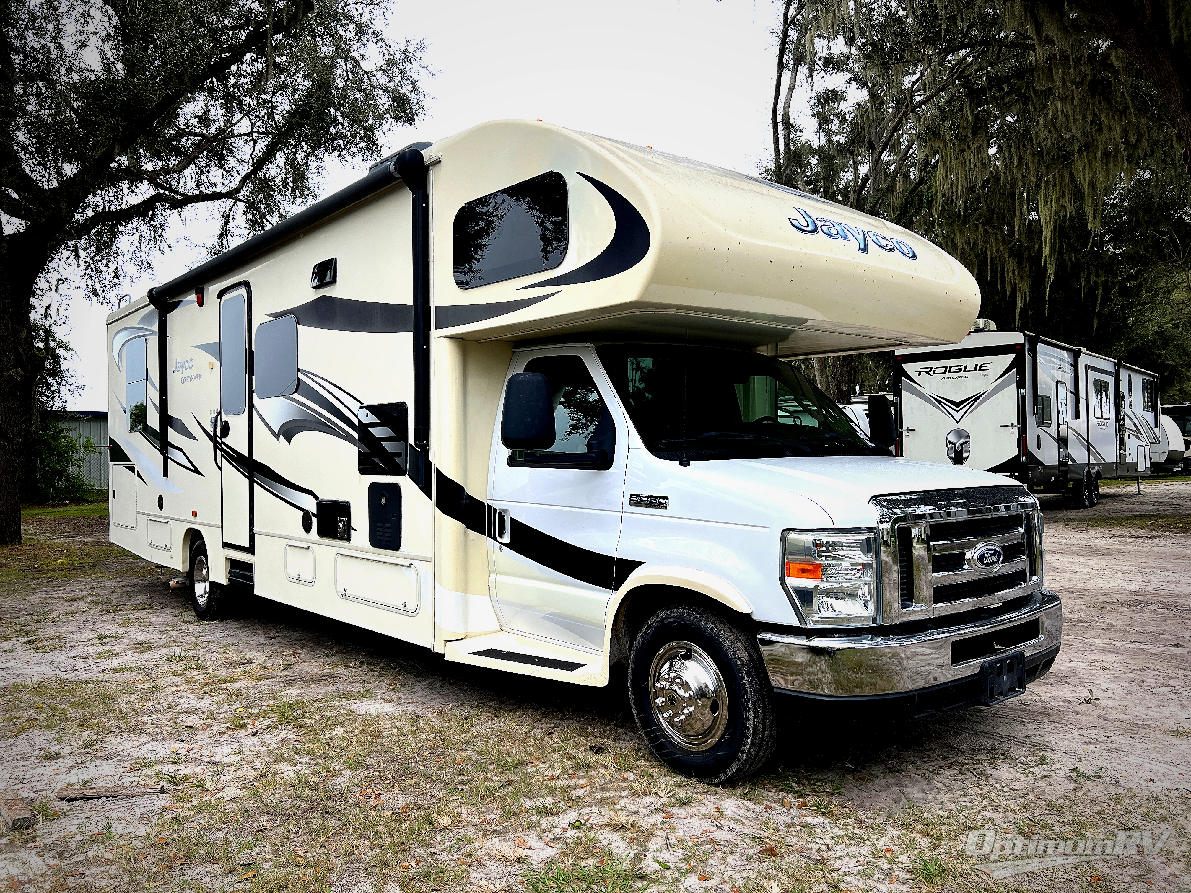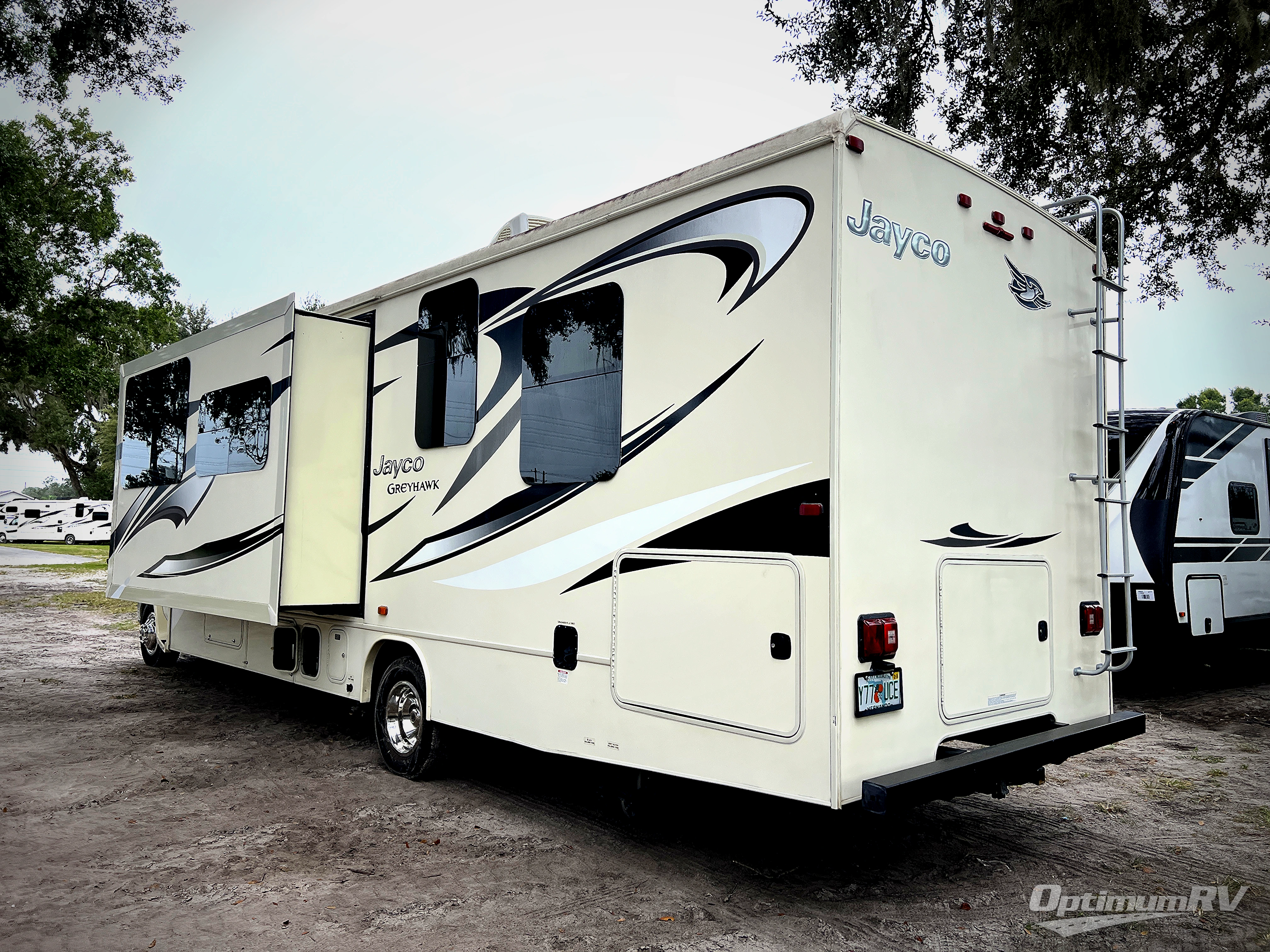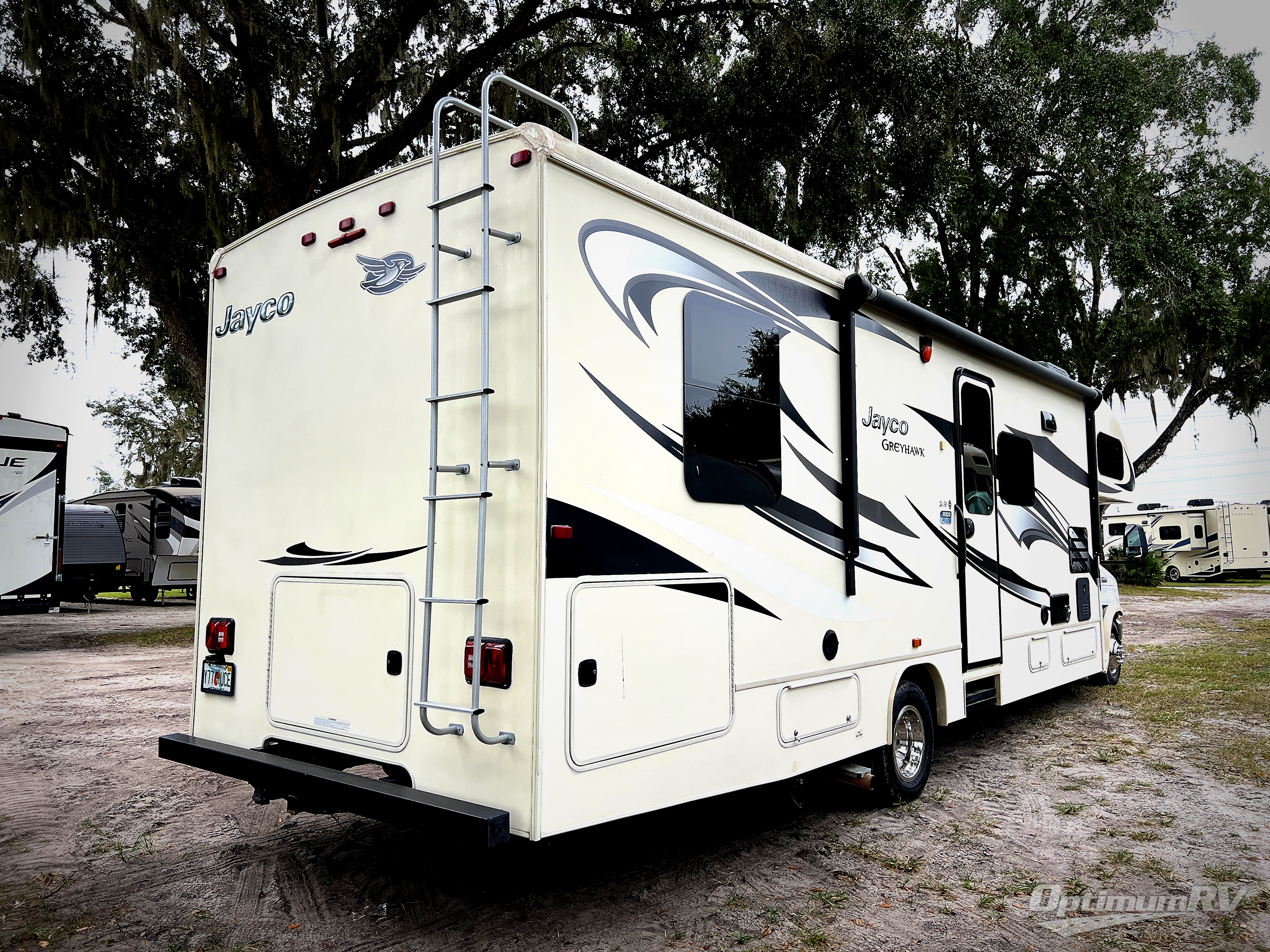 Starting in the rear of the 31FK Greyhawk motor home by Jayco, you will be in the bedroom. You will find a wardrobe, queen bed, nightstand, and a corner TV cabinet.