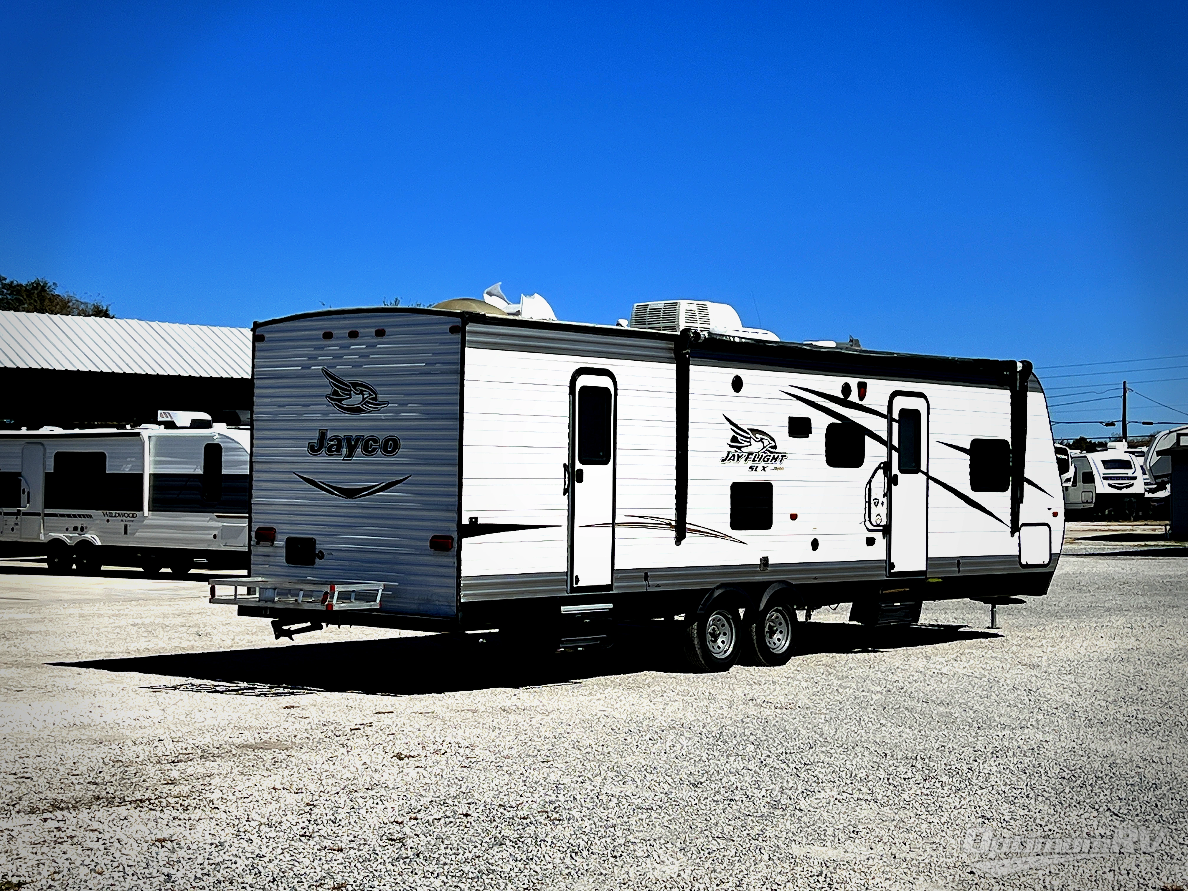 The single slide Jay Flight SLX 287BHSW travel trailer by Jayco features a rear set of bunk beds, a single slide, and two entry doors!