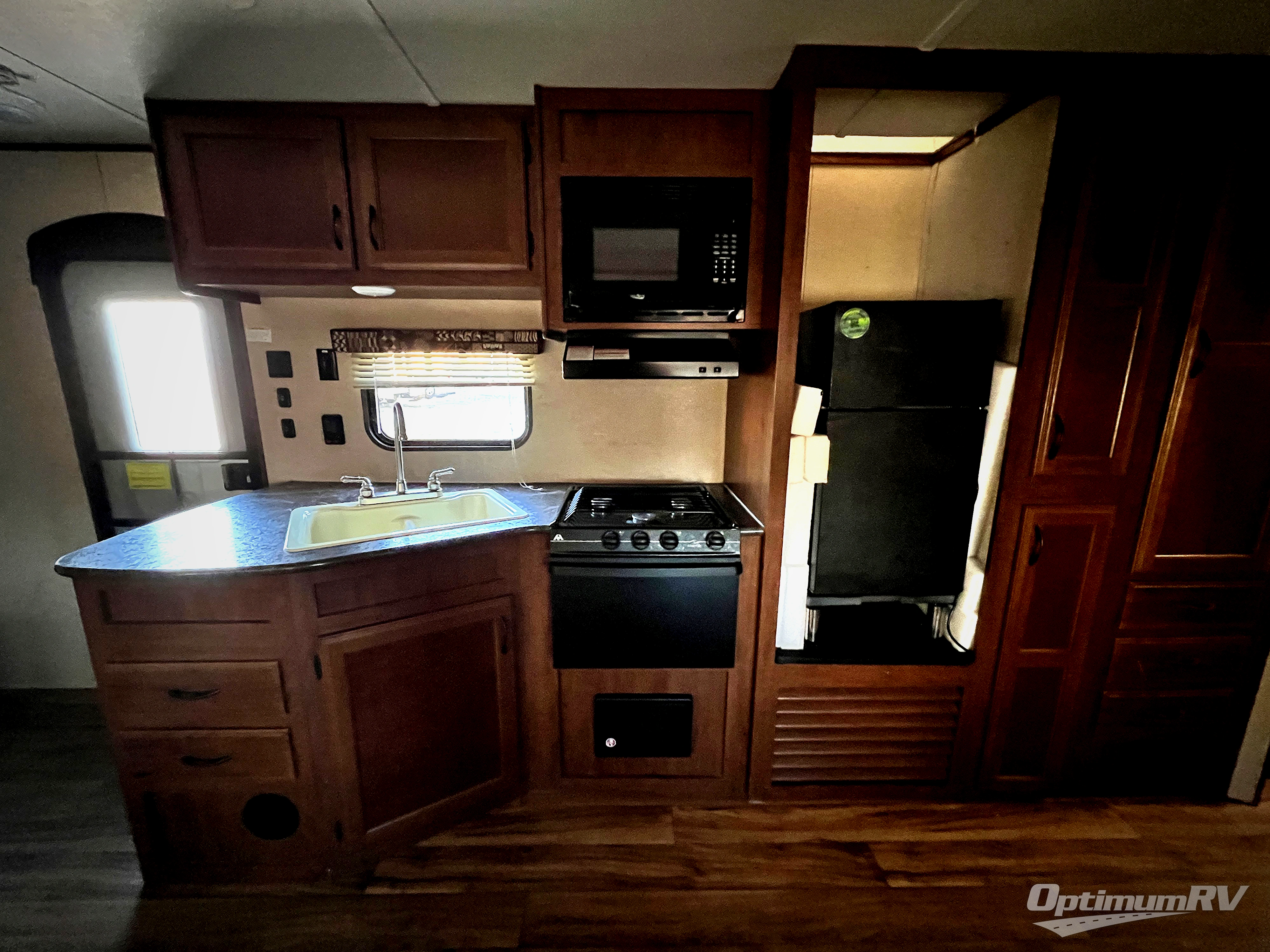As you enter the travel trailer, to the left you will find an angled double kitchen sink, three burner range, refrigerator, pantry, and wardrobe. The opposite side of the trailer has a slide with a u-dinette and sofa. Next to the slide you will find an entertainment center and a bench/storage.