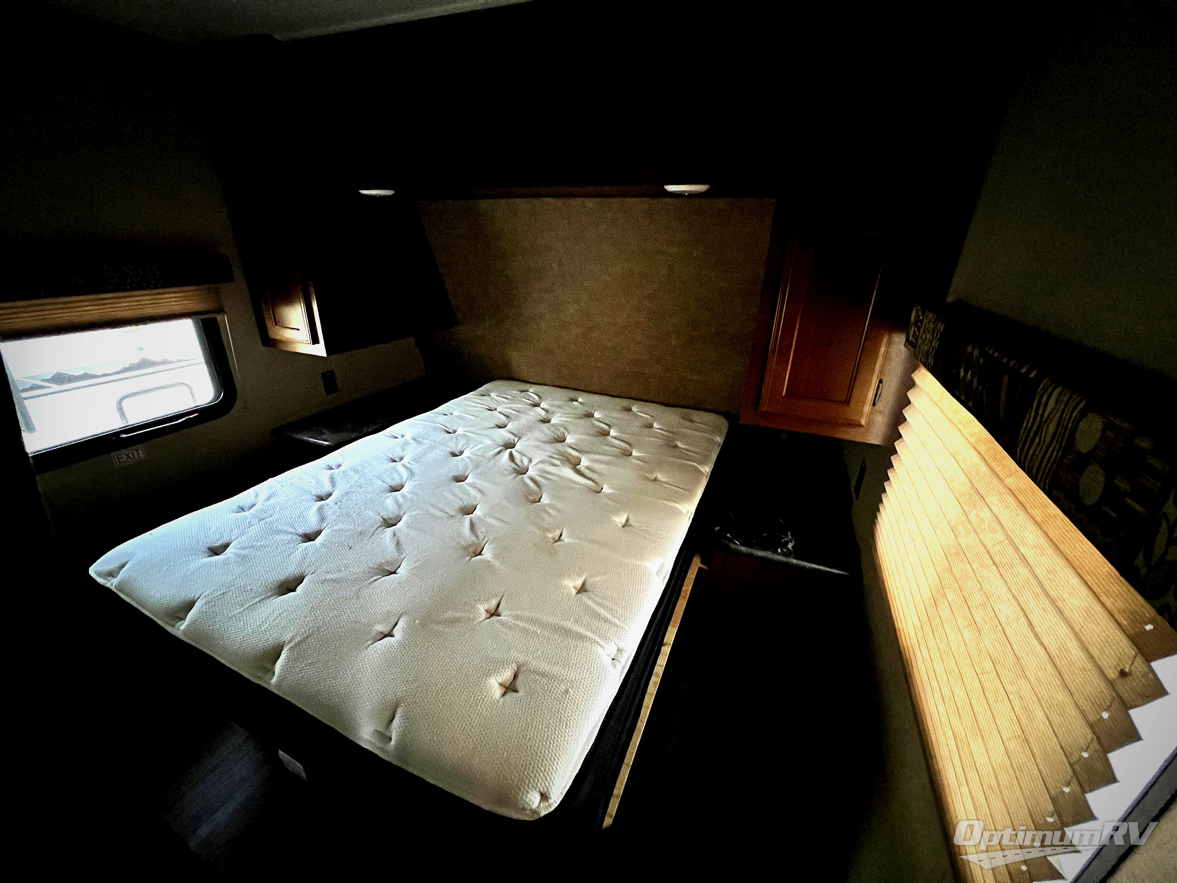 In the front bedroom there is a queen bed with wardrobes on either side of the bed, and a shelf above the bed.