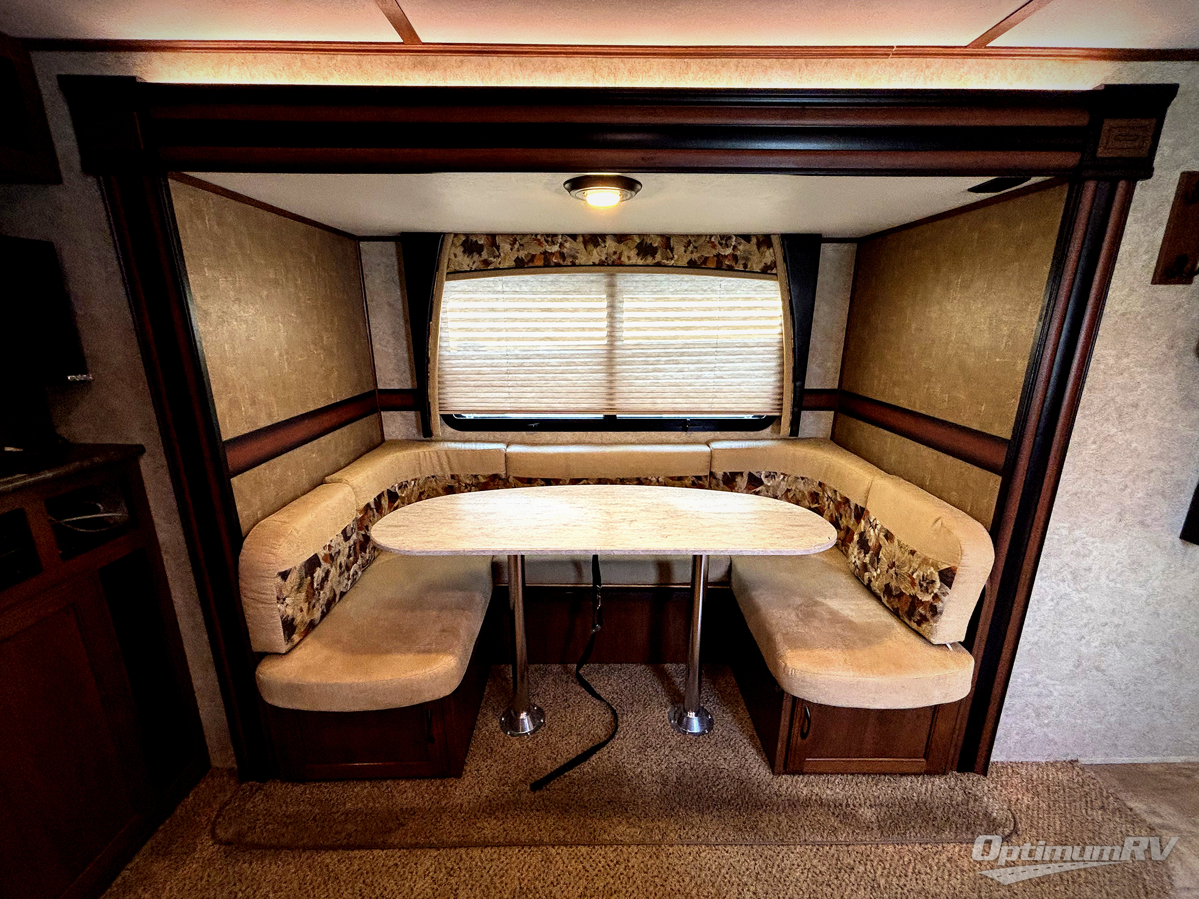 On the road side of the trailer, a slide out u-shape dinette offers added floor space when fully extended. The dinette is great for enjoying your meals at, and can easily be turned into additional sleeping space for the kids or overnight guests. A nearby TV base can easily be viewed from the sofa, bed, or dinette.