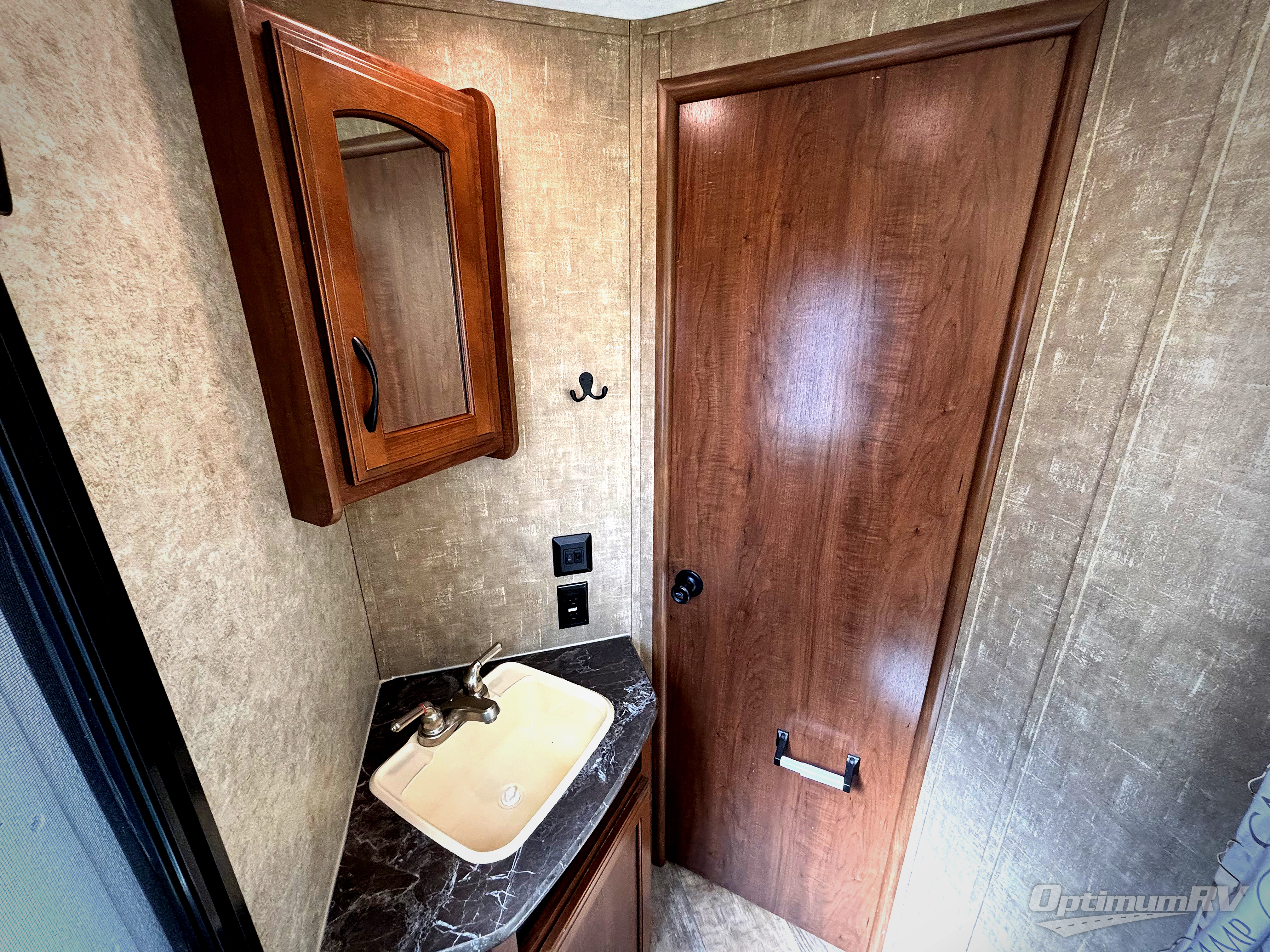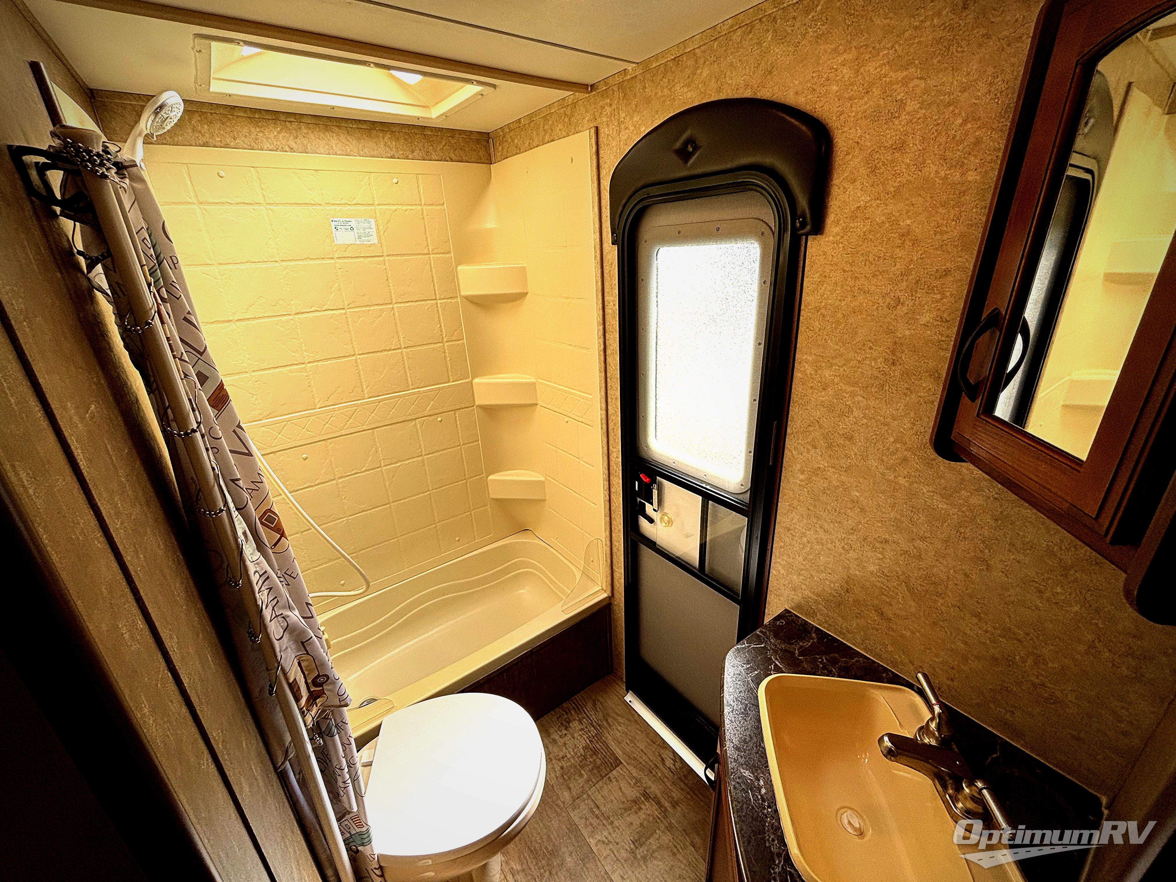 The rear of this unit offers a convenient bathroom including a tub/shower, toilet, and a sink. This bath features an second private entry/exit into the trailer.