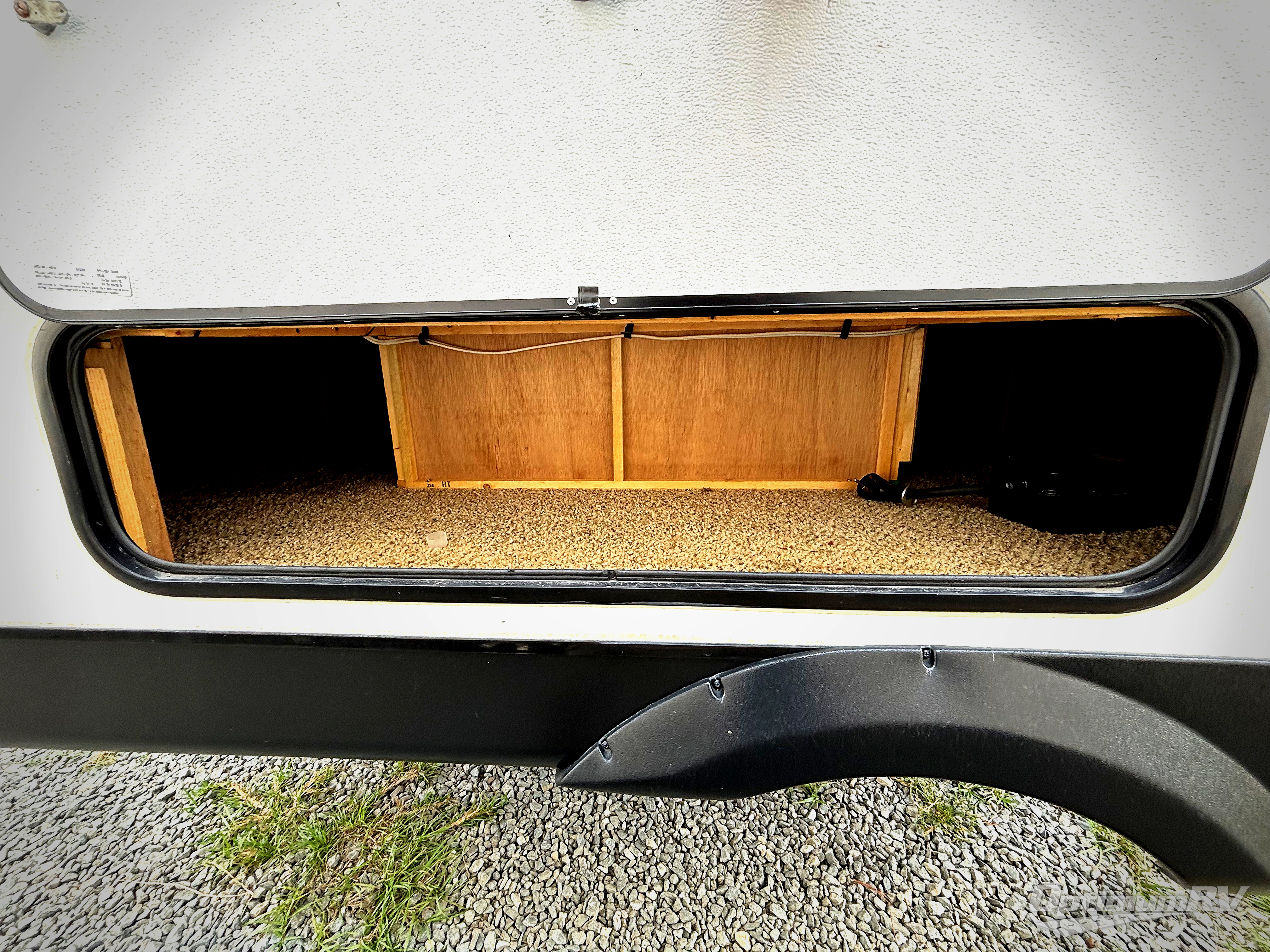 Head outside the main entry door to check out all of the storage in front on both sides of the trailer, plus storage on the slide out side. You will easily be able to stow away all of your outdoor camping gear.