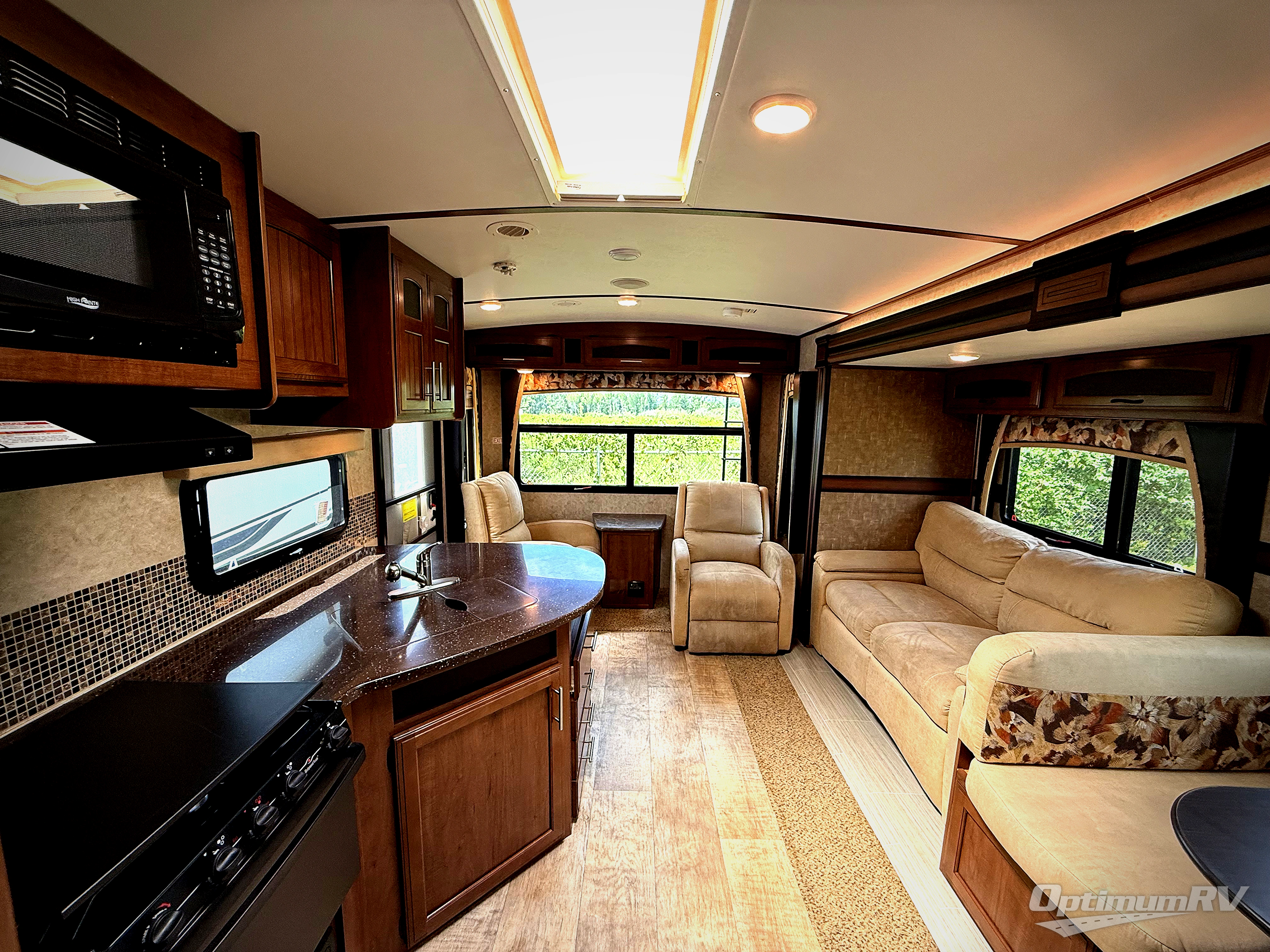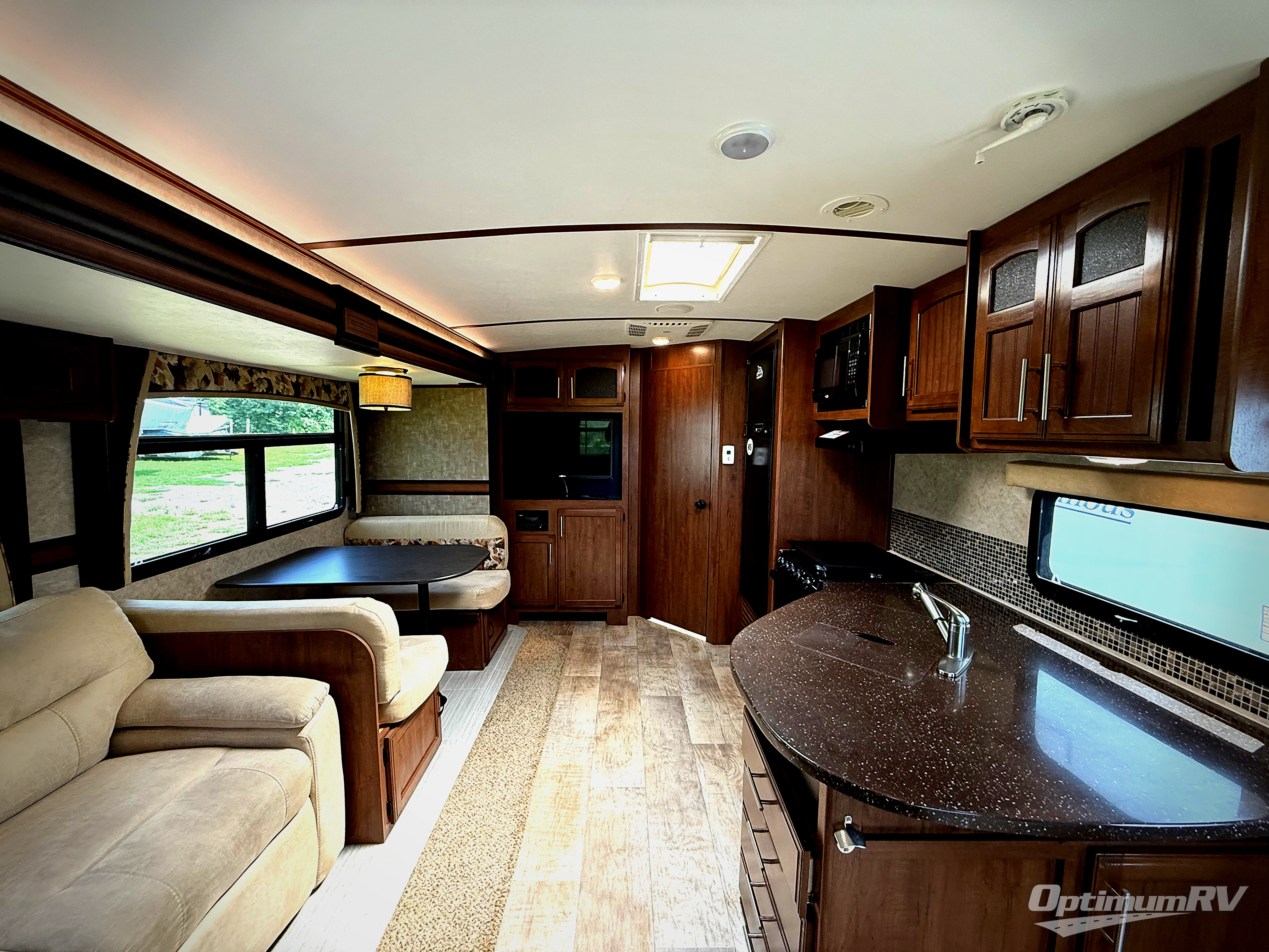 Stepping inside near the rear of the travel trailer, there are two lounge chairs and an end table. The road side slide has a hide-a-bed sofa and a booth dinette. Along the interior wall you will find the entertainment center.