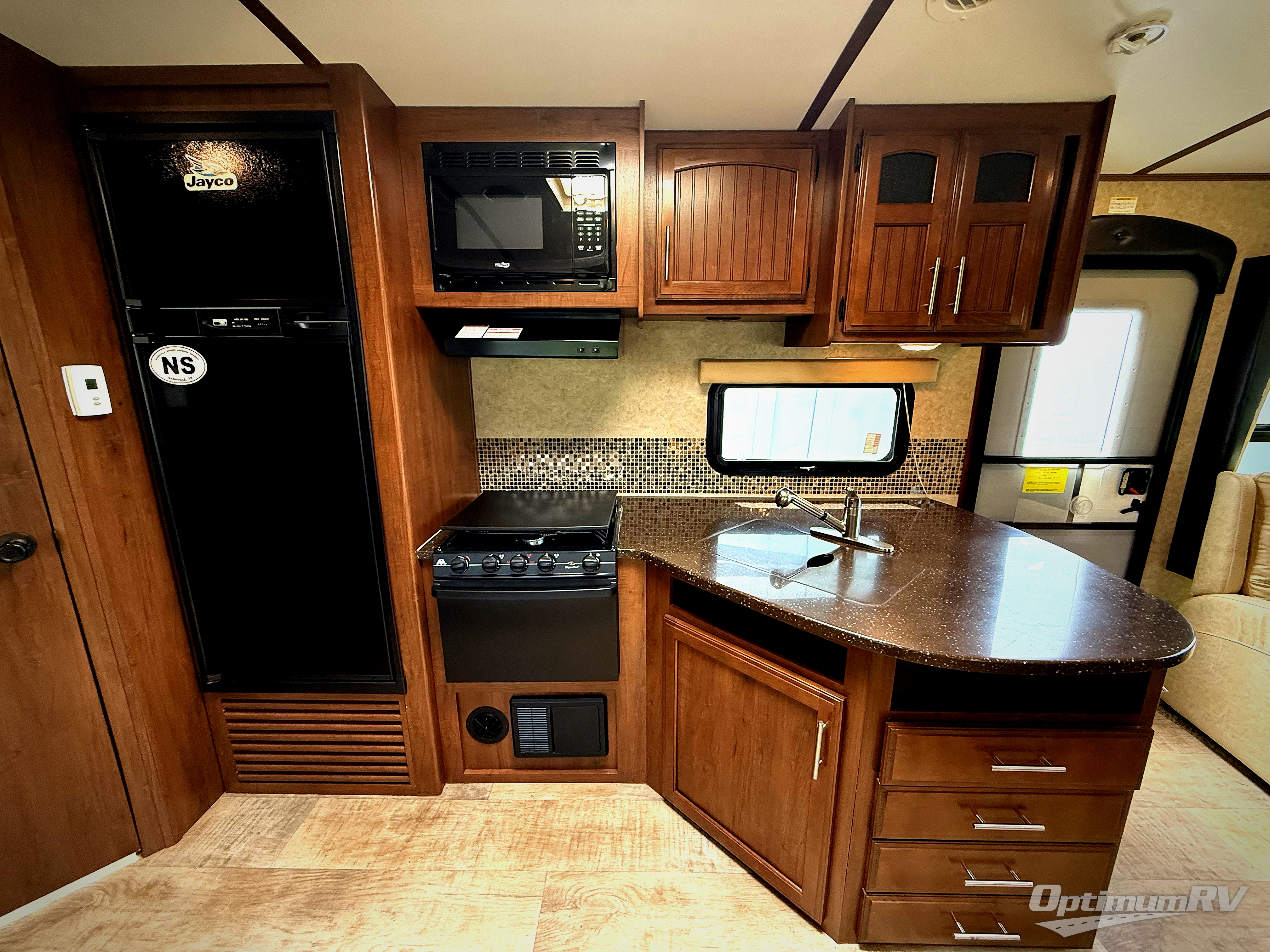 The opposite side of the travel trailer has a angled kitchen sink and countertop, three burner range, microwave, and a refrigerator.