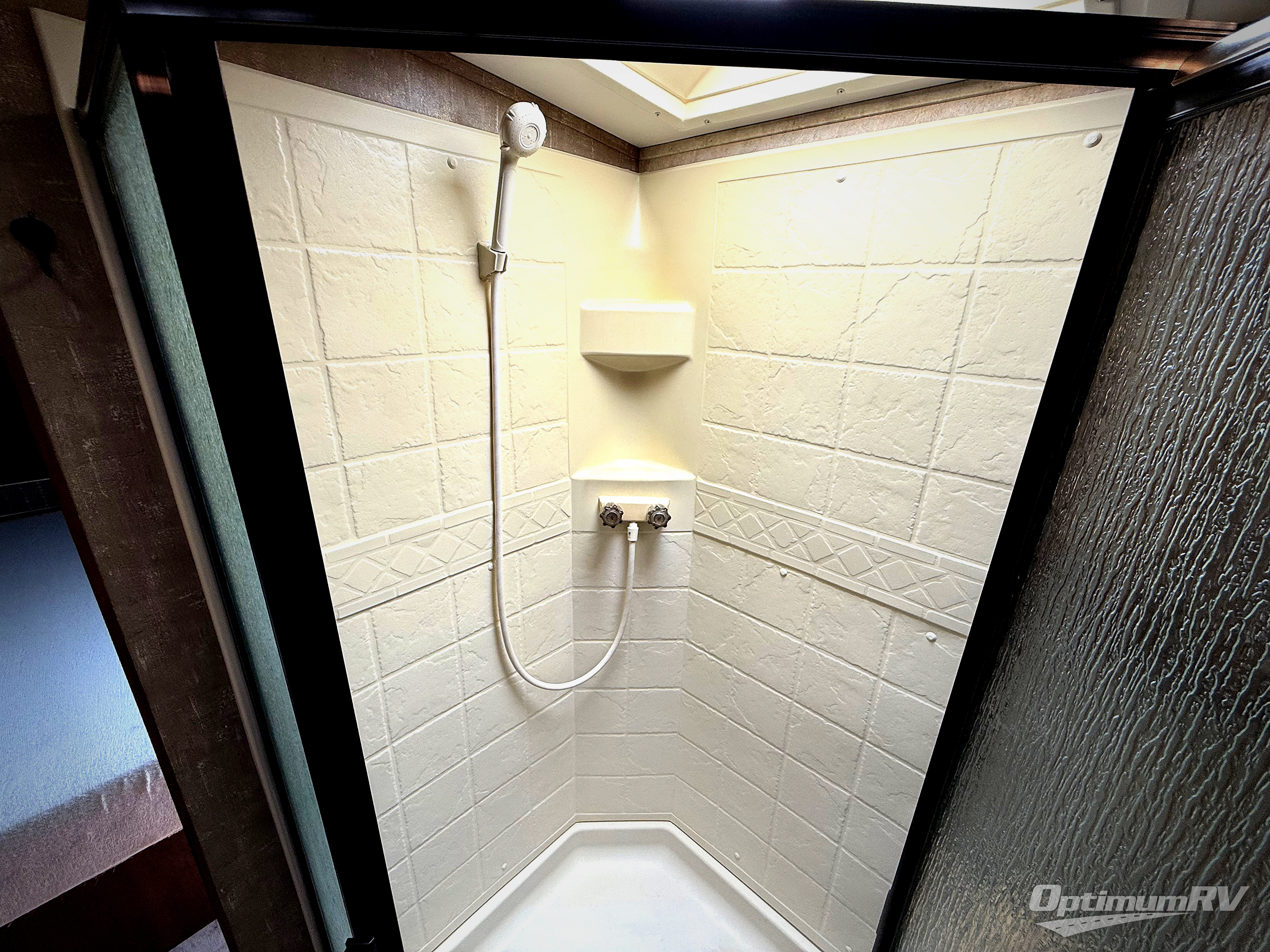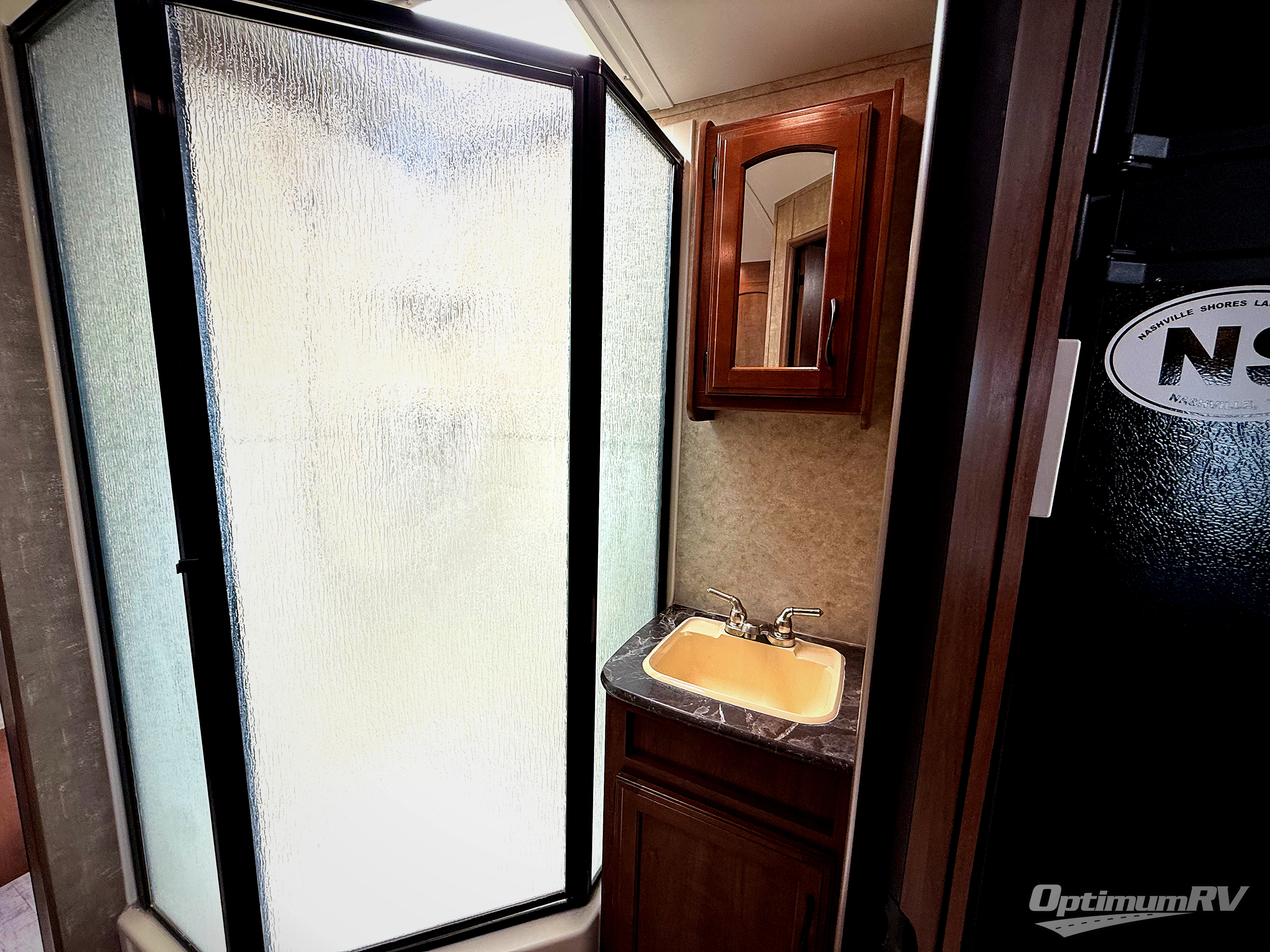 Heading towards the front of the trailer, you walk-though the bathroom. There is a toilet and linen cabinet on one side, and a sink, medicine cabinet, and corner shower on the other.