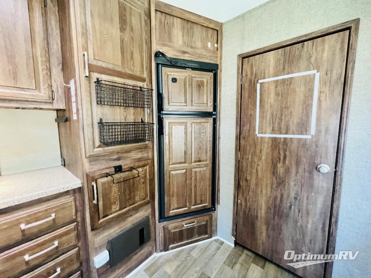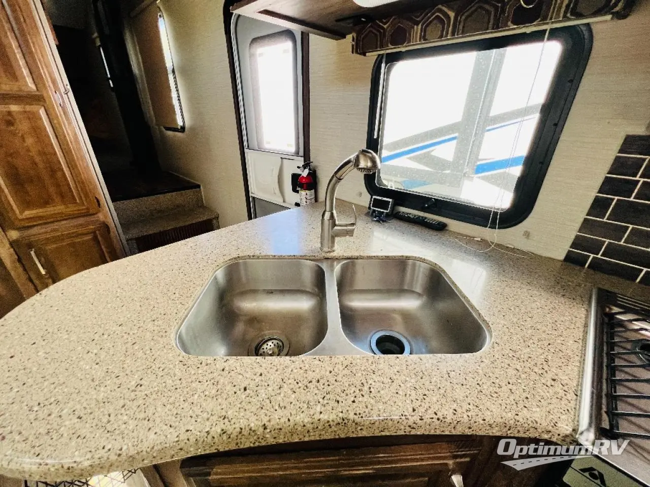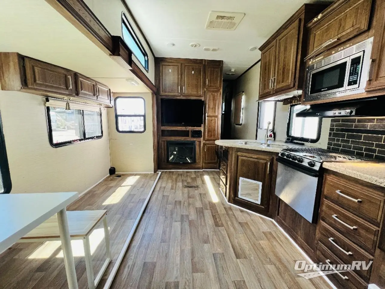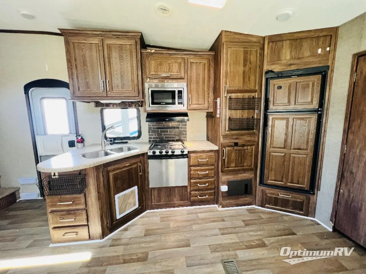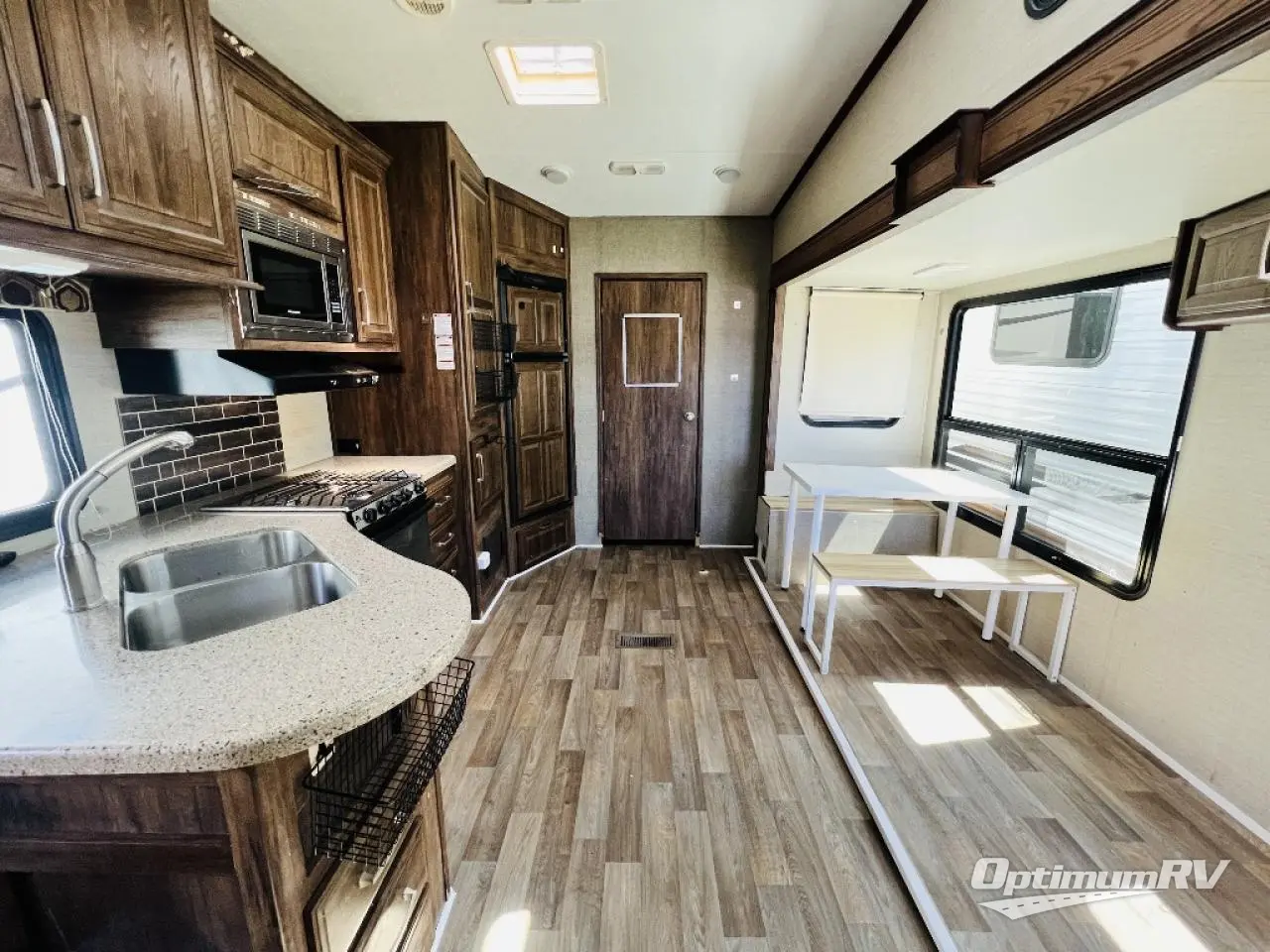 Before checking out the inside of model 330RBK, take a peak at the outdoor kitchen which features a refrigerator, a sink, counter space and storage, a flip-out two burner stove top, and more.