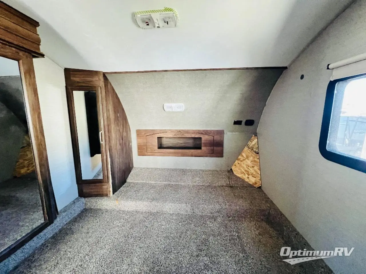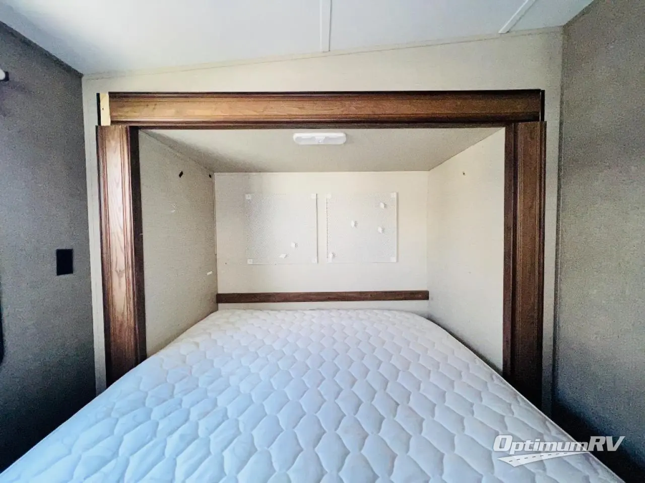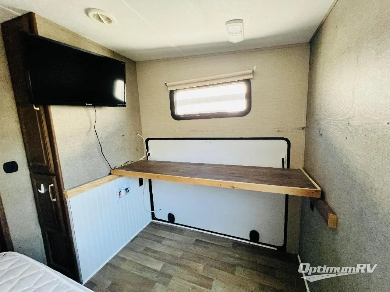 To the right of the entry door take two steps up to a front bedroom and side aisle bath. The bath offers a neo-angle shower, toilet, sink, and a linen cabinet that is part of the bedroom slide which also features a wardrobe. There is a queen size bed, a bedside wardrobe and nightstand, plus overhead storage, and so much more!