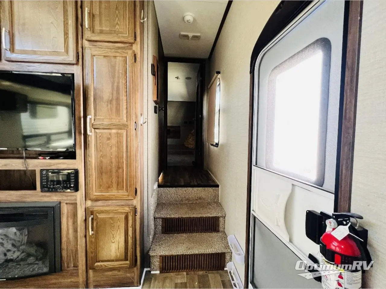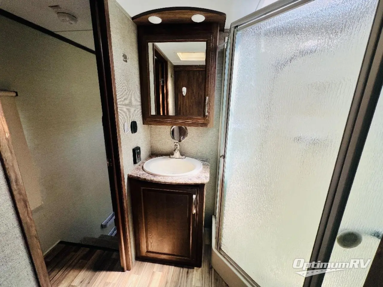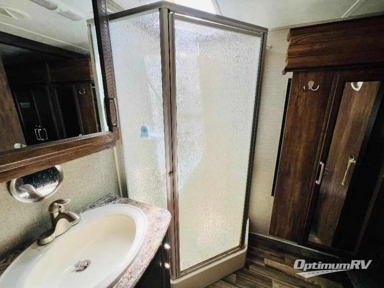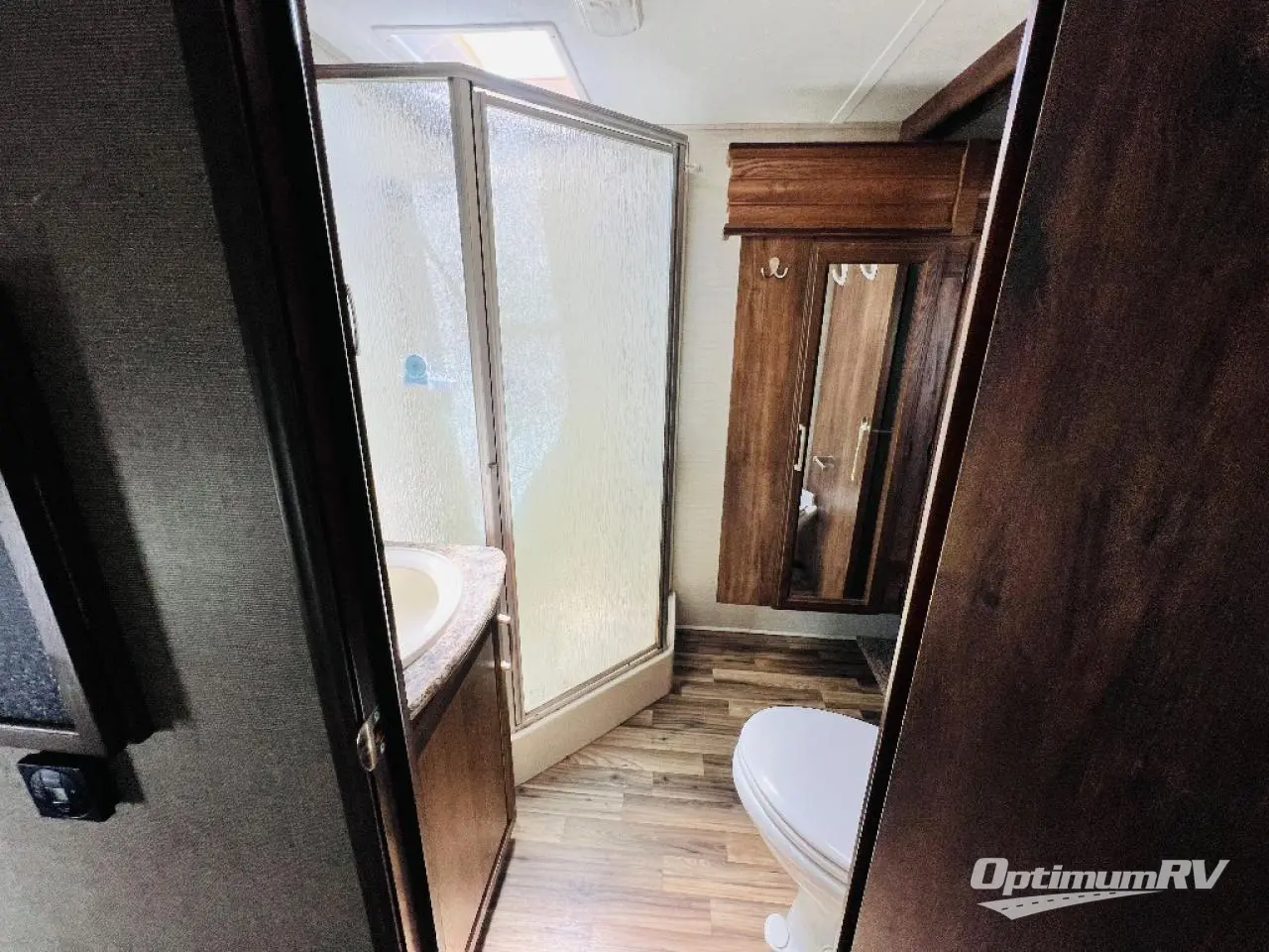 To the right of the entry door take two steps up to a front bedroom and side aisle bath. The bath offers a neo-angle shower, toilet, sink, and a linen cabinet that is part of the bedroom slide which also features a wardrobe. There is a queen size bed, a bedside wardrobe and nightstand, plus overhead storage, and so much more!